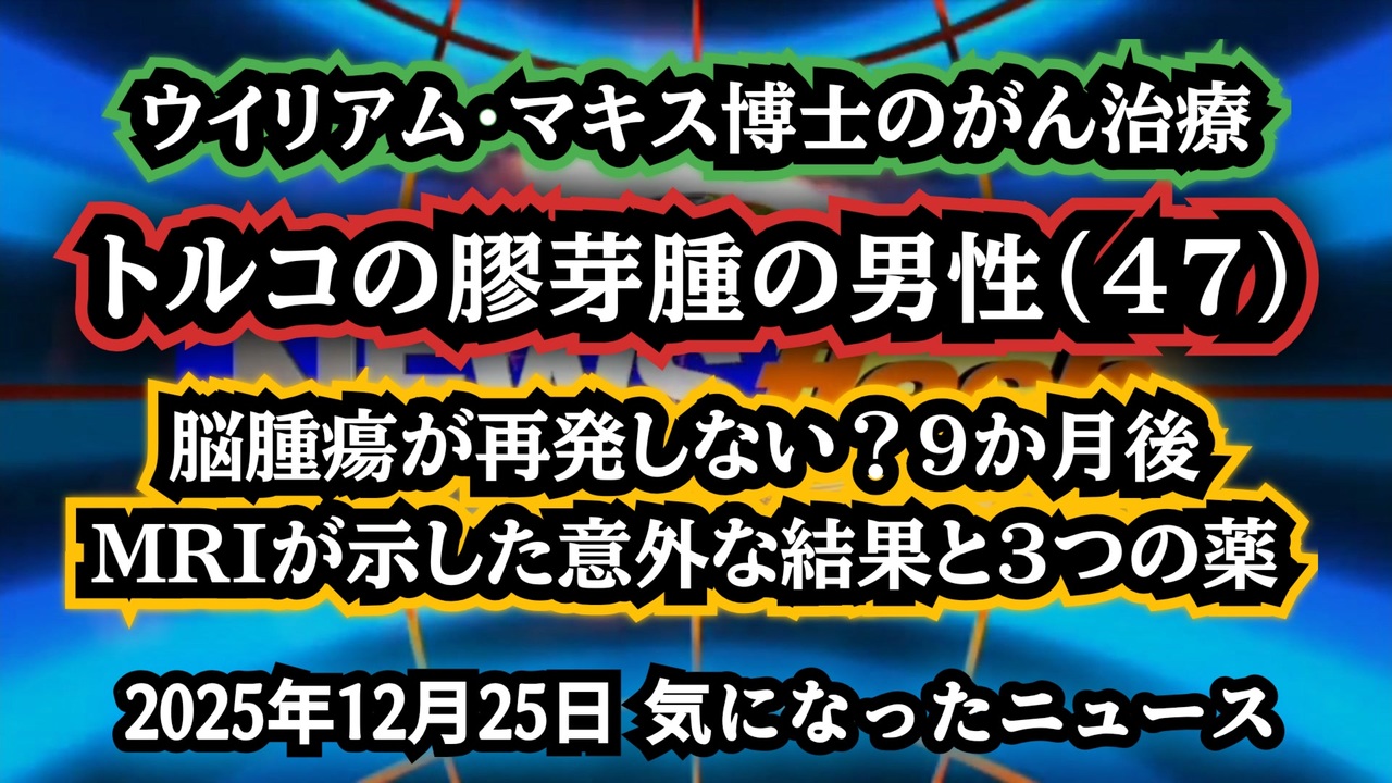 【がん治療】◆トルコの膠芽腫の男性(47)|脳腫瘍が再発しない?9か月後MRIが示した意外な結果と3つの薬【ウイリアム・マキス博士】<br><br>あらすじ<br>膠芽腫は、再発率が極めて高く、治療後も厳しい経過をたどることで知られている。<br>そんな中、標準治療を終えた後、ある選択をした47歳男性の経過が静かに注目を集めている。<br>手術、化学放射線療法、その後の判断。<br>9か月後に示されたMRI結果は、多くの医療関係者や患者に問いを投げかけるものだった。<br>これは『奇跡』なのか、それとも『まだ語られていない可能性』なのか。<br>再発が前提とされてきた病に対し、別の視点から光が当てられ始めている。<br><br>◆今回の台本&詳細<a href="https://keiichiro8140.hatenablog.com/entry/25122444333999" target="_blank" rel="noopener nofollow">https://keiichiro8140.hatenablog.com/entry/25122444333999</a><br><br>◆これまでの動画<a href="https://x.gd/sPXoJ" target="_blank" rel="noopener nofollow">https://x.gd/sPXoJ</a><br><br>◆もしも(BAN)の時のためのマイリンク集<a href="https://lit.link/K-16_News44" target="_blank" rel="noopener nofollow">https://lit.link/K-16_News44</a><br><br>膠芽腫<br>脳腫瘍<br>再発<br>イベルメクチン<br>メベンダゾール<br>フェンベンダゾール<br>MRIクリーン<br>再発しない症例<br>がん治療<br>代替的アプローチ<br>ウイリアム・マキス博士<br><br>ご覧いただきありがとうございます<br>m(_ _)m<br><br>気になったニュース 2025/12/25<br><br />著作権、肖像権に配慮して作成しております。<br><br>◆気になったニュースの台本!?<br>メモ代わりに作った台本をそのままあげてます<br><a href="https://keiichiro8140.hatenablog.com/." target="_blank" rel="noopener nofollow">https://keiichiro8140.hatenablog.com/.</a><br><br><br>ここからはシリーズ紹介<br><br><br>◆ ワクチン解毒・デトックス<br><a href="https://x.gd/fZweg" target="_blank" rel="noopener nofollow">https://x.gd/fZweg</a><br><br>◆ウイリアム・マキス博士のがん治療(イベルメクチン・フェンベンダゾール等)<br><a href="https://x.gd/AtFYS" target="_blank" rel="noopener nofollow">https://x.gd/AtFYS</a><br><br>◆予防接種健康被害救済制度<br><a href="https://x.gd/0xK9x" target="_blank" rel="noopener nofollow">https://x.gd/0xK9x</a><br><br>◆気になったニュース #1501~<br><br>◆ 【ショートver】気になったニュース<br><a href="https://x.gd/7MxXC" target="_blank" rel="noopener nofollow">https://x.gd/7MxXC</a><br><br>◆ 気になったニュース #1001~<br><a href="https://x.gd/Lp8gv" target="_blank" rel="noopener nofollow">https://x.gd/Lp8gv</a><br><br>◆ 気になったニュース #501~<br><a href="https://x.gd/EmbS4" target="_blank" rel="noopener nofollow">https://x.gd/EmbS4</a><br><br>◆ 気になったニュース #1~#500<br><a href="https://x.gd/uPhNb" target="_blank" rel="noopener nofollow">https://x.gd/uPhNb</a><br><br>◆ X(旧Twitter)・テレグラムで気になった情報<br><a href="https://x.gd/YG6FT" target="_blank" rel="noopener nofollow">https://x.gd/YG6FT</a><br><br>◆ 日比谷5万人パレードデ⚪生放送アーカイブ動画<br><a href="https://x.gd/3CHJv" target="_blank" rel="noopener nofollow">https://x.gd/3CHJv</a><br><br>◆日比谷5万人パレード⚪モのマイリスト作ってみました<br><a href="https://nico.ms/mylist/76828848?ref=sp_other" target="_blank" rel="noopener nofollow">https://nico.ms/mylist/76828848?ref=sp_other</a><br><br>◆3.30 令和の百姓⚪⚪<br><a href="https://www.nicovideo.jp/series/511791?ref=garage_share_other" target="_blank" rel="noopener nofollow">https://www.nicovideo.jp/series/511791?ref=garage_share_other</a><br><br>◆ 及川幸久さんの【XNEWS】シリーズ<br><a href="https://x.gd/3k78K" target="_blank" rel="noopener nofollow">https://x.gd/3k78K</a><br><br>◆これまでの動画<a href="https://x.gd/sPXoJ" target="_blank" rel="noopener nofollow">https://x.gd/sPXoJ</a><br><br>◆もしも(BAN)の時のためのマイリンク集<a href="https://lit.link/K-16_News44" target="_blank" rel="noopener nofollow">https://lit.link/K-16_News44</a><br><br>