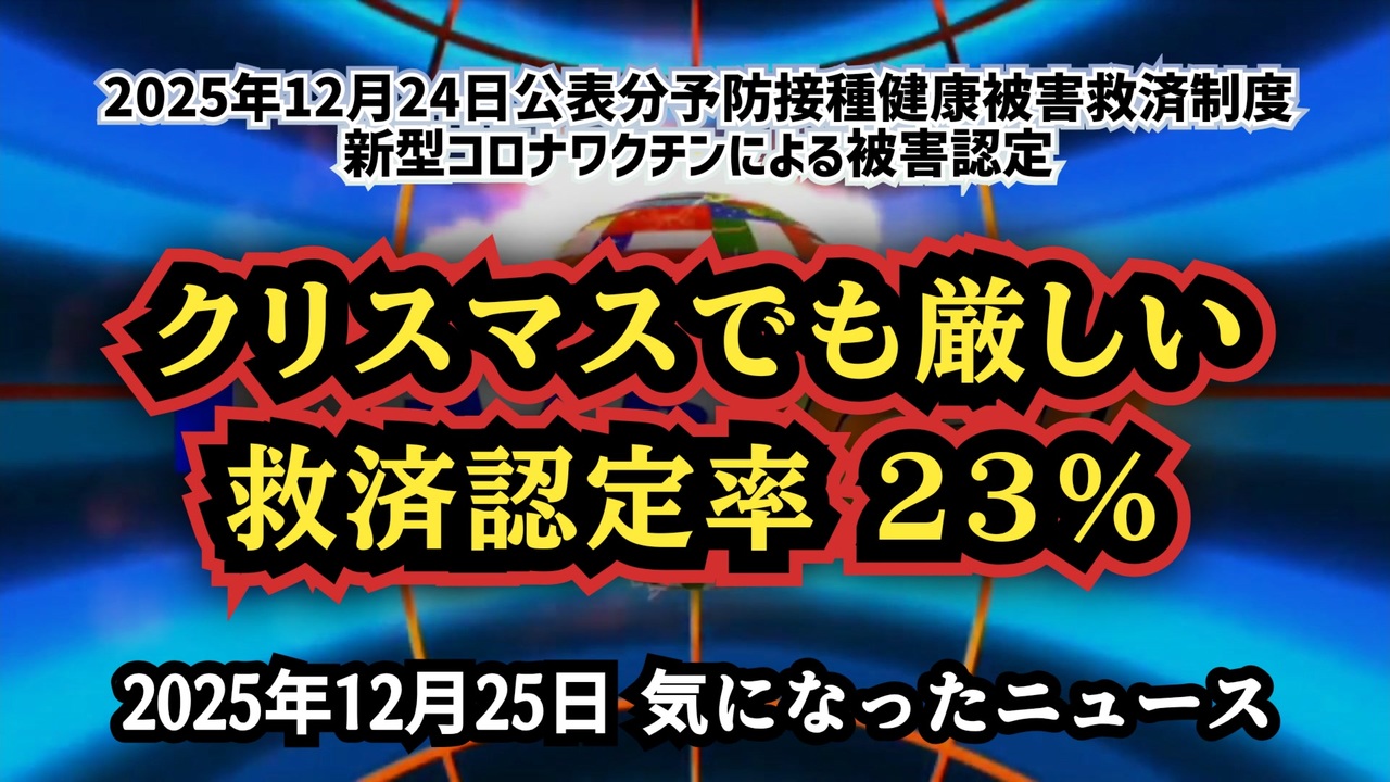 【認定率23%】◆2025年12月24日公表分 新型コロナワクチン•予防接種健康被害救済制度【クリスマスでも厳しい認定率】<br><br>あらすじ<br>2025年12月24日、厚生労働省は新型コロナワクチンによる健康被害救済制度の最新審議結果を公表した。この制度は、ワクチンとの厳密な因果関係を証明しなくても「否定できない」場合に救済対象とする、被害者救済を重視した仕組みである。今回の審議では認定率23%と厳しい判断が下される一方、死亡や心筋炎、自己免疫疾患などの重篤な疾患が公式に認定された。さらに累計データでは、過去48年間の全ワクチン被害を新型コロナワクチン単独で大きく上回るという、前例のない数字が示されている。この事実が意味するものとは何か。数字が静かに語る現実に迫る。<br><br>◆今回の台本&詳細<a href="https://keiichiro8140.hatenablog.com/entry/25122555111" target="_blank" rel="noopener nofollow">https://keiichiro8140.hatenablog.com/entry/25122555111</a><br><br>◆これまでの動画<a href="https://x.gd/sPXoJ" target="_blank" rel="noopener nofollow">https://x.gd/sPXoJ</a><br><br>◆もしも(BAN)の時のためのマイリンク集<a href="https://lit.link/K-16_News44" target="_blank" rel="noopener nofollow">https://lit.link/K-16_News44</a><br><br>認定率23%<br>新型コロナワクチン<br>予防接種健康被害救済制度<br>死亡認定率17%<br>急性大動脈解離<br>心筋炎<br>ワクチン被害<br>疾病障害認定審査会<br>自己免疫疾患<br>健康被害認定9,412件<br>死亡認定1,059件<br><br>ご覧いただきありがとうございます<br>m(_ _)m<br><br>気になったニュース 2025/12/25<br><br />著作権、肖像権に配慮して作成しております。<br><br>◆気になったニュースの台本!?<br>メモ代わりに作った台本をそのままあげてます<br><a href="https://keiichiro8140.hatenablog.com/." target="_blank" rel="noopener nofollow">https://keiichiro8140.hatenablog.com/.</a><br><br><br>ここからはシリーズ紹介<br><br><br>◆ ワクチン解毒・デトックス<br><a href="https://x.gd/fZweg" target="_blank" rel="noopener nofollow">https://x.gd/fZweg</a><br><br>◆ウイリアム・マキス博士のがん治療(イベルメクチン・フェンベンダゾール等)<br><a href="https://x.gd/AtFYS" target="_blank" rel="noopener nofollow">https://x.gd/AtFYS</a><br><br>◆予防接種健康被害救済制度<br><a href="https://x.gd/0xK9x" target="_blank" rel="noopener nofollow">https://x.gd/0xK9x</a><br><br>◆気になったニュース #1501~<br><br>◆ 【ショートver】気になったニュース<br><a href="https://x.gd/7MxXC" target="_blank" rel="noopener nofollow">https://x.gd/7MxXC</a><br><br>◆ 気になったニュース #1001~<br><a href="https://x.gd/Lp8gv" target="_blank" rel="noopener nofollow">https://x.gd/Lp8gv</a><br><br>◆ 気になったニュース #501~<br><a href="https://x.gd/EmbS4" target="_blank" rel="noopener nofollow">https://x.gd/EmbS4</a><br><br>◆ 気になったニュース #1~#500<br><a href="https://x.gd/uPhNb" target="_blank" rel="noopener nofollow">https://x.gd/uPhNb</a><br><br>◆ X(旧Twitter)・テレグラムで気になった情報<br><a href="https://x.gd/YG6FT" target="_blank" rel="noopener nofollow">https://x.gd/YG6FT</a><br><br>◆ 日比谷5万人パレードデ⚪生放送アーカイブ動画<br><a href="https://x.gd/3CHJv" target="_blank" rel="noopener nofollow">https://x.gd/3CHJv</a><br><br>◆日比谷5万人パレード⚪モのマイリスト作ってみました<br><a href="https://nico.ms/mylist/76828848?ref=sp_other" target="_blank" rel="noopener nofollow">https://nico.ms/mylist/76828848?ref=sp_other</a><br><br>◆3.30 令和の百姓⚪⚪<br><a href="https://www.nicovideo.jp/series/511791?ref=garage_share_other" target="_blank" rel="noopener nofollow">https://www.nicovideo.jp/series/511791?ref=garage_share_other</a><br><br>◆ 及川幸久さんの【XNEWS】シリーズ<br><a href="https://x.gd/3k78K" target="_blank" rel="noopener nofollow">https://x.gd/3k78K</a><br><br>◆これまでの動画<a href="https://x.gd/sPXoJ" target="_blank" rel="noopener nofollow">https://x.gd/sPXoJ</a><br><br>◆もしも(BAN)の時のためのマイリンク集<a href="https://lit.link/K-16_News44" target="_blank" rel="noopener nofollow">https://lit.link/K-16_News44</a><br><br>