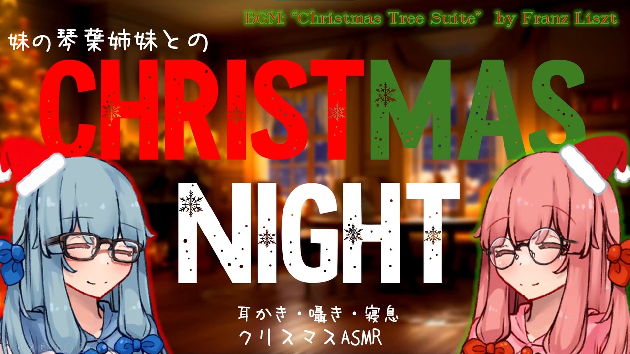 クリスマスの晩に、リストのクリスマス・ツリーを聴きながら妹の琴葉姉妹に耳かきしてもらって添い寝するASMR動画です。<br>全パート両耳用となっています。<br>---------------------------------------------------------<br>ASMROID第六作目です!<br>何とか間に合いました、クリスマス回です。今回はフランツ・リストの『クリスマス・ツリー』が流れてホリデームード満載の中、<br>琴葉姉妹に耳を癒される動画です。ピアノが後半結構盛り上がるので今回は建前上は入眠用ではなく、クリスマス用ASMRとさせていただいております。<br>クリスマスが一般的に最も盛大に祝われるのが24日の夜だということを諸々の製作が終わった後に知りました。多少違和感があるかもしれませんがカルチャーショックを楽しんでください。<br>今作をもってしばらく動画作成は中止します。復帰後は同じ姉妹ちゃんによるいわば第二部の製作を予定しておりますので、しばらくかかりますがお待ちください。<br>---------------------------------------------------------<br>使用ソフト:<br>A.I.Voice2 琴葉姉妹<br>A.I.Voice 琴葉姉妹・囁<br>YMM4 <br>AoiSupport<br><br>立ち絵:ナごと様<br><br>BGM:『クリスマス・ツリー』/フランツ・リスト<br><br>使用素材:<br>琴葉姉妹 exVoice vol.1,vol.4<br>DIMENSHOP素材部様<br>効果音ラボ様<br>音人様<br>Sound Dino様<br>いらすとや様<br><br>Special Thanks:<br>ASMROID制作広場の皆様<br>マァッチョポンョプ様