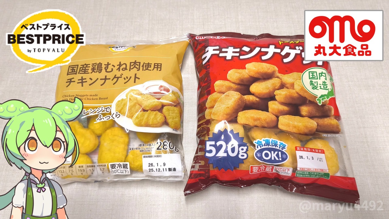 トップバリュと丸大食品のチキンナゲットを食べ比べてみました。<br><br><br><br>【関連動画】<br>チキンナゲット食べ比べ「トップバリュ・D-PRICE・日本ハム」<br><a href="https://www.nicovideo.jp/watch/sm43819312" target="_blank" rel="noopener nofollow">https://www.nicovideo.jp/watch/sm43819312</a><br><br>【参考】<br>チキンナゲット※本体価格278円/280g(トップバリュ)<br><a href="https://www.topvalu.net/items/detail/4549414696608/" target="_blank" rel="noopener nofollow">https://www.topvalu.net/items/detail/4549414696608/</a><br>徳用チキンナゲット(丸大食品)<br><a href="https://www.marudai.jp/CGI/products/item/detail.cgi?itm_cd=00861" target="_blank" rel="noopener nofollow">https://www.marudai.jp/CGI/products/item/detail.cgi?itm_cd=00861</a><br>伊藤ハム米久フーズ株式会社<br><a href="https://www.itoham-yonekyu-holdings.com/foods/" target="_blank" rel="noopener nofollow">https://www.itoham-yonekyu-holdings.com/foods/</a><br>伊藤ハム米久プラント株式会社<br><a href="https://www.itoham-yonekyu-holdings.com/plant/" target="_blank" rel="noopener nofollow">https://www.itoham-yonekyu-holdings.com/plant/</a><br><br>【使用した素材】(※敬称略) <br>(合成音声)VOICEVOX/ずんだもん/四国めたん<br><a href="https://voicevox.hiroshiba.jp/" target="_blank" rel="noopener nofollow">https://voicevox.hiroshiba.jp/</a> <br>(立ち絵)坂本アヒル<br> <a href="https://seiga.nicovideo.jp/seiga/im10788496" target="_blank" rel="noopener nofollow">https://seiga.nicovideo.jp/seiga/im10788496</a><br>(楽曲)甘茶の音楽工房/「楽しい麦畑」「フルーツパフェ」「お城の舞踏会」<br><a href="https://amachamusic.chagasi.com/" target="_blank" rel="noopener nofollow">https://amachamusic.chagasi.com/</a>