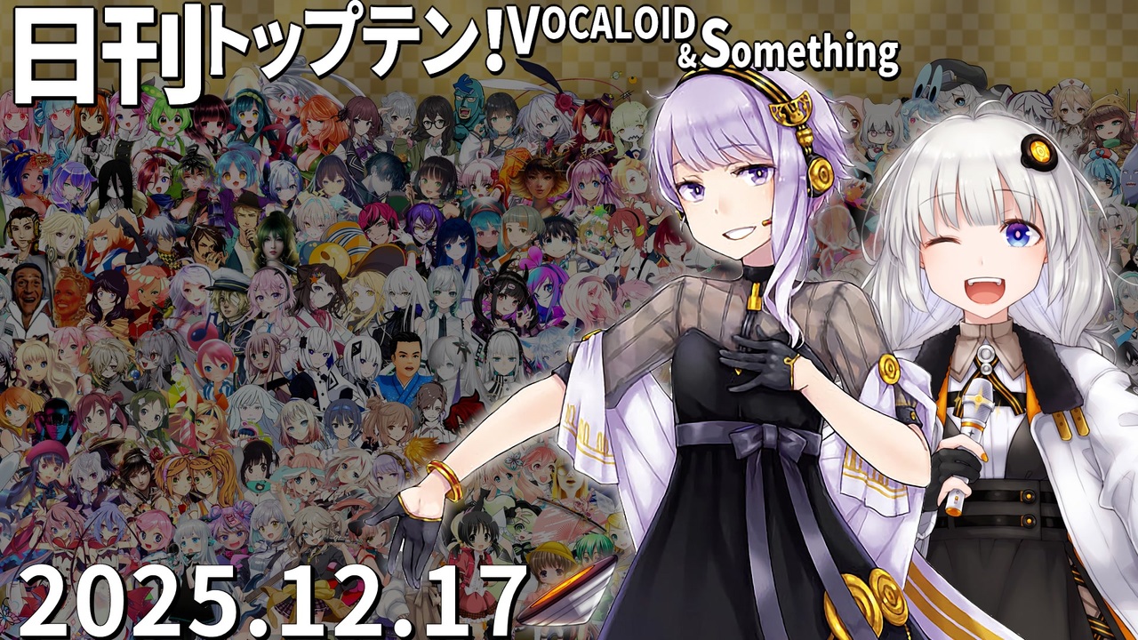 前日(12/16)←<a href="https://www.nicovideo.jp/watch/sm45759028" class="watch">sm45759028</a> <a href="https://www.nicovideo.jp/watch/sm45769543" class="watch">sm45769543</a>→翌日(12/18)<br>★「kiite」のプレイリストも見てね!<a href="https://kiite.jp/user/AIST_playlist_bot" target="_blank" rel="noopener nofollow">https://kiite.jp/user/AIST_playlist_bot</a><br>★チャプター<br>昨日1位<a href="#" class="seekTime" data-seekTime="0:00" onclick="seekNicoPlayer('#0:00'); return false;">#0:00</a> TOP10<a href="#" class="seekTime" data-seekTime="0:36" onclick="seekNicoPlayer('#0:36'); return false;">#0:36</a> 1年前<a href="#" class="seekTime" data-seekTime="2:56" onclick="seekNicoPlayer('#2:56'); return false;">#2:56</a> TOP3<a href="#" class="seekTime" data-seekTime="3:24" onclick="seekNicoPlayer('#3:24'); return false;">#3:24</a> 10年前<a href="#" class="seekTime" data-seekTime="5:01" onclick="seekNicoPlayer('#5:01'); return false;">#5:01</a> PICKUP<a href="#" class="seekTime" data-seekTime="5:29" onclick="seekNicoPlayer('#5:29'); return false;">#5:29</a> <br><br>★トップテン<br>10:<a href="https://www.nicovideo.jp/watch/sm45720359" class="watch">sm45720359</a> 9:<a href="https://www.nicovideo.jp/watch/sm45712577" class="watch">sm45712577</a> 8:<a href="https://www.nicovideo.jp/watch/sm45719070" class="watch">sm45719070</a> 7:<a href="https://www.nicovideo.jp/watch/sm45719741" class="watch">sm45719741</a> <br>6:<a href="https://www.nicovideo.jp/watch/sm45719720" class="watch">sm45719720</a> 5:<a href="https://www.nicovideo.jp/watch/sm45719818" class="watch">sm45719818</a> 4:<a href="https://www.nicovideo.jp/watch/sm45730164" class="watch">sm45730164</a> 3:<a href="https://www.nicovideo.jp/watch/sm45732764" class="watch">sm45732764</a> 2:<a href="https://www.nicovideo.jp/watch/sm45730211" class="watch">sm45730211</a> 1:<a href="https://www.nicovideo.jp/watch/sm45730957" class="watch">sm45730957</a> <br><br>★ピックアップ(B~Dは超新着枠)<br>B:<a href="https://www.nicovideo.jp/watch/sm45733380" class="watch">sm45733380</a> C:<a href="https://www.nicovideo.jp/watch/sm45733328" class="watch">sm45733328</a> D:<a href="https://www.nicovideo.jp/watch/sm45732606" class="watch">sm45732606</a> E:<a href="https://www.nicovideo.jp/watch/sm45715943" class="watch">sm45715943</a> F:<a href="https://www.nicovideo.jp/watch/sm45723272" class="watch">sm45723272</a> G:<a href="https://www.nicovideo.jp/watch/sm45710480" class="watch">sm45710480</a> <br><br>★プレイバック <br>A(1年前):<a href="https://www.nicovideo.jp/watch/sm44433274" class="watch">sm44433274</a> 十(10年前):<a href="https://www.nicovideo.jp/watch/sm27813448" class="watch">sm27813448</a> 前日の第1位: <a href="https://www.nicovideo.jp/watch/sm45723665" class="watch">sm45723665</a>(結月ゆかり・紲星あかり)<br><br>☆集計対象:2025/12/10~17 5時投稿の作品(12/17 5時集計)<br>★計算式:再生×1+コメント×最大12+いいね!×20+マイリスト×11<br>☆プレイリスト:<u><a href="https://nikkantop10.hatenablog.com/entry/ar20251217" target="_blank" rel="noopener nofollow">https://nikkantop10.hatenablog.com/entry/ar20251217</a></u> 、 <a href="https://www.nicovideo.jp/mylist/49271984" target="_blank" rel="noopener">mylist/49271984</a> <br>★1年前トップテン:<a href="https://www.nicovideo.jp/watch/sm44442450" class="watch">sm44442450</a><br />★日刊トップテン動画一覧マイリスト:<a href="https://www.nicovideo.jp/mylist/47849908" target="_blank" rel="noopener">mylist/47849908</a><br>☆ルールや計算式の詳細:<a href="https://nikkantop10-sub.hatenablog.com/entry/top10_rule" target="_blank" rel="noopener nofollow">https://nikkantop10-sub.hatenablog.com/entry/top10_rule</a><br><span style="color: #262626;">★K!!te Playlist LINK!:<a href="https://kiite.jp/user/AIST_playlist_bot" target="_blank" rel="noopener nofollow">https://kiite.jp/user/AIST_playlist_bot</a><br>☆Twitter:<a href="https://twitter.com/VOCALO_NEWRANK" target="_blank" rel="noopener nofollow">https://twitter.com/VOCALO_NEWRANK</a><br>★Thread:<a href="https://www.threads.net/@lukanan_p" target="_blank" rel="noopener nofollow">https://www.threads.net/@lukanan_p</a></span><br><br><span style="color: #0000ff;"><strong>◆今後の動画投稿イベント情報</strong></span><br>2025/12/29~31 <strong>先端映像音楽表現投稿祭</strong> <a href="https://twipla.jp/events/678401" target="_blank" rel="noopener nofollow">https://twipla.jp/events/678401</a><br>2026/1/1~4 <strong>ボカロサビ投稿祭2026 </strong><a href="https://twipla.jp/events/705936" target="_blank" rel="noopener nofollow">https://twipla.jp/events/705936</a> ※既存曲は新規投稿で参加可<br>2026/1/10~12 <strong>ポストロック投稿祭 </strong><a href="https://twipla.jp/events/694939" target="_blank" rel="noopener nofollow">https://twipla.jp/events/694939</a>