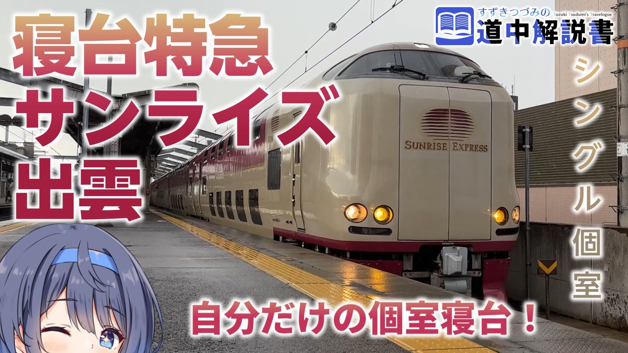 <span style="font-size: 16px;"><strong>自分だけの個室寝台で12時間!</strong></span><br><br>東京駅から出雲市駅まで12時間、寝台特急「サンライズ出雲」号のご紹介です!<br>自分だけの個室寝台のある特別感を味わってきました!<br><br>X(Twitter): <a href="https://x.com/AyuToise" target="_blank" rel="noopener nofollow">https://x.com/AyuToise</a> <br>YouTube: <a href="https://www.youtube.com/@AyuToise" target="_blank" rel="noopener nofollow">https://www.youtube.com/@AyuToise</a><br><br>【出演】 <br>すずきつづみ (CeVIO AI) <br><br>【立ち絵】 <br>pikao 様 (すずきつづみ) <br><a href="https://seiga.nicovideo.jp/seiga/im11076184" target="_blank" rel="noopener nofollow">https://seiga.nicovideo.jp/seiga/im11076184</a> <br><br>【BGM】 <br>騒音のない世界(beco) 様 <br><a href="https://noiselessworld.net/" target="_blank" rel="noopener nofollow">https://noiselessworld.net/</a> <br><br>【紹介した交通機関】 <br>サンライズ出雲(JR西日本・東日本・東海)<br><br>【地図素材】 <br>出典:国土地理院ウェブサイト(<a href="https://maps.gsi.go.jp/" target="_blank" rel="noopener nofollow">https://maps.gsi.go.jp/</a> )を基に、あゆとす本人が作成 <br><br>【航空写真】 <br>出典:国土地理院ウェブサイト<br><br>【特記していない素材】 <br>特記していない素材はあゆとすが撮影・作成したものです。 <br><br>※動画内の情報は十分精査しておりますが、誤りを含む場合があります。 <br>(すずきつづみの道中解説書 #18)<br>