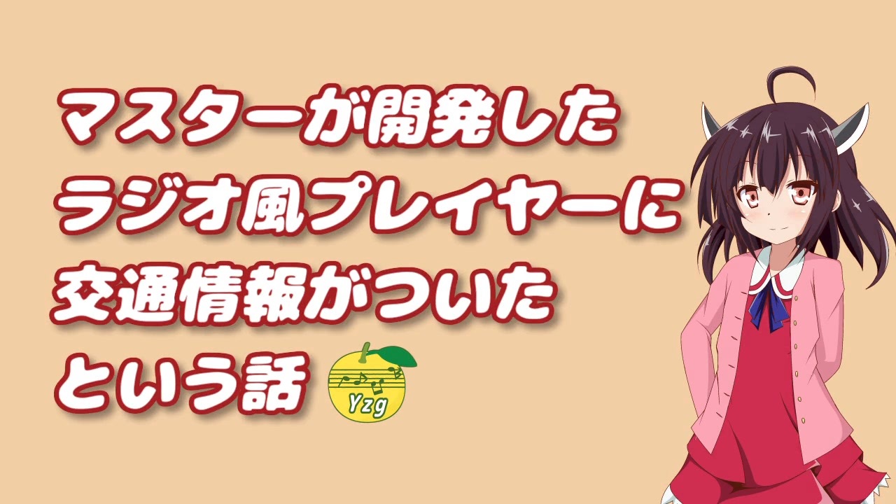 ゆずごしょうです。<br><br>前回は多くの反響、ありがとうございました。<br><br>「ラジオ風プレイヤー」はその後も開発を続け、<br>この度「交通情報」機能を追加しましたので再度ご紹介いたします。<br><br>◇お借りした作品<br>・東北きりたん立ち絵:夜刀 様 / <a href="https://seiga.nicovideo.jp/seiga/im10273157" target="_blank" rel="noopener">im10273157</a><br>・シーンチェンジ:hikarururu 様 / <a href="https://commons.nicovideo.jp/works/nc361381" target="_blank" rel="noopener">nc361381</a><br> EMIT 様 / <a href="https://commons.nicovideo.jp/works/nc414391" target="_blank" rel="noopener">nc414391</a><br><br>◇おすすめの交通情報BGM(各自DLしてください)<br>Message-生ギターVer-:hitoshi 様<br><a href="https://www.senses-circuit.com/sounds/bgm/message-guitarver/" target="_blank" rel="noopener nofollow">https://www.senses-circuit.com/sounds/bgm/message-guitarver/</a><br>Traffic Stream:TECHNOTRAIN 様 / <a href="https://commons.nicovideo.jp/works/nc294385" target="_blank" rel="noopener">nc294385</a><br><a href="https://dova-s.jp/bgm/play18151.html" target="_blank" rel="noopener nofollow">https://dova-s.jp/bgm/play18151.html</a><br>Traffic News / 田中芳典 様<br><a href="https://dova-s.jp/bgm/play12390.html" target="_blank" rel="noopener nofollow">https://dova-s.jp/bgm/play12390.html</a><br><br>語り:東北きりたん(VOICEPEAK)<br><br>他に歌っていただいた曲集 <a href="https://www.nicovideo.jp/mylist/74426245" target="_blank" rel="noopener">mylist/74426245</a> <a href="https://www.nicovideo.jp/mylist/77779798" target="_blank" rel="noopener">mylist/77779798</a> <br><br>MITライセンスで公開しています。ご自由にお使いください。<br><a href="https://github.com/Yuzugosho92/RadioPlayer/releases" target="_blank" rel="noopener nofollow">https://github.com/Yuzugosho92/RadioPlayer/releases</a><br /><br>――――――――――――――――――――――――<br><span style="color: #38761d;"><strong>ご視聴ありがとうございます!</strong></span><br>コメント・いいね!など、ご支援をよろしくお願いします!<br><br><span style="color: #38761d;"><strong>◆主な歌声合成カバーシリーズ</strong></span><br>歌謡曲系カバー <a href="https://www.nicovideo.jp/series/8370" target="_blank" rel="noopener">series/8370</a><br>├1990年代歌謡曲カバー<a href="https://www.nicovideo.jp/series/392137" target="_blank" rel="noopener">series/392137</a><br>├1980年代歌謡曲カバー <a href="https://www.nicovideo.jp/series/391877" target="_blank" rel="noopener">series/391877</a><br>└1970年代歌謡曲カバー <a href="https://www.nicovideo.jp/series/391875" target="_blank" rel="noopener">series/391875</a><br>童謡・クラシカ系カバー <a href="https://www.nicovideo.jp/series/42915" target="_blank" rel="noopener">series/42915</a><br>アニソン系カバー <a href="https://www.nicovideo.jp/series/86276" target="_blank" rel="noopener">series/86276</a><br>SWS・NNI系カバー <a href="https://www.nicovideo.jp/series/120266" target="_blank" rel="noopener">series/120266</a><br><br><span style="color: #4a86e8;"><strong>◆オリジナル曲シリーズ</strong></span><br>ソフトウェアシンガー歌唱 <a href="https://www.nicovideo.jp/series/413435" target="_blank" rel="noopener">series/413435</a><br><br><span style="color: #990000;"><strong>◆ラジオ風料理動画シリーズ</strong></span><br>味道楽きりたん <a href="https://www.nicovideo.jp/series/50443" target="_blank" rel="noopener">series/50443</a><br><br><span style="color: #6aa84f;"><strong>◆個人Webページで写真素材も配布しています</strong></span><br><a href="https://yuzugosho.main.jp/yuzugo-photo" target="_blank" rel="noopener nofollow">https://yuzugosho.main.jp/yuzugo-photo</a><br><br><span style="color: #1155cc;"><strong>◆X・BlueSKY・MIXI2</strong></span><br><a href="https://x.com/yuzugosho92" target="_blank" rel="noopener nofollow">https://x.com/yuzugosho92</a><br><a href="https://bsky.app/profile/yuzugosho.bsky.social" target="_blank" rel="noopener nofollow">https://bsky.app/profile/yuzugosho.bsky.social</a> <br><a href="https://mixi.social/@yuzugosho" target="_blank" rel="noopener nofollow">https://mixi.social/@yuzugosho</a>