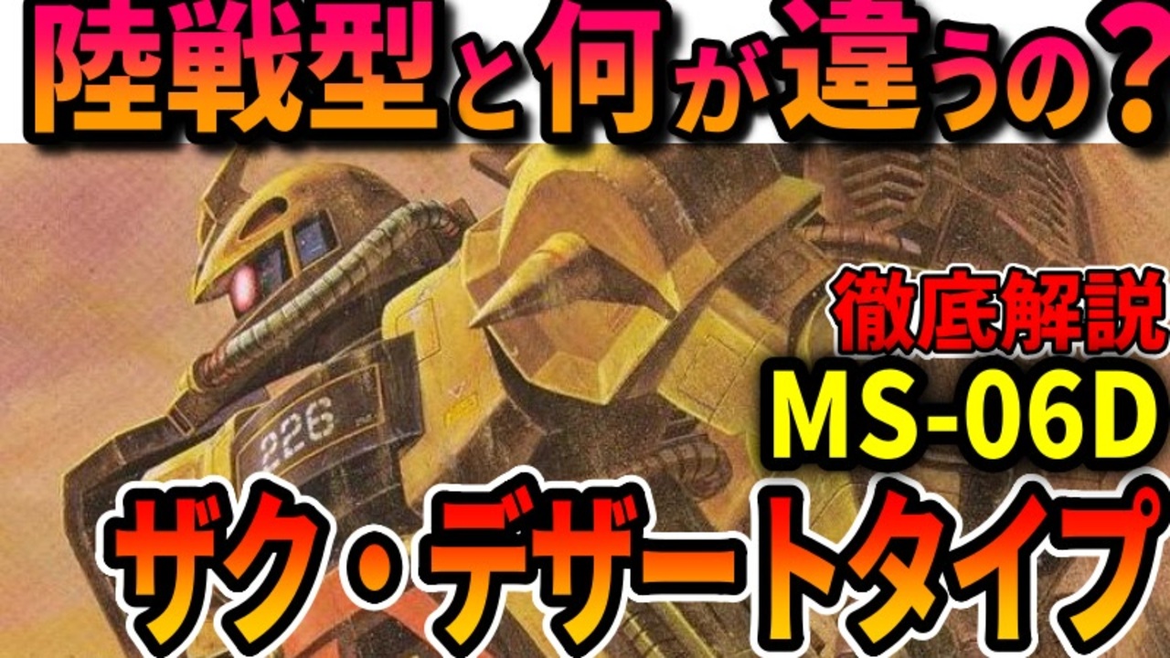 【陸戦型と何が違うの?】ザク・デザートタイプの性能や、凄すぎる活躍などを徹底解説【機動戦士ガンダムMSV】<br><br>機動戦士ガンダムのMSVなどに登場するMS、MS-06Dザク・デザートタイプを解説、考察していきます。<br>今回は解説と考察が同じくらいです。<br><br>そらあんなところに届くわけ無いよなぁと思いました。<br>ゲームみたいに生産ラインや人員を一瞬で変更できるのならともかく・・・。<br><br>現在連載中の小説を見てくださる方はこちら:<br>死に戻り34回目、もう疲れたので私アイドルになります!<br>※初期コンセプトは死に戻ったガルマがシャアを救うにはどうしたら良いのか的な物語を全部女の子でやった感じです。<br>※ここが駄目、もっとこうしたらなどのアドバイスも大歓迎です<br><a href="https://kakuyomu.jp/works/16817330662598051943" target="_blank" rel="noopener nofollow">https://kakuyomu.jp/works/16817330662598051943</a><br><br>質問、などありましたらこちらにも<br><a href="https://twitter.com/@i4S0LHspdgzBTor" target="_blank" rel="noopener nofollow">https://twitter.com/@i4S0LHspdgzBTor</a><br><br>清見元康名義でカクヨム、小説家になろう、たいあっぷなどに投稿しています。<br>もし良ければ応援お願いしますm(_ _)m<br><a href="https://kakuyomu.jp/users/GariD/works" target="_blank" rel="noopener nofollow">https://kakuyomu.jp/users/GariD/works</a><br><br>以前の作品(短編シリアス):<br>転生した厄災の大魔女はやがて聖女と呼ばれる<br><a href="https://ncode.syosetu.com/n0827ha/" target="_blank" rel="noopener nofollow">https://ncode.syosetu.com/n0827ha/</a><br><br>A.I.VOICE:結月ゆかり<br>VOICEVOX:ずんだもん<br><br>使用させていただいたずんだもん:<br>ずんだもん mini Deluxe(立ち絵) ver1.2<br><a href="https://seiga.nicovideo.jp/seiga/im10794509" target="_blank" rel="noopener nofollow">https://seiga.nicovideo.jp/seiga/im10794509</a><br><br>いつも広告、コメントありがとうございます。<br>励みになりますm(_ _)m<br>