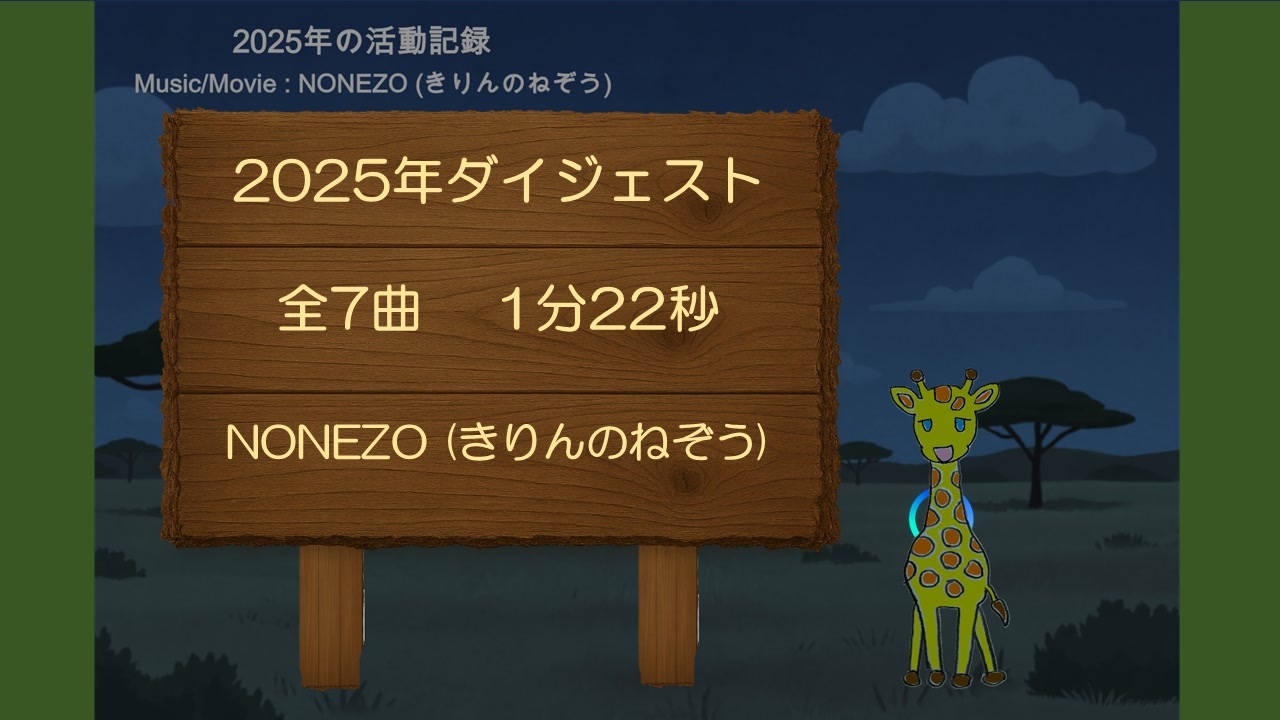#XFD投稿祭2025 参加曲です。<br><br>X: <a href="https://x.com/kirin_nonezo" target="_blank" rel="noopener nofollow">https://x.com/kirin_nonezo</a><br>YouTube: <a href="https://www.youtube.com/@kirin_nonezo" target="_blank" rel="noopener nofollow">https://www.youtube.com/@kirin_nonezo</a><br><br>2025年7月7日にYOUTUBE初投稿。<br>2025年8月22日にニコニコ動画初投稿。<br>気が付けばオリジナル曲の初投稿から約半年。楽しい半年間でした。<br>聴いてくれた皆様。交流してくれた皆様。<br>最大限に感謝しつつ、ボカロP最高~!<br><br>タイトル:2025年のダイジェスト(NONEZO)<br>Vocal: GUMI SV & 重音テト SV<br>Music/Movie: NONEZO (きりんのねぞう)