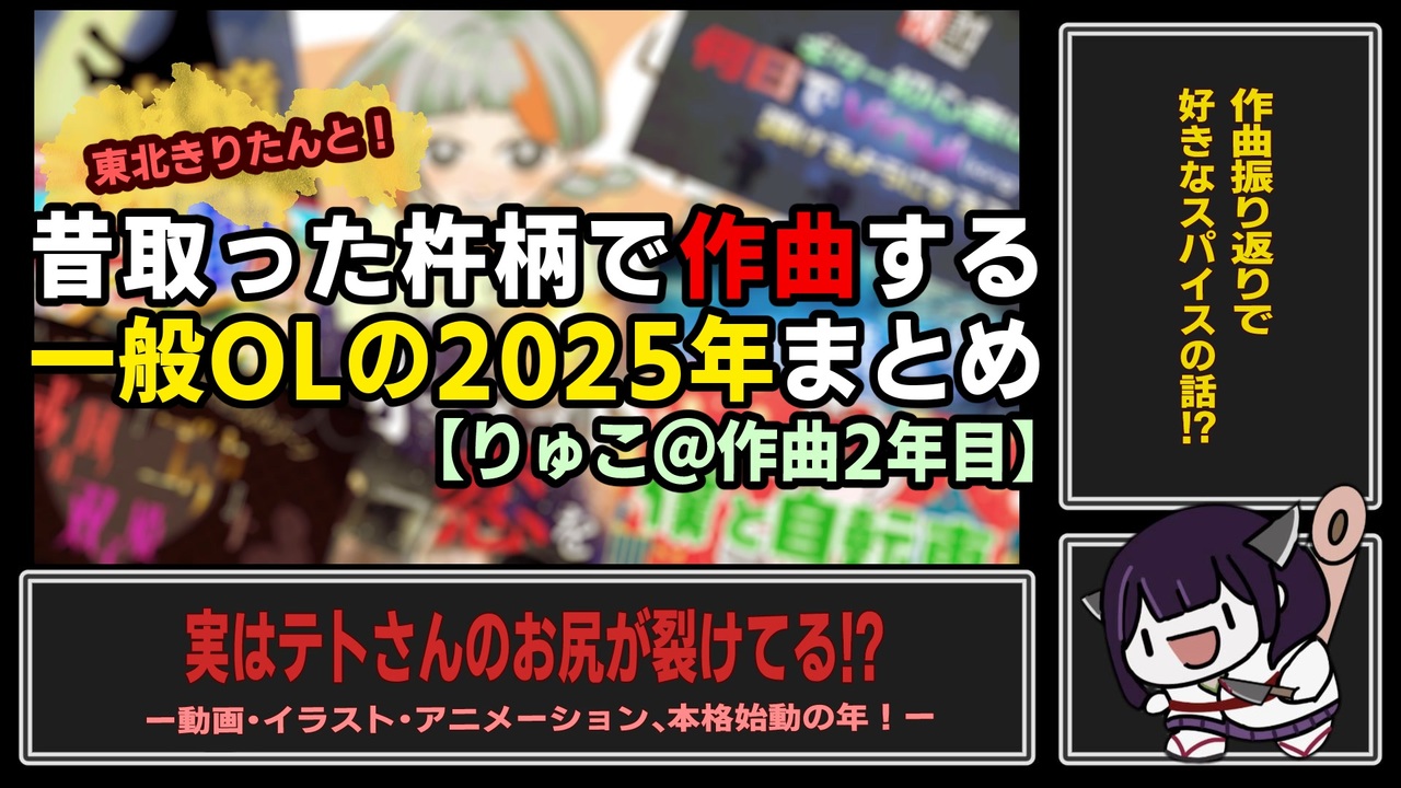 こんにちは。りゅこと申します。<br>今年は、イラストや動画に凝り始めた一年でした。<br>来年もたくさん遊ぶぞ!!!<br><br>▼元動画一覧▼<br>2025.2『オママゴトの恋を』<br><a href="https://www.nicovideo.jp/watch/sm44678362" class="watch">sm44678362</a><br><br>2025.3 『虚構と夢』(音楽ユニットYAKiN曲:YouTube限定)<br><a href="https://www.youtube.com/watch?v=OynlRMMAOPY" target="_blank" rel="noopener nofollow">https://www.youtube.com/watch?v=OynlRMMAOPY</a><br><br>★YAKiNはpopこ〜んrock musicとりゅこの二人組ユニットです。<br> popこ〜んrock music(ぽころ)<br> <a href="https://www.youtube.com/@popcornrockmusic9772" target="_blank" rel="noopener nofollow">https://www.youtube.com/@popcornrockmusic9772</a> <br><br>2025.6 『勤労感謝?エブリディ』<br><a href="https://www.nicovideo.jp/watch/sm45104524" class="watch">sm45104524</a><br><br>2025.6 『ギター初心者がkinggnu に挑戦した結果…』(YouTube限定)<br><a href="https://www.youtube.com/watch?v=RvLsdVIEljk" target="_blank" rel="noopener nofollow">https://www.youtube.com/watch?v=RvLsdVIEljk</a><br><br>2025.9 『或る国のゴウカな双子姫』<br><a href="https://www.nicovideo.jp/watch/sm45436200" class="watch">sm45436200</a><br><br>2025.10 『追憶』(YAKiN)<br><a href="https://www.nicovideo.jp/watch/sm45404905" class="watch">sm45404905</a><br><br>2025.10 『Noisy URBIT』 (YAKiN:YouTube限定)<br><a href="https://www.youtube.com/watch?v=Q1aOVCiqHH8" target="_blank" rel="noopener nofollow">https://www.youtube.com/watch?v=Q1aOVCiqHH8</a><br><br>2025.11 『青春モラトリアム』<br><a href="https://www.nicovideo.jp/watch/sm45577432" class="watch">sm45577432</a><br><br>2025.11 『僕と自転車』<br><a href="https://www.nicovideo.jp/watch/sm45661642" class="watch">sm45661642</a><br><br>2025.11 『さよならの歌』<br><a href="https://www.nicovideo.jp/watch/sm45668732" class="watch">sm45668732</a><br><br>2025.12 『クリスマスって、知ってる?』(YAKiN:YouTube限定)<br><a href="https://www.youtube.com/watch?v=RJtKWQzOfqA" target="_blank" rel="noopener nofollow">https://www.youtube.com/watch?v=RJtKWQzOfqA</a>