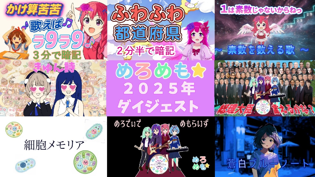 2025年のダイジェスト版です<br><br>もし興味が湧いた曲があったら本編もぜひ観てみてください~🌟<br><br>Xでの告知ポスト<br><a href="https://x.com/melomemo_exclam/status/2004870039863001138" target="_blank" rel="noopener nofollow">https://x.com/melomemo_exclam/status/2004870039863001138</a><br>感想もらえたらうれしいです<br><br>かけ算苦苦 ~歌えばラ9ラ9<br><a href="https://www.nicovideo.jp/watch/sm45273154" class="watch">sm45273154</a><br><br>ふわふわ都道府県<br><a href="https://www.nicovideo.jp/watch/sm45314275" class="watch">sm45314275</a><br><br>1は素数じゃないからね ~素数を数える歌<br><a href="https://www.nicovideo.jp/watch/sm45313396" class="watch">sm45313396</a><br><br>総理大臣言えるかな? ~アイム総理<br><a href="https://www.nicovideo.jp/watch/sm45604636" class="watch">sm45604636</a><br><br>きゅん詩<br><a href="https://www.nicovideo.jp/watch/sm45676883" class="watch">sm45676883</a><br><br>細胞メモリア<br><a href="https://www.nicovideo.jp/watch/so45521295" class="watch">so45521295</a><br><br>めろでぃでめもらいず<br><a href="https://www.nicovideo.jp/watch/sm45682380" class="watch">sm45682380</a><br><br>蒼白ブルーノート<br><a href="https://www.nicovideo.jp/watch/sm45698924" class="watch">sm45698924</a><br><br>XFD投稿祭2025参加作品<br />X<br><a href="https://x.com/melomemo_exclam" target="_blank" rel="noopener nofollow">https://x.com/melomemo_exclam</a><br><br>YouTube<br><a href="https://www.youtube.com/@melodymemorize" target="_blank" rel="noopener nofollow">https://www.youtube.com/@melodymemorize</a>