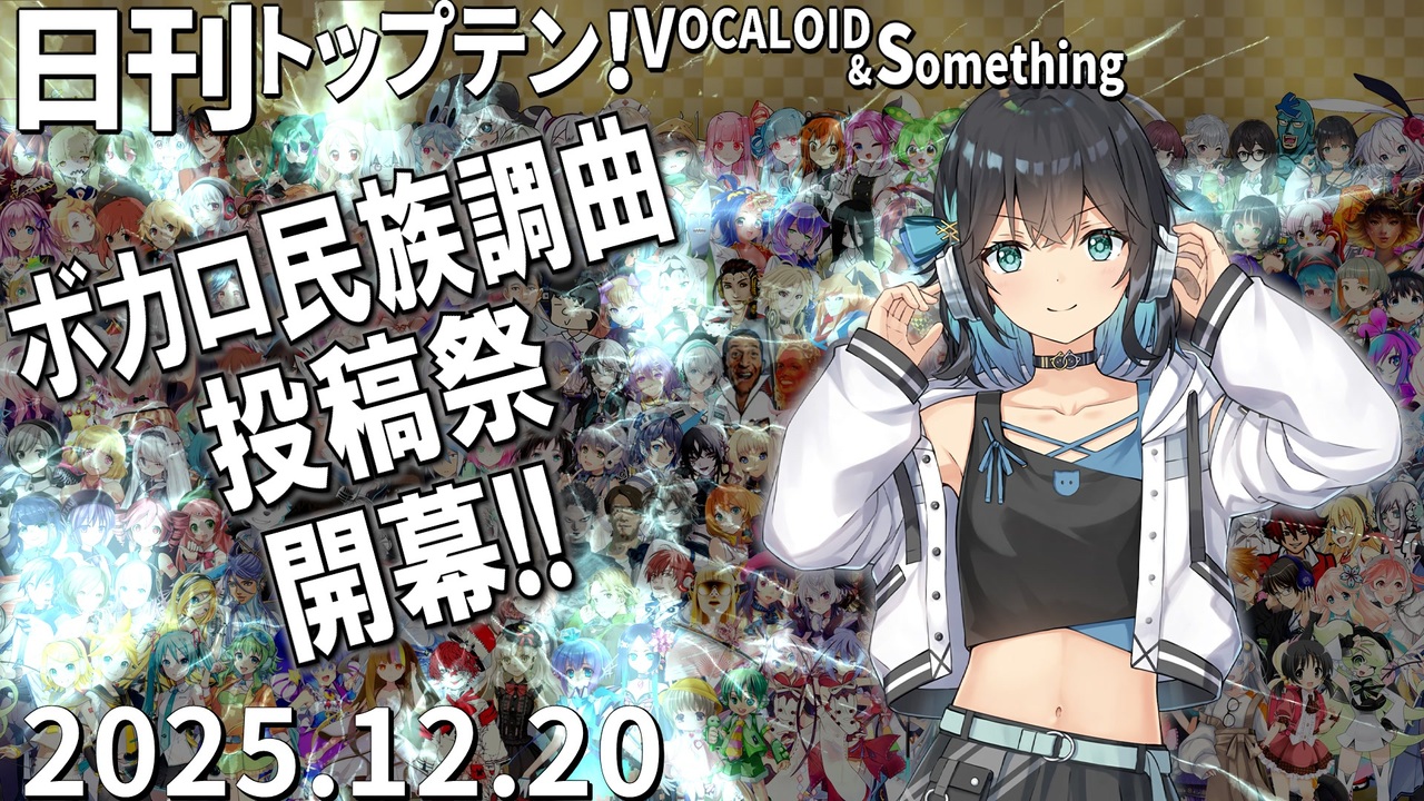 前日(12/19)←<a href="https://www.nicovideo.jp/watch/sm45769830" class="watch">sm45769830</a> <a href="https://www.nicovideo.jp/watch/sm45781124" class="watch">sm45781124</a>→翌日(12/21)<br>★Mixi2にもいます。<a href="https://mixi.social/@LUKANAN_P" target="_blank" rel="noopener nofollow">https://mixi.social/@LUKANAN_P</a><br>★チャプター<br>昨日1位<a href="#" class="seekTime" data-seekTime="0:00" onclick="seekNicoPlayer('#0:00'); return false;">#0:00</a> TOP10<a href="#" class="seekTime" data-seekTime="0:36" onclick="seekNicoPlayer('#0:36'); return false;">#0:36</a> 1年前<a href="#" class="seekTime" data-seekTime="2:56" onclick="seekNicoPlayer('#2:56'); return false;">#2:56</a> TOP3<a href="#" class="seekTime" data-seekTime="3:24" onclick="seekNicoPlayer('#3:24'); return false;">#3:24</a> 10年前<a href="#" class="seekTime" data-seekTime="5:01" onclick="seekNicoPlayer('#5:01'); return false;">#5:01</a> PICKUP<a href="#" class="seekTime" data-seekTime="5:29" onclick="seekNicoPlayer('#5:29'); return false;">#5:29</a><br><br>★トップテン<br>10:<a href="https://www.nicovideo.jp/watch/sm45741872" class="watch">sm45741872</a> 9:<a href="https://www.nicovideo.jp/watch/sm45738496" class="watch">sm45738496</a> 8:<a href="https://www.nicovideo.jp/watch/sm45743020" class="watch">sm45743020</a> 7:<a href="https://www.nicovideo.jp/watch/sm45740399" class="watch">sm45740399</a> <br>6:<a href="https://www.nicovideo.jp/watch/sm45739657" class="watch">sm45739657</a> 5:<a href="https://www.nicovideo.jp/watch/sm45739384" class="watch">sm45739384</a> 4:<a href="https://www.nicovideo.jp/watch/sm45739446" class="watch">sm45739446</a> 3:<a href="https://www.nicovideo.jp/watch/sm45738415" class="watch">sm45738415</a> 2:<a href="https://www.nicovideo.jp/watch/sm45730354" class="watch">sm45730354</a> 1:<a href="https://www.nicovideo.jp/watch/sm45740692" class="watch">sm45740692</a> <br><br>★ピックアップ(B~Kは超新着枠)<br>B:<a href="https://www.nicovideo.jp/watch/sm45739708" class="watch">sm45739708</a> C:<a href="https://www.nicovideo.jp/watch/sm45742455" class="watch">sm45742455</a> D:<a href="https://www.nicovideo.jp/watch/sm45737798" class="watch">sm45737798</a> E:<a href="https://www.nicovideo.jp/watch/sm45741750" class="watch">sm45741750</a> F:<a href="https://www.nicovideo.jp/watch/sm45709126" class="watch">sm45709126</a> G:<a href="https://www.nicovideo.jp/watch/sm45736860" class="watch">sm45736860</a> <br>H:<a href="https://www.nicovideo.jp/watch/sm45740396" class="watch">sm45740396</a> I:<a href="https://www.nicovideo.jp/watch/sm45738701" class="watch">sm45738701</a> J:<a href="https://www.nicovideo.jp/watch/sm45728701" class="watch">sm45728701</a> K:<a href="https://www.nicovideo.jp/watch/sm45742099" class="watch">sm45742099</a> L:<a href="https://www.nicovideo.jp/watch/sm45724267" class="watch">sm45724267</a> <br><br>★プレイバック <br>A(1年前):<a href="https://www.nicovideo.jp/watch/sm44416100" class="watch">sm44416100</a> 十(10年前):<a href="https://www.nicovideo.jp/watch/sm27833019" class="watch">sm27833019</a> 前日の第1位: <a href="https://www.nicovideo.jp/watch/sm45739870" class="watch">sm45739870</a>(宮舞モカ)<br><br>☆集計対象:2025/12/13~20 5時投稿の作品(12/20 5時集計)<br>★計算式:再生×1+コメント×最大12+いいね!×13+マイリスト×11<br>☆プレイリスト:<a href="https://nikkantop10.hatenablog.com/entry/ar20251220" target="_blank" rel="noopener nofollow">https://nikkantop10.hatenablog.com/entry/ar20251220</a> 、 <a href="https://www.nicovideo.jp/mylist/49271984" target="_blank" rel="noopener">mylist/49271984</a> <br>★1年前トップテン:<a href="https://www.nicovideo.jp/watch/sm44449699" class="watch">sm44449699</a><br><br />★日刊トップテン動画一覧マイリスト:<a href="https://www.nicovideo.jp/mylist/47849908" target="_blank" rel="noopener">mylist/47849908</a><br>☆ルールや計算式の詳細:<a href="https://nikkantop10-sub.hatenablog.com/entry/top10_rule" target="_blank" rel="noopener nofollow">https://nikkantop10-sub.hatenablog.com/entry/top10_rule</a><br><span style="color: #262626;">★K!!te Playlist LINK!:<a href="https://kiite.jp/user/AIST_playlist_bot" target="_blank" rel="noopener nofollow">https://kiite.jp/user/AIST_playlist_bot</a><br>☆Twitter:<a href="https://twitter.com/VOCALO_NEWRANK" target="_blank" rel="noopener nofollow">https://twitter.com/VOCALO_NEWRANK</a><br>★Thread:<a href="https://www.threads.net/@lukanan_p" target="_blank" rel="noopener nofollow">https://www.threads.net/@lukanan_p</a></span><br><br><span style="color: #0000ff;"><strong>◆今後の動画投稿イベント情報</strong></span><br>2025/12/29~31 <strong>先端映像音楽表現投稿祭</strong> <a href="https://twipla.jp/events/678401" target="_blank" rel="noopener nofollow">https://twipla.jp/events/678401</a><br>2026/1/1~4 <strong>ボカロサビ投稿祭2026 </strong><a href="https://twipla.jp/events/705936" target="_blank" rel="noopener nofollow">https://twipla.jp/events/705936</a> ※既存曲は新規投稿で参加可<br>2026/1/10~12 <strong>ポストロック投稿祭 </strong><a href="https://twipla.jp/events/694939" target="_blank" rel="noopener nofollow">https://twipla.jp/events/694939</a>