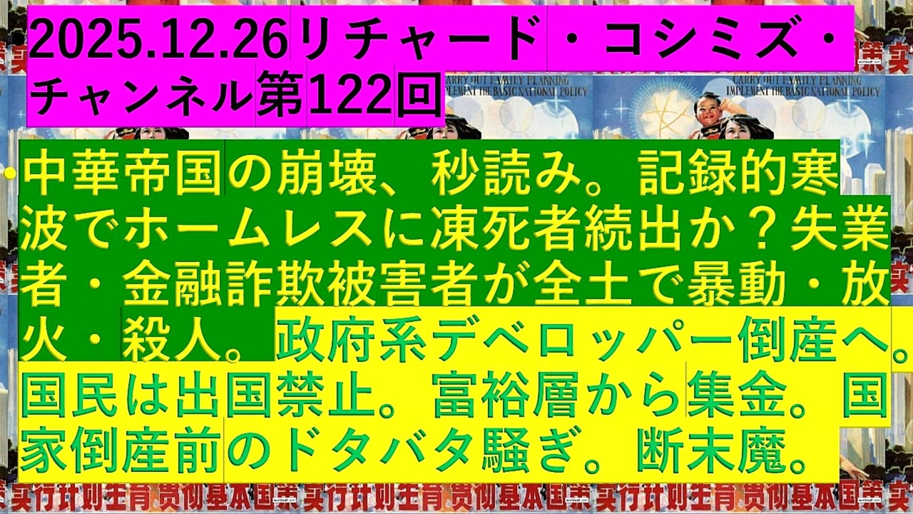 <span style="color: #cc0000;"><strong>◐『「 リチャード・コシミズ・チャンネル 」⦅ 第122回放送 ⦆⦅ 改良版 ⦆』</strong></span><br><br> <span style="color: #ff0000;"><strong>「『 中華帝国 』の『 崩壊 』秒読み。『 記録的寒波 』で『 ホームレス 』に『 凍死者続出 』か?『 失業者 』・『 金融詐欺被害者 』が全土で『 暴動 』・『 放火 』・『 殺人 』。<br> 『 政府系デベロッパー倒産 』へ。『 国民 』は『 出国禁止 』。『 富裕層 』から『 集金 』。『 国家倒産前 』の『 ドタバタ騒ぎ 』。『 断末魔 』」</strong></span><br><br> <span style="color: #38761d;"><strong>◐『 リチャード・コシミズ・チャンネル</strong></span><span style="color: #ff0000;"><strong>⦅ ニコニコ チャンネル ⦆</strong></span><span style="color: #38761d;"><strong>』</strong></span><br> <span style="color: #0000ff;"><strong><a href="https://ch.nicovideo.jp/richardkoshimizu" target="_blank" rel="noopener nofollow">https://ch.nicovideo.jp/richardkoshimizu</a></strong></span><br><br> <span style="color: #38761d;"><strong>◐『「 リチャード・コシミズ 講演会 」</strong></span><span style="color: #ff0000;"><strong>公式「 動画ギャラリー 」⦅ 最新動画 ⦆⦅ YouTube版 ⦆</strong></span><span style="color: #38761d;"><strong>』</strong></span><br> <span style="color: #0000ff;"><strong> <a href="https://www.youtube.com/@richardkoshimizu-video-gallery" target="_blank" rel="noopener nofollow">https://www.youtube.com/@richardkoshimizu-video-gallery</a></strong></span><br>