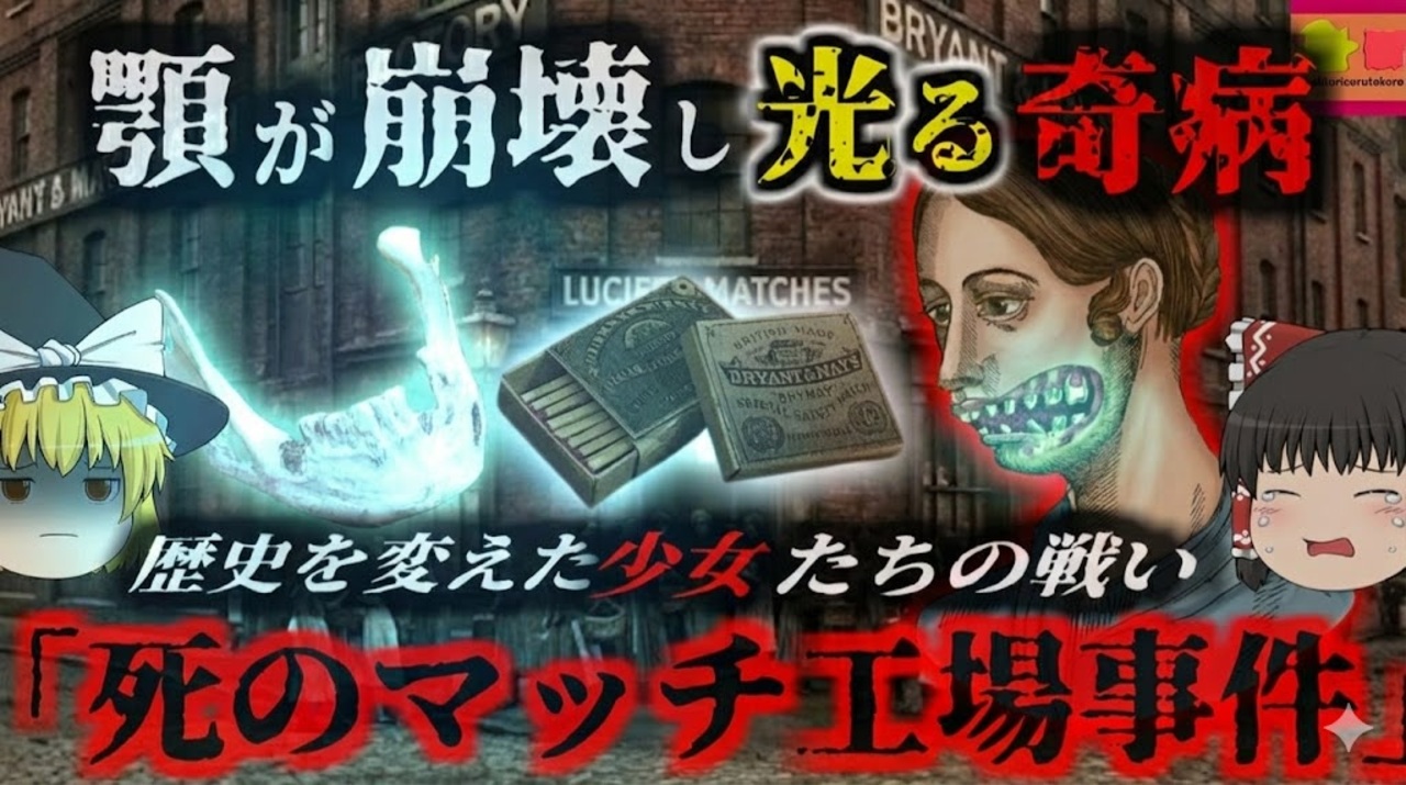 <a href="#" class="seekTime" data-seekTime="00:07" onclick="seekNicoPlayer('#00:07'); return false;">#00:07</a> 視聴上の注意<br><a href="#" class="seekTime" data-seekTime="00:56" onclick="seekNicoPlayer('#00:56'); return false;">#00:56</a> 本編開始<br><a href="#" class="seekTime" data-seekTime="1:40" onclick="seekNicoPlayer('#1:40'); return false;">#1:40</a> 貧困層の少女が働くマッチ工場<br><a href="#" class="seekTime" data-seekTime="2:23" onclick="seekNicoPlayer('#2:23'); return false;">#2:23</a> 「ルシファー・マッチ」<br><a href="#" class="seekTime" data-seekTime="3:07" onclick="seekNicoPlayer('#3:07'); return false;">#3:07</a> 兆候と歯痛<br><a href="#" class="seekTime" data-seekTime="4:04" onclick="seekNicoPlayer('#4:04'); return false;">#4:04</a> 崩壊し光る顎「リン顎」<br><a href="#" class="seekTime" data-seekTime="5:28" onclick="seekNicoPlayer('#5:28'); return false;">#5:28</a> 医療機関での対応<br><a href="#" class="seekTime" data-seekTime="8:34" onclick="seekNicoPlayer('#8:34'); return false;">#8:34</a> 手術が成功しても「カエルの顔」と呼ばれた<br><a href="#" class="seekTime" data-seekTime="9:33" onclick="seekNicoPlayer('#9:33'); return false;">#9:33</a> 体を蝕んでいたのは「白リン」<br><a href="#" class="seekTime" data-seekTime="11:01" onclick="seekNicoPlayer('#11:01'); return false;">#11:01</a> 青酸カリレベルの猛毒だった<br><a href="#" class="seekTime" data-seekTime="13:11" onclick="seekNicoPlayer('#13:11'); return false;">#13:11</a> 政府が規制しなかった理由<br><a href="#" class="seekTime" data-seekTime="15:12" onclick="seekNicoPlayer('#15:12'); return false;">#15:12</a> 巨大企業の闇<br><a href="#" class="seekTime" data-seekTime="17:15" onclick="seekNicoPlayer('#17:15'); return false;">#17:15</a> マッチのように「使い捨て」だった少女たち<br><a href="#" class="seekTime" data-seekTime="18:15" onclick="seekNicoPlayer('#18:15'); return false;">#18:15</a> 抗議活動のきっかけを作った女性「Annie Wood Besant」<br><a href="#" class="seekTime" data-seekTime="19:16" onclick="seekNicoPlayer('#19:16'); return false;">#19:16</a> 信じられないひどい待遇<br><a href="#" class="seekTime" data-seekTime="20:54" onclick="seekNicoPlayer('#20:54'); return false;">#20:54</a> 告発に対する企業の対応<br><a href="#" class="seekTime" data-seekTime="21:24" onclick="seekNicoPlayer('#21:24'); return false;">#21:24</a> 立ち上がった女性たち<br><a href="#" class="seekTime" data-seekTime="24:28" onclick="seekNicoPlayer('#24:28'); return false;">#24:28</a> 事件が及ぼした影響<br><br>引用・出展・参考文献(視聴者提供資料など<br>Wikipedia Phossy jaw<br><a href="https://x.gd/0mof8" target="_blank" rel="noopener nofollow">https://x.gd/0mof8</a><br>Annie Wood Besant<br><a href="https://x.gd/WHKBC" target="_blank" rel="noopener nofollow">https://x.gd/WHKBC</a><br><br>Inside ‘Phossy Jaw,’ The Deadly Condition That Plagued 19th-Century Matchstick Girls<br><a href="https://x.gd/hlbFl" target="_blank" rel="noopener nofollow">https://x.gd/hlbFl</a><br><br />※この動画は過去の事件を知り、現在でも同じことが発生する危険性を再認識、関与しないように促すための動画であり、視聴者を扇動、動揺を誘うためのコンテンツではありません。<br><br>ご要望にお応えして、メンバーシップの開設を行いました。<br>下記URLからも登録可能ですので、ご興味がある方は是非ご参加ください。<br><a href="https://www.youtube.com/channel/UCcT5a1J7XJW7CLYI2RKl4pw/join" target="_blank" rel="noopener nofollow">https://www.youtube.com/channel/UCcT5a1J7XJW7CLYI2RKl4pw/join</a><br><br><br>Twitter<br>→<a href="https://twitter.com/yukkurisurutoko" target="_blank" rel="noopener nofollow">https://twitter.com/yukkurisurutoko</a><br><br>取り急ぎ、簡易的にですがマイリストを作りました。<br>【ゆっくり解説】事故・事件関係紹介リスト <br><a href="https://www.nicovideo.jp/mylist/71034319" target="_blank" rel="noopener nofollow">https://www.nicovideo.jp/mylist/71034319</a><br>【ゆっくり解説】放射線系事故<br><a href="https://www.nicovideo.jp/mylist/71034368" target="_blank" rel="noopener nofollow">https://www.nicovideo.jp/mylist/71034368</a><br>【ゆっくり解説】鉄道系事故・事件関連<br><a href="https://www.nicovideo.jp/mylist/71034379" target="_blank" rel="noopener nofollow">https://www.nicovideo.jp/mylist/71034379</a>