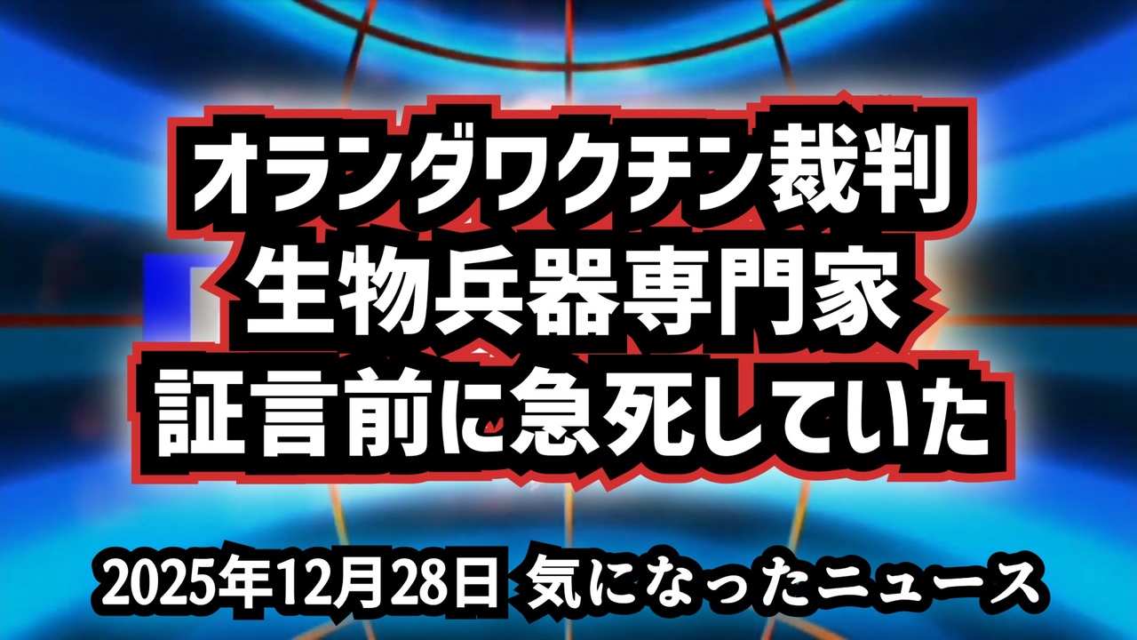 【証人が突然死】◆生物兵器専門家が証言前に急死|フランシス・ボイル教授の不可解な死とCOVIDワクチン裁判【オランダワクチン裁判】<br><br>証言前に消された!?生物兵器専門家<br>ワクチン裁判(オランダ裁判)の証人が突然死<br>フランシス・ボイル教授はなぜ死んだのか<br><br>生物兵器証言<br>証言直後の急死<br>ワクチン裁判証人<br>不可解な死亡<br>フランシスボイル<br>生物兵器専門家<br>死因不明<br>内部告発証言<br><br>あらすじ<br>生物兵器専門家として知られるフランシス・ボイル教授は、『生物兵器』および『バイオウェポン』に関する国際法制定にも関与した人物で、新型コロナワクチン被害に関するオランダ裁判において原告側の『裁判証人』として証言する予定だった。しかし『内部告発』に等しい証言に同意した直後、『証言者急死』という形で突然亡くなり、『死因不明』のまま真相は伏せられている。この一連の経緯は『ワクチン疑惑』と深く結びつき、多くの人々に『不可解な死』として強い衝撃を与えている。<br><br>ご覧いただきありがとうございます<br>m(_ _)m<br><br>気になったニュース 2025/12/28<br><br />著作権、肖像権に配慮して作成しております。<br><br>◆気になったニュースの台本!?<br>メモ代わりに作った台本をそのままあげてます<br><a href="https://keiichiro8140.hatenablog.com/." target="_blank" rel="noopener nofollow">https://keiichiro8140.hatenablog.com/.</a><br><br><br>ここからはシリーズ紹介<br><br><br>◆ ワクチン解毒・デトックス<br><a href="https://x.gd/fZweg" target="_blank" rel="noopener nofollow">https://x.gd/fZweg</a><br><br>◆ウイリアム・マキス博士のがん治療(イベルメクチン・フェンベンダゾール等)<br><a href="https://x.gd/AtFYS" target="_blank" rel="noopener nofollow">https://x.gd/AtFYS</a><br><br>◆予防接種健康被害救済制度<br><a href="https://x.gd/0xK9x" target="_blank" rel="noopener nofollow">https://x.gd/0xK9x</a><br><br>◆気になったニュース #1501~<br><br>◆ 【ショートver】気になったニュース<br><a href="https://x.gd/7MxXC" target="_blank" rel="noopener nofollow">https://x.gd/7MxXC</a><br><br>◆ 気になったニュース #1001~<br><a href="https://x.gd/Lp8gv" target="_blank" rel="noopener nofollow">https://x.gd/Lp8gv</a><br><br>◆ 気になったニュース #501~<br><a href="https://x.gd/EmbS4" target="_blank" rel="noopener nofollow">https://x.gd/EmbS4</a><br><br>◆ 気になったニュース #1~#500<br><a href="https://x.gd/uPhNb" target="_blank" rel="noopener nofollow">https://x.gd/uPhNb</a><br><br>◆ X(旧Twitter)・テレグラムで気になった情報<br><a href="https://x.gd/YG6FT" target="_blank" rel="noopener nofollow">https://x.gd/YG6FT</a><br><br>◆ 日比谷5万人パレードデ⚪生放送アーカイブ動画<br><a href="https://x.gd/3CHJv" target="_blank" rel="noopener nofollow">https://x.gd/3CHJv</a><br><br>◆日比谷5万人パレード⚪モのマイリスト作ってみました<br><a href="https://nico.ms/mylist/76828848?ref=sp_other" target="_blank" rel="noopener nofollow">https://nico.ms/mylist/76828848?ref=sp_other</a><br><br>◆3.30 令和の百姓⚪⚪<br><a href="https://www.nicovideo.jp/series/511791?ref=garage_share_other" target="_blank" rel="noopener nofollow">https://www.nicovideo.jp/series/511791?ref=garage_share_other</a><br><br>◆ 及川幸久さんの【XNEWS】シリーズ<br><a href="https://x.gd/3k78K" target="_blank" rel="noopener nofollow">https://x.gd/3k78K</a><br><br>◆これまでの動画<a href="https://x.gd/sPXoJ" target="_blank" rel="noopener nofollow">https://x.gd/sPXoJ</a><br><br>◆もしも(BAN)の時のためのマイリンク集<a href="https://lit.link/K-16_News44" target="_blank" rel="noopener nofollow">https://lit.link/K-16_News44</a><br><br>