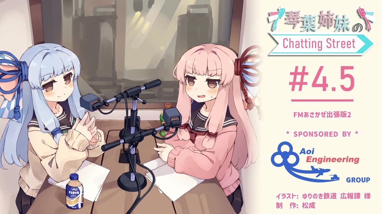 2025年9月14日(日)に開催された「声音の宴 5次会」参加サークル「FMあさかぜ」様にて、現地でラジオ放送されました番組の松成担当パート『琴葉姉妹のChatting Street FMあさかぜ出張版 2』の単品です。<br>自由な葵ちゃんと、チャキチャキした茜ちゃんのまったりゆるっとした掛け合いをお楽しみください。<br>#4と#5の間での制作だったのですが、通しで聴いてもちゃんとつながる構成にしてみました…!<br><br>当日放送されたフル尺の動画は主催の方よりどうぞ。ほかの番組もオススメです!<br>→『FMあさかぜ9月19日13時放送分』<a href="https://www.nicovideo.jp/watch/sm45764346" class="watch">sm45764346</a><br><br>動画のイメージイラストはいつもお世話になっているゆりのき鉄道 広報課 さま( <a href="https://www.nicovideo.jp/user/25649656" target="_blank" rel="noopener">user/25649656</a> )にお願いしました。<br><br><strong><u>〇BGM・SE素材</u></strong><br> フリーBGM・音楽素材MusMus <a href="https://musmus.main.jp" target="_blank" rel="noopener nofollow">https://musmus.main.jp</a><br><br>----------------<br>いえいな葵ちゃんの愉快なAoi Engineeringシリーズ:<a href="https://www.nicovideo.jp/series/126180" target="_blank" rel="noopener">series/126180</a>