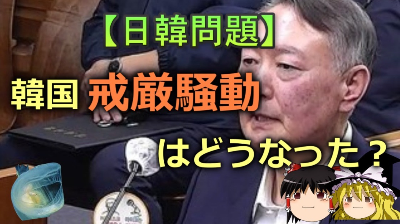 さて、本日は韓国戒厳騒動が現在どうなっているかについて扱っていきます。<br>2025年最後のどようび<br>本日のブログ記事<br><a href="https://oogchib.hateblo.jp/entry/2025/12/28/210000" target="_blank" rel="noopener nofollow">https://oogchib.hateblo.jp/entry/2025/12/28/210000</a><br><br>注意<br>・この動画は「日韓の価値観の違い」を扱っています<br><br>・動画のスタンスは「価値観に善悪や優劣は存在しない」というものです<br><br>・相手が不法を働いているからとこちらが不法をして良い理由にはなりません<br><br>・自身の常識が相手にとっても常識とは限りません、「他者がそれを見たら<br>どう思うか」という客観性を常に持ちましょう。<br><br>・日常生活で注意する程度には言動に注意を心がけてください<br><br>・リクエストは原則受け付けていません<br><br>・引用ソースへのリンクが同時掲載のブログにあります<br><br>・毎週日曜日更新<br><br>引用ソースと動画のテキストをブログ日韓問題(初心者向け)のほうへ掲載しています。<br><br>もしよかったらチャンネル登録や「いいね」ボタンクリックよろしくお願いします。<br><br>日韓問題(初心者向け)<br><a href="https://oogchib.hateblo.jp/" target="_blank" rel="noopener nofollow">https://oogchib.hateblo.jp/</a><br><br>暇つぶしにどうぞ<br><a href="http://ooguchib.blog.fc2.com/" target="_blank" rel="noopener nofollow">http://ooguchib.blog.fc2.com/</a> <br><br>X(旧twitter) @ooguchib<br><a href="https://x.com/ooguchib" target="_blank" rel="noopener nofollow">https://x.com/ooguchib</a><br><br>前 <a href="https://www.nicovideo.jp/watch/sm45750481" class="watch">sm45750481</a> <a href="https://www.nicovideo.jp/mylist/59069876" target="_blank" rel="noopener">mylist/59069876</a> 次 <a href="https://www.nicovideo.jp/watch/sm45824826" class="watch">sm45824826</a><br><br>番外編マイリスト<br><a href="https://www.nicovideo.jp/mylist/62992608" target="_blank" rel="noopener">mylist/62992608</a><br><br>YouTube版<br><a href="https://youtu.be/JLmx4RuMDYQ" target="_blank" rel="noopener nofollow">https://youtu.be/JLmx4RuMDYQ</a>
