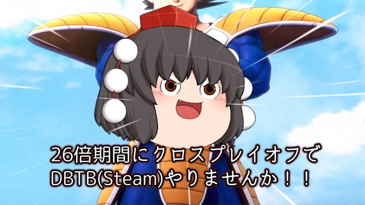 開催概要<br> 日程:2026年1月2日(金) 21時~24時(人数次第で延長あり)<br> 目的:26倍期間にレベル上げしつつ対戦を楽しむ事<br> 設定方法:DBTBのゲーム内メニューから<br> "OPTIONS→ゲームプレイ設定→クロスプレイ[OFF]"<br> 参加方法:開催期間中にマッチング開始するだけ!<br><br> ルール:通常の野良対戦と同様、<br> 公式の定めたルールに則ってプレイする事。<br> ※身内戦ではありません!<br> うp主とマッチングした際は配信を切る事。<br> (所謂ゴースティング禁止)<br><br> その他:開催中、うp主は配信しながらプレイします。<br> 人数集まらなかったら野良対戦の配信に切り替えます。<br> 各々での撮影や配信もご自由にどうぞ。<br><br> ※当日の配信で変更や補足がある可能性もございます。<br><br>大会的なものでなく、同じ時間帯に野良戦で遊びませんか!?<br>というお誘いに過ぎませんので、お気軽にご参加ください。
