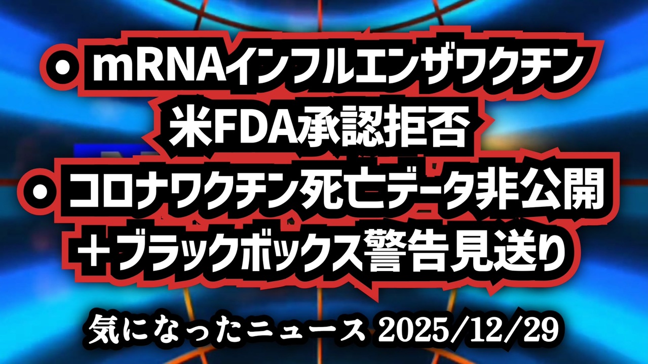 ◆米FDA、mRNAインフルエンザワクチン承認拒否と死亡データ非公開・ブラックボックス警告見送り<br><br>FDAは製薬企業のものではなくアメリカ国民のものであり、行政府の一機関として『ゴールドスタンダードの科学』に基づく判断を行うとマーティ・マカリー長官は強調した。高齢者の臨床試験で有効性を示せなかったmRNAインフルエンザワクチンは、企業やロビイストの圧力に関係なく承認拒否となった。一方、新型コロナmRNAワクチンでは、死亡分析データが非公開のまま、ブラックボックス警告も見送られている。内部では追加を推奨する声があったが、現在は年1回接種となり初期と同じリスクとは限らないとの判断が示された。しかし具体的なリスク評価やデータ説明は行われておらず、FDAの透明性と科学的独立性が問われている。<br><br>◆今回の台本&詳細<a href="https://keiichiro8140.hatenablog.com/entry/25122888333999" target="_blank" rel="noopener nofollow">https://keiichiro8140.hatenablog.com/entry/25122888333999</a><br><br>◆これまでの動画<a href="https://x.gd/sPXoJ" target="_blank" rel="noopener nofollow">https://x.gd/sPXoJ</a><br><br>◆もしも(BAN)の時のためのマイリンク集<a href="https://lit.link/K-16_News44" target="_blank" rel="noopener nofollow">https://lit.link/K-16_News44</a><br><br>ご覧いただきありがとうございます<br>m(_ _)m<br><br>気になったニュース 2025/12/29<br><br />著作権、肖像権に配慮して作成しております。<br><br>◆気になったニュースの台本!?<br>メモ代わりに作った台本をそのままあげてます<br><a href="https://keiichiro8140.hatenablog.com/." target="_blank" rel="noopener nofollow">https://keiichiro8140.hatenablog.com/.</a><br><br><br>ここからはシリーズ紹介<br><br><br>◆ ワクチン解毒・デトックス<br><a href="https://x.gd/fZweg" target="_blank" rel="noopener nofollow">https://x.gd/fZweg</a><br><br>◆ウイリアム・マキス博士のがん治療(イベルメクチン・フェンベンダゾール等)<br><a href="https://x.gd/AtFYS" target="_blank" rel="noopener nofollow">https://x.gd/AtFYS</a><br><br>◆予防接種健康被害救済制度<br><a href="https://x.gd/0xK9x" target="_blank" rel="noopener nofollow">https://x.gd/0xK9x</a><br><br>◆気になったニュース #1501~<br><br>◆ 【ショートver】気になったニュース<br><a href="https://x.gd/7MxXC" target="_blank" rel="noopener nofollow">https://x.gd/7MxXC</a><br><br>◆ 気になったニュース #1001~<br><a href="https://x.gd/Lp8gv" target="_blank" rel="noopener nofollow">https://x.gd/Lp8gv</a><br><br>◆ 気になったニュース #501~<br><a href="https://x.gd/EmbS4" target="_blank" rel="noopener nofollow">https://x.gd/EmbS4</a><br><br>◆ 気になったニュース #1~#500<br><a href="https://x.gd/uPhNb" target="_blank" rel="noopener nofollow">https://x.gd/uPhNb</a><br><br>◆ X(旧Twitter)・テレグラムで気になった情報<br><a href="https://x.gd/YG6FT" target="_blank" rel="noopener nofollow">https://x.gd/YG6FT</a><br><br>◆ 日比谷5万人パレードデ⚪生放送アーカイブ動画<br><a href="https://x.gd/3CHJv" target="_blank" rel="noopener nofollow">https://x.gd/3CHJv</a><br><br>◆日比谷5万人パレード⚪モのマイリスト作ってみました<br><a href="https://nico.ms/mylist/76828848?ref=sp_other" target="_blank" rel="noopener nofollow">https://nico.ms/mylist/76828848?ref=sp_other</a><br><br>◆3.30 令和の百姓⚪⚪<br><a href="https://www.nicovideo.jp/series/511791?ref=garage_share_other" target="_blank" rel="noopener nofollow">https://www.nicovideo.jp/series/511791?ref=garage_share_other</a><br><br>◆ 及川幸久さんの【XNEWS】シリーズ<br><a href="https://x.gd/3k78K" target="_blank" rel="noopener nofollow">https://x.gd/3k78K</a><br><br>◆これまでの動画<a href="https://x.gd/sPXoJ" target="_blank" rel="noopener nofollow">https://x.gd/sPXoJ</a><br><br>◆もしも(BAN)の時のためのマイリンク集<a href="https://lit.link/K-16_News44" target="_blank" rel="noopener nofollow">https://lit.link/K-16_News44</a><br><br>