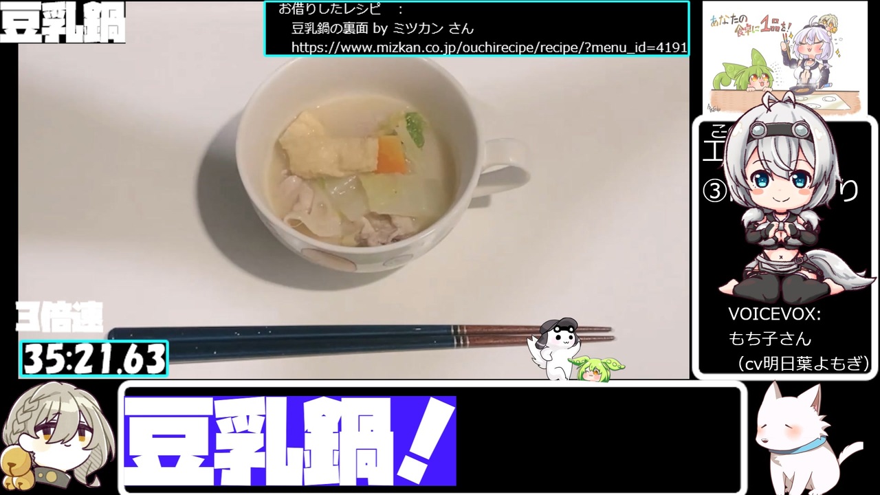 料理初心者がはじめて作る料理にチャレンジします!<br><br>参考にしたレシピはこちら<br> 豆乳鍋の裏面 by ミツカン さん<br> <a href="https://www.mizkan.co.jp/ouchirecipe/recipe/?menu_id=4191" target="_blank" rel="noopener nofollow">https://www.mizkan.co.jp/ouchirecipe/recipe/?menu_id=4191</a><br /><br>編集に使用させていただいているものは、プロフィールみてね!<br><a href="https://www.nicovideo.jp/user/311366" target="_blank" rel="noopener nofollow">https://www.nicovideo.jp/user/311366</a><br><br>読み上げ:VOICEVOX もち子(cv明日葉よもぎ)、ずんだもん、四国めたん、青山龍星、WhiteCUL、伊織弓鶴、COEIROINK:猫米茶<br><br><strong>過去の動画にコメント、いいね!、ギフト、広告、フォロー、マイリストありがとうございました!</strong><br><br>とり料理祭ありがとうございました!<br>2023参加作品はこちら ⇒ <a href="https://www.nicovideo.jp/mylist/75430531" target="_blank" rel="noopener nofollow">https://www.nicovideo.jp/mylist/75430531</a><br>2024冬参加作品はこちら ⇒ <a href="https://www.nicovideo.jp/mylist/75862737" target="_blank" rel="noopener nofollow">https://www.nicovideo.jp/mylist/75862737</a><br>2024夏参加作品はこちら ⇒ <a href="https://www.nicovideo.jp/mylist/76572716" target="_blank" rel="noopener nofollow">https://www.nicovideo.jp/mylist/76572716</a><br>2025冬参加作品はこちら ⇒ <a href="https://www.nicovideo.jp/mylist/77171241" target="_blank" rel="noopener nofollow">https://www.nicovideo.jp/mylist/77171241</a><br>2025夏参加作品はこちら ⇒ <a href="https://www.nicovideo.jp/mylist/77600849" target="_blank" rel="noopener nofollow">https://www.nicovideo.jp/mylist/77600849</a><br><br>このその日ごとになんか出す定食屋か駄菓子屋のごとき動画を継続して投稿するために<br>スポンサーをひっそり募集しております、あなたも一口いかが?<br><a href="https://creator-support.nicovideo.jp/registration/311366" target="_blank" rel="noopener nofollow">https://creator-support.nicovideo.jp/registration/311366</a>