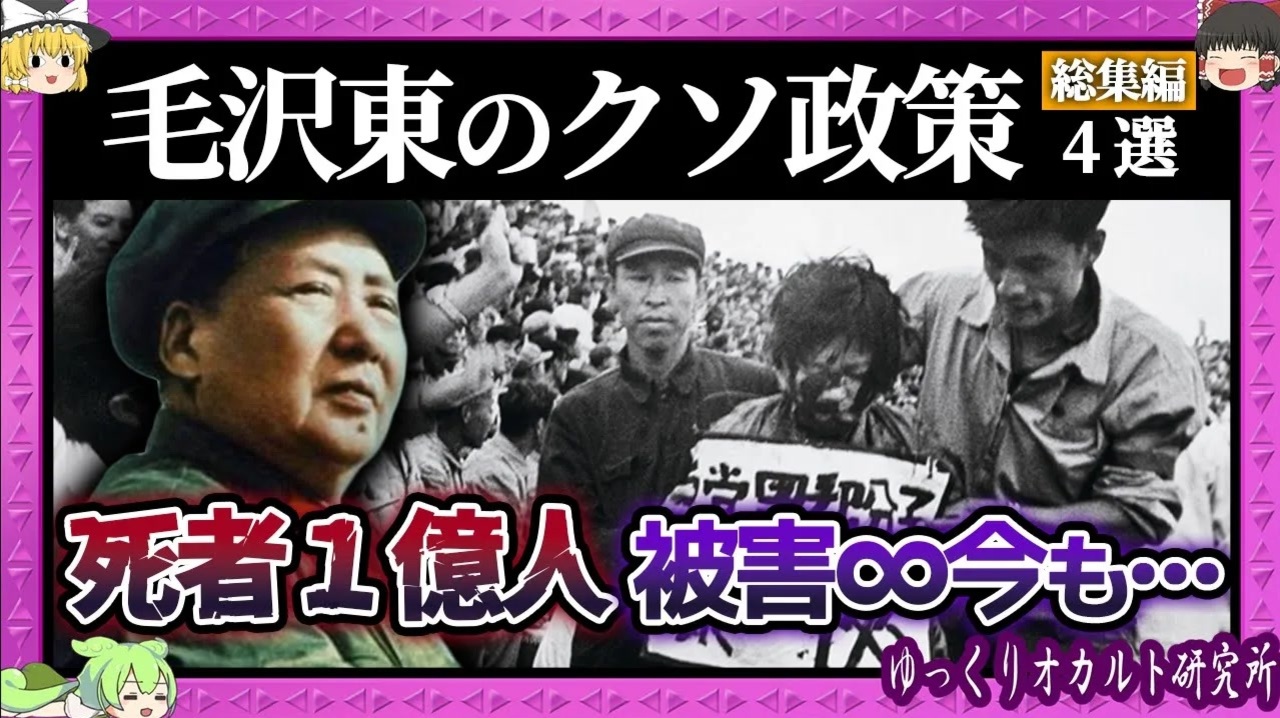 中国で「建国の父」とされる毛沢東。しかし人類史上類を見ない虐殺と圧政の独裁者でもあります。「毛沢東の生い立ちから権力を握るまで」の動画を新たに追加し、総集編としてまとめました。作業用、睡眠用としてもおすすめの【 ゆっくり解説 中国共産党 総集編 】として、ゆっくり茶番劇スタイルでお届けします。 00:00 目次 00:12 序章 毛沢東が権力を握るまで(新動画:クソ政策① 三反五反運動) 04:58 百花斉放百家争鳴運動(クソ政策②) 13:20 大躍進政策(クソ政策③) 23:47 文化大革命(クソ政策④) 31:42 まとめ(新動画) <br>★関連動画はこちらから! <a href="https://youtube.com/@ゆっくりオカルト研究所" target="_blank" rel="noopener nofollow">https://youtube.com/@ゆっくりオカルト研究所</a> ★気まずすぎる動画はメンバーシップで…→ <a href="https://www.youtube.com/channel/UCirxRvghHohWx9iWLKYuceg/join" target="_blank" rel="noopener nofollow">https://www.youtube.com/channel/UCirxRvghHohWx9iWLKYuceg/join</a> ★規制されてしまった動画・オリジナル動画等あり!裏オカ研(サブスク):再生リスト「裏のアレ」→ <a href="https://mediable.jp/playlists/c98143a6-4a92-4337-9325-e15eadaab6e2" target="_blank" rel="noopener nofollow">https://mediable.jp/playlists/c98143a6-4a92-4337-9325-e15eadaab6e2</a> #ゆっくり解説#毛沢東#文化大革命#大躍進政策#独裁者 ※この動画は、過去に起きた事件などから、現代でも起こりうるリスク・教訓を伝えるための情報の伝達を主な目的としており、視聴者に衝撃を与えて扇動する目的はございません。 ※科学では説明の付かないオカルト・心霊・超常現象なども取り扱うことがありますが、同様に視聴者に衝撃を与えて扇動する目的はございません。 ※ゆっくり解説・ゆっくり茶番劇のスタイルを取っておりますが、動画での惨事や死を取り扱う内容については、関係者を冒涜したり、その行動を助長したりするといった意図はございません。 ※動画内の素材はすべて引用であり、著作権や肖像権を侵害する目的はございません。