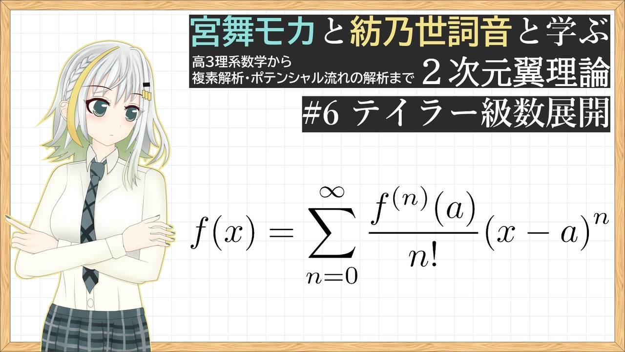 良いお年を!<br><br>============================================================<br><br>翼の揚力を解析的に計算する動画シリーズです。<br>第6回はテイラー級数展開です。<br><br>翼理論の動画と称して、動画タイトルにも【飛行機】ってつけて、数学の動画ばかり挙げていると、たまに「これってタイトル詐欺とか検索妨害になってないかな?」と思うことがあります。<br><br>この動画の最終チェック中もそう思いました。<br><br>でも、流体力学は場の力学なんです。<br>場の力学を学ぶことは、解析学を学ぶということなんです。<br><br>非専門の人にこの動画を観て頂いたとして、最初の感想は「これどこが翼理論なん?」だと思います。<br>なんなら、将来の2回の動画も同じ感想になると思います。<br><br>変な話ですが、そういうところも面白いと思うので、気長にシリーズを楽しんでもらえるといいなと思います。<br><br><br>★ご意見箱を開設しました(マシュマロ)★<br>動画への感想・ご意見・質問をお待ちしてます!<br><a href="https://marshmallow-qa.com/37ckedl6n52obdp" target="_blank" rel="noopener nofollow">https://marshmallow-qa.com/37ckedl6n52obdp</a><br><br>前回: <a href="https://www.nicovideo.jp/watch/sm45581720" class="watch">sm45581720</a><br>次回: 未投稿<br><br><a target="_blank" href="https://qa.nicovideo.jp/faq/show/19424?site_domain=default" style="font-size: 13px;color: #657586; text-decoration: underline; line-height: 1.4">この動画は投稿者によって修正されました</a>