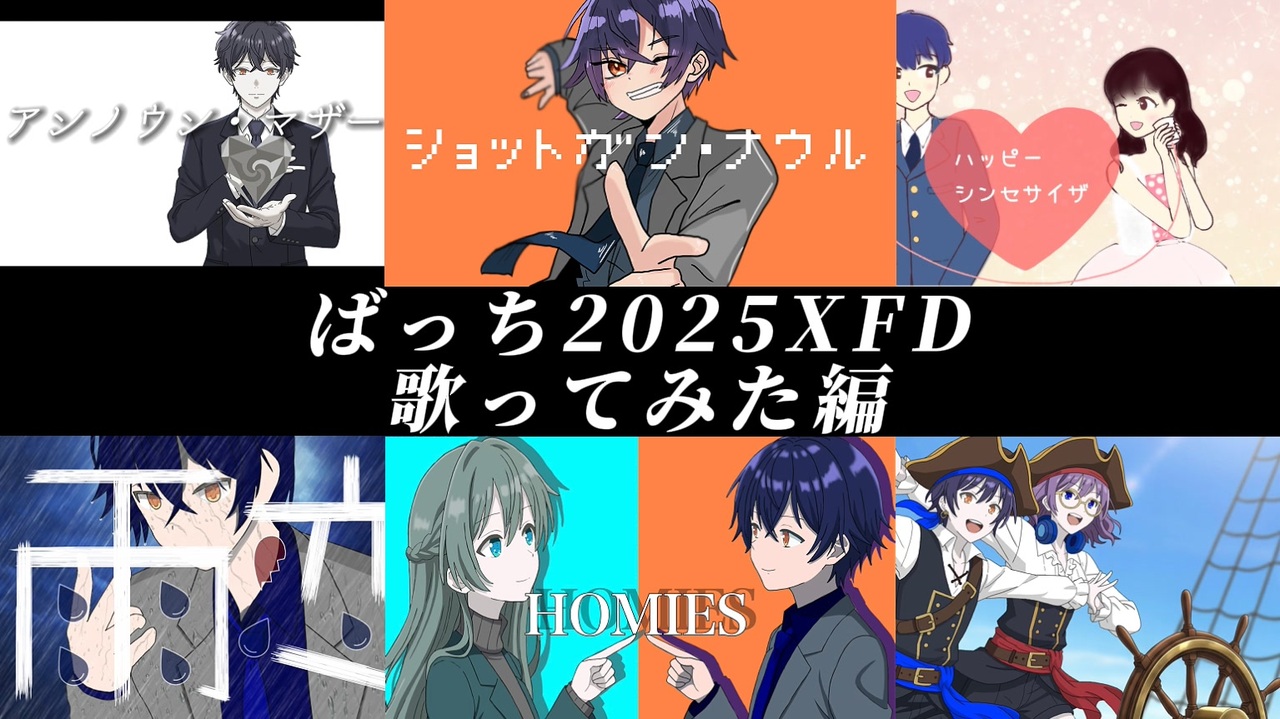 お世話になってます、ばっちです。<br><br>2025年も皆さま、ありがとうございました!<br><br>今回は新作ではなく、今年一年に出した動画のクロスフェードです。XFD投稿祭にこちらで参加させていただきます!<br><br>ボカロオリジナル曲のXFDは明日投稿させていただきます!何卒よろしくどうぞ。<br><br>1.<a href="https://www.nicovideo.jp/watch/sm45444939" class="watch">sm45444939</a> <strong>アンノウン・マザーグース</strong><br>2.<a href="https://www.nicovideo.jp/watch/sm45444989" class="watch">sm45444989</a> <strong>雨恋</strong>(オリジナル曲・セルフカバー)<br>3.<a href="https://www.nicovideo.jp/watch/sm45445020" class="watch">sm45445020</a> <strong>Bon voyage</strong>(オリジナル曲・音葉さんコラボ)<br>4.<a href="https://www.nicovideo.jp/watch/sm45445066" class="watch">sm45445066</a> <strong>ハッピーシンセサイザ</strong>(姫川雅子さんコラボ)<br>5.<a href="https://www.nicovideo.jp/watch/sm45445943" class="watch">sm45445943</a> <strong>ショットガン・ナウル</strong><br>6.<a href="https://www.nicovideo.jp/watch/sm45592875" class="watch">sm45592875</a> <strong>HOMIES</strong>(オリジナル曲・ミクさんと歌ってみた)<br><br><br>X(旧Twitter)<br><a href="https://x.com/batch1026?s=21" target="_blank" rel="noopener nofollow">https://x.com/batch1026?s=21</a><br><br>Instagram<br><a href="https://www.instagram.com/batch_1026/profilecard/?igsh=MWhpemVlbXRmZG9pOA==" target="_blank" rel="noopener nofollow">https://www.instagram.com/batch_1026/profilecard/?igsh=MWhpemVlbXRmZG9pOA==</a><br><br>YouTube<br><a href="http://www.youtube.com/@batch_1026" target="_blank" rel="noopener nofollow">http://www.youtube.com/@batch_1026</a>