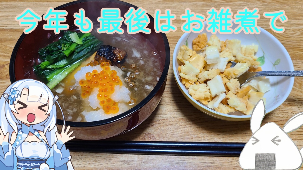 今年も1年お付き合いいただきましてありがとうございました。<br>年末年始もお仕事で満足に買い物に行けなかった人でも簡単に作れるお雑煮を作りました。<br>あられはコンビニで売ってるので代用してください。<br>他の食材も大体はコンビニで揃えられると思います。<br><br>ここ最近はまともに寝ないで動画を作りまくっていたのでそろそろ寝ます。<br>来年もまたよろしくお願いいたします。<br />======================================================<br>近頃はtwitterで食べることばかり呟いてます(@Lunch_Time_1200)<br><a href="https://x.com/Lunch_Time_1200" target="_blank" rel="noopener nofollow">https://x.com/Lunch_Time_1200</a><br><br>youtubeのほうにも上げてますので、よかったらそちらも見てください<br><a href="https://www.youtube.com/channel/UCFslJFVXPn4MIJdakRtTW1Q" target="_blank" rel="noopener nofollow">https://www.youtube.com/channel/UCFslJFVXPn4MIJdakRtTW1Q</a><br><br>ブログ始めました<br>動画をあげた料理のレシピとか書いてます。(最終更新:24/8/18)<br><a href="https://lunch-time-1200.blog.jp/" target="_blank" rel="noopener nofollow">https://lunch-time-1200.blog.jp/</a><br><br>WhiteCUL(雪さん)立ち絵素材は「坂本アヒル」さまのものをお借りしております。<br><a href="https://seiga.nicovideo.jp/seiga/im11232248" target="_blank" rel="noopener nofollow">https://seiga.nicovideo.jp/seiga/im11232248</a><br><br>『WhiteCUL』二次創作ガイドライン<br><a href="https://commons.nicovideo.jp/works/nc312647" target="_blank" rel="noopener nofollow">https://commons.nicovideo.jp/works/nc312647</a><br>