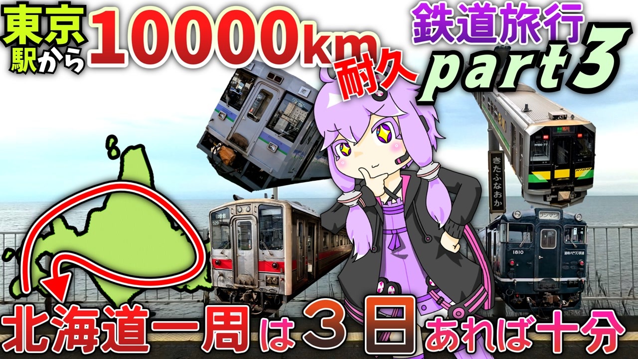 まえ(Part2)→<a href="https://www.nicovideo.jp/watch/sm45781272" class="watch">sm45781272</a><br>はじめから(part1)→<a href="https://www.nicovideo.jp/watch/sm45785475" class="watch">sm45785475</a><br><br>「北海道は狭いだろう」と「北海道は狭い」の間に「北海道は広い」がある<br><br><br>🥬🌽🥬🌽🥬チャプター🌽🥬🌽🥬🌽 <br><a href="#" class="seekTime" data-seekTime="0:00" onclick="seekNicoPlayer('#0:00'); return false;">#0:00</a> DAY5【青い森鉄道】筒井~青森 <br><a href="#" class="seekTime" data-seekTime="0:28" onclick="seekNicoPlayer('#0:28'); return false;">#0:28</a> 【津軽線】青森~蟹田 <br><a href="#" class="seekTime" data-seekTime="4:34" onclick="seekNicoPlayer('#4:34'); return false;">#4:34</a> 【津軽線】蟹田~津軽二股(奥津軽いまべつ) <br><a href="#" class="seekTime" data-seekTime="7:46" onclick="seekNicoPlayer('#7:46'); return false;">#7:46</a> 【北海道新幹線】奥津軽いまべつ~木古内 <br><a href="#" class="seekTime" data-seekTime="12:23" onclick="seekNicoPlayer('#12:23'); return false;">#12:23</a> 【道南いさりび鉄道】木古内~五稜郭 <br><a href="#" class="seekTime" data-seekTime="15:28" onclick="seekNicoPlayer('#15:28'); return false;">#15:28</a> 【函館本線】五稜郭~長万部 <br><a href="#" class="seekTime" data-seekTime="21:27" onclick="seekNicoPlayer('#21:27'); return false;">#21:27</a> 【函館本線】長万部~小樽 <br><a href="#" class="seekTime" data-seekTime="26:26" onclick="seekNicoPlayer('#26:26'); return false;">#26:26</a> 【函館本線】小樽~札幌 <br><a href="#" class="seekTime" data-seekTime="30:30" onclick="seekNicoPlayer('#30:30'); return false;">#30:30</a> DAY6 <br><a href="#" class="seekTime" data-seekTime="30:53" onclick="seekNicoPlayer('#30:53'); return false;">#30:53</a> 【函館本線】札幌~岩見沢 <br><a href="#" class="seekTime" data-seekTime="33:18" onclick="seekNicoPlayer('#33:18'); return false;">#33:18</a> 【函館本線】岩見沢~滝川 <br><a href="#" class="seekTime" data-seekTime="35:51" onclick="seekNicoPlayer('#35:51'); return false;">#35:51</a> 【根室本線】滝川~富良野 <br><a href="#" class="seekTime" data-seekTime="41:56" onclick="seekNicoPlayer('#41:56'); return false;">#41:56</a> 【富良野線】富良野~旭川 <br><a href="#" class="seekTime" data-seekTime="46:48" onclick="seekNicoPlayer('#46:48'); return false;">#46:48</a> 【石北本線】旭川~網走 <br><a href="#" class="seekTime" data-seekTime="64:35" onclick="seekNicoPlayer('#64:35'); return false;">#64:35</a> 【釧網本線】網走~釧路 <br><a href="#" class="seekTime" data-seekTime="75:20" onclick="seekNicoPlayer('#75:20'); return false;">#75:20</a> DAY7 <br><a href="#" class="seekTime" data-seekTime="75:34" onclick="seekNicoPlayer('#75:34'); return false;">#75:34</a> 【根室本線】釧路~新得 <br><a href="#" class="seekTime" data-seekTime="82:44" onclick="seekNicoPlayer('#82:44'); return false;">#82:44</a> 【石勝線特急】新得~新夕張 <br><a href="#" class="seekTime" data-seekTime="86:58" onclick="seekNicoPlayer('#86:58'); return false;">#86:58</a> 【石勝線普通】新夕張~南千歳 <br><a href="#" class="seekTime" data-seekTime="89:56" onclick="seekNicoPlayer('#89:56'); return false;">#89:56</a> 【千歳・室蘭線】南千歳~東室蘭 <br><a href="#" class="seekTime" data-seekTime="93:02" onclick="seekNicoPlayer('#93:02'); return false;">#93:02</a> 【室蘭本線】東室蘭~長万部 <br><a href="#" class="seekTime" data-seekTime="97:08" onclick="seekNicoPlayer('#97:08'); return false;">#97:08</a> 【函館本線】長万部~渡島砂原~新函館北斗 <br><a href="#" class="seekTime" data-seekTime="104:16" onclick="seekNicoPlayer('#104:16'); return false;">#104:16</a> 【北海道新幹線】新函館北斗~新青森<br><br><br><span style="font-size: 10px;">※動画の修正内容:誤字脱字および内容の誤りを、4箇所ほど修正。</span><br><br>━━━━━━━━━━━━━━<br><br>☆鉄道・旅行系の動画を10~30日ぐらいの間隔であげているはずが、気づけば投稿間隔がグチャグチャになっていました。なんやねん3ヶ月だんまりを決め込んだかと思ったら、いきなり3日連続で出して。<br><br>☆Twitter(X)→<a href="https://twitter.com/nightmelooooon" target="_blank" rel="noopener nofollow">https://twitter.com/nightmelooooon</a><br>☆Misskey(submarinサーバー)→<a href="https://submarin.online/@Nightmelooooon" target="_blank" rel="noopener nofollow">https://submarin.online/@Nightmelooooon</a><br>☆Misskey(ioサーバー)→<a href="https://misskey.io/@nightmelooooon" target="_blank" rel="noopener nofollow">https://misskey.io/@nightmelooooon</a><br><br><br><a target="_blank" href="https://qa.nicovideo.jp/faq/show/19424?site_domain=default" style="font-size: 13px;color: #657586; text-decoration: underline; line-height: 1.4">この動画は投稿者によって修正されました</a>