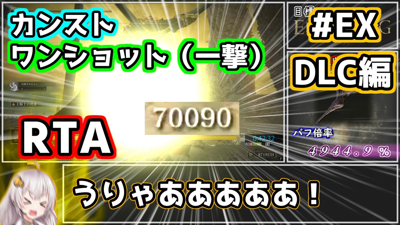 RTA第5弾のDLC編です。<br>ワンショット(一撃)で道中のボスを倒し、本編クリア後から、DLCラスボスを撃破するまでのRTAです。<br><br>・エルデンリングの本編及びDLCのネタバレを含みます。(ちょっと夜の方の話もします)<br>・本編クリア後の状態から、DLCラスボス撃破までのRTAです。<br>・カンスト難易度(8周目以降)の本編クリアを目指します。<br>・「一撃」や「ボス」の定義にだいぶ勝手な解釈を含みます。<br>・レベルは普通に上げてます。<br>・倒す必要のないボス(接ぎ木の貴公子など)とは戦いません。<br>・biim兄貴リスペクト動画です。<br>・VOICEROID・A.I.VOICEなどを使用しています。<br>・ver1.16.1でのプレイ動画です。<br>・プレイはガバガバです。<br>・タイトルで分かると思いますけど、だいたいまともに戦わないよ!<br><br><br><br><span style="font-size: 16px;"><strong>本編(1/1)→<a href="https://www.nicovideo.jp/watch/sm45758679" class="watch">sm45758679</a><br><br>解説なし版→</strong></span><br><br>前回のレベル1カンストDLCラスボス撃破RTA→<a href="https://www.nicovideo.jp/watch/sm44946575" class="watch">sm44946575</a><br>前々回のレベル1カンストでDLCをさんぽしたいあかりちゃん→<a href="https://www.nicovideo.jp/series/488064" target="_blank" rel="noopener">series/488064</a><br>前々々回のレベル1カンストノーヒットRTA→<a href="https://www.nicovideo.jp/watch/sm44009253" class="watch">sm44009253</a><br>前々々々回のレベル1カンスト全追憶RTA→<a href="https://www.nicovideo.jp/watch/sm43371207" class="watch">sm43371207</a><br>前々々々々回のレベル1カンストRTA→<a href="https://www.nicovideo.jp/watch/sm42178086" class="watch">sm42178086</a><br>前々々々々々回のレベル1攻略解説→<a href="https://www.nicovideo.jp/watch/sm41849179" class="watch">sm41849179</a><br>前々々々々々々回のシリーズのレベル1で王になりたいあかりちゃん→<a href="https://www.nicovideo.jp/series/328309" target="_blank" rel="noopener">series/328309</a><br>前々々々々々々々回のシリーズの知力しか上げられないゆかりさん→<a href="https://www.nicovideo.jp/series/312150" target="_blank" rel="noopener">series/312150</a>