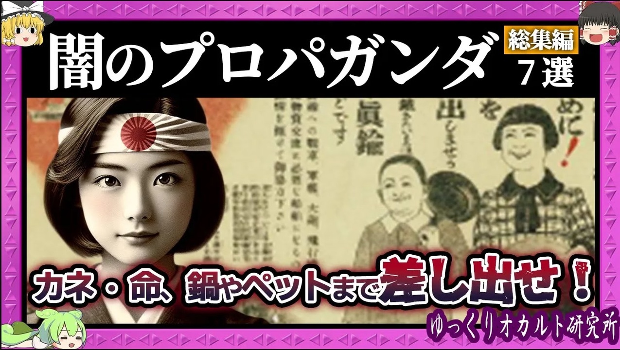 不気味なものから苦笑せざるを得ないものまで、世相を反映したプロパガンダの数々。 【 ゆっくり解説 プロパガンダ 総集編 】シリーズとしてゆっくり茶番劇スタイルでお届けします。 00:00 目次 00:21 世界のプロバカンダポスター 08:19 日本のプロパガンダポスター 日本スゴイ編 19:42 日本のプロパガンダポスター 国民精神総動員運動編 29:39 日本のプロパガンダポスター 大日本帝国求人ポスター編 40:23 日本のプロパガンダポスター 金貸せ編 51:14 日本のプロパガンダポスター 鍋からペットまで徴収編 1:00:58 お金貰ってデマ拡散 ビジネス右翼編 1:09:17 まとめ プロパガンダは、特定の意見や立場を広め、支持を得るために情報を操作して広める手法です。これには、メディア、政治的メッセージ、広告など様々な形式があり、聴衆の感情や認識に影響を与えることを目的としています。歴史的には、プロパガンダは政府や組織によって使われ、公共の意見を形成または変化させるために利用されてきました。この手法は、情報を提供すると同時に、特定の視点を推進するための選択的な提示や誇張が伴うことが多いです。 ★関連動画はこちらから! <a href="https://youtube.com/@ゆっくりオカルト研究所" target="_blank" rel="noopener nofollow">https://youtube.com/@ゆっくりオカルト研究所</a> ★気まずすぎる動画はメンバーシップで…→ <a href="https://www.youtube.com/channel/UCirxRvghHohWx9iWLKYuceg/join" target="_blank" rel="noopener nofollow">https://www.youtube.com/channel/UCirxRvghHohWx9iWLKYuceg/join</a> ★規制されてしまった動画・オリジナル動画等あり!裏オカ研(サブスク):再生リスト「裏のアレ」→ <a href="https://mediable.jp/playlists/c98143a6-4a92-4337-9325-e15eadaab6e2" target="_blank" rel="noopener nofollow">https://mediable.jp/playlists/c98143a6-4a92-4337-9325-e15eadaab6e2</a> #ゆっくり解説#プロパガンダ#第二次世界大戦#太平洋戦争#戦争