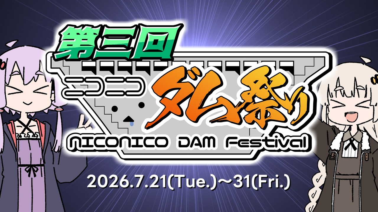 第3回ニコニコダム祭り!<br>ダム動画が増えてほしいので「ニコニコダム祭り」と称してソフトウェアトーク投稿祭を開催します!<br>今年から夏開催!7月末の森と湖に親しむ旬間に合わせて開催します!<br>みんなダムに行きましょう!<br><br><span style="font-size: 18px;">【企画概要】<br>●投稿期間</span><br><span style="color: #ff0000; font-size: 18px;"><strong>2026.7.21(火)~2026.7.31(金)</strong></span><br><span style="font-size: 18px;">●レギュレーション<br>・ダムに関する動画であること(ダム動画ならなんでもOK!)<br>・ソフトウェアトークを使用すること<br>●参加方法<br>・「ニコニコダム祭り」をタグロック</span><br><br>●お問い合わせ<br>・主催Twitter→<a href="https://twitter.com/GeorgiaDamski" target="_blank" rel="noopener nofollow">https://twitter.com/GeorgiaDamski</a> までリプを飛ばしてください。<br>●主催からのサポート<br>・投稿祭ロゴ→<a href="https://commons.nicovideo.jp/works/nc455093" target="_blank" rel="noopener">nc455093</a><br>・ニコニコダム祭りMAP Ver.3.0(2026.1.1)<br>→<a href="https://www.google.com/maps/d/u/1/edit?mid=1aflbVmvKXTMjM8eZM6Ea_OAX-YtNetM&usp=sharing" target="_blank" rel="noopener nofollow">https://www.google.com/maps/d/u/1/edit?mid=1aflbVmvKXTMjM8eZM6Ea_OAX-YtNetM&usp=sharing</a><br><br>お借りした素材<br>立ち絵:ぺぺち様<br>BGM: 騒音のない世界様<br>その他: コンテンツツリー参照<br><br>(11:55 2026/01/01)軽微なミスがあったので修正しました。うっふーん。<br><br><a target="_blank" href="https://qa.nicovideo.jp/faq/show/19424?site_domain=default" style="font-size: 13px;color: #657586; text-decoration: underline; line-height: 1.4">この動画は投稿者によって修正されました</a>