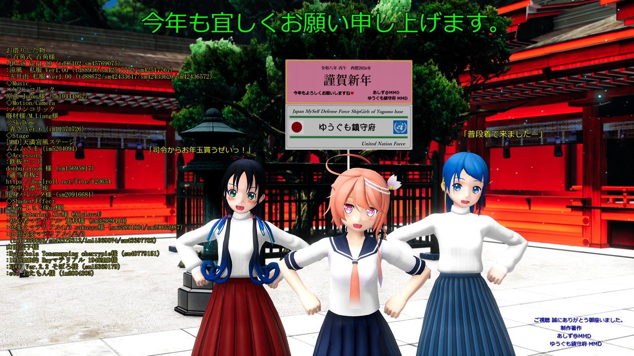 明けましておめでとう御座います?<br>今年もよろしくお願い申し上げます。<br>あしず @ MMD/ゆうぐも鎮守府MMD<br>2026/01/01/1620(木)投稿→2026/01/01/1630前後<br>7ヶ月続いた大水着大会は暫くお休みになるかな♥<br>◇広告誠にありがとう御座いました<br>xf108 様 さどんです♪ 様 Green .g 様 百角 様 たま 様 <br>お借りした物<br>○百角式 百角様<br>:伊-58 Ver1.00(<a href="https://3d.nicovideo.jp/works/td96102" target="_blank" rel="noopener">td96102</a>/<a href="https://www.nicovideo.jp/watch/sm45769075" class="watch">sm45769075</a>)<br>:涼風 私服 Ver1.00(<a href="https://3d.nicovideo.jp/works/td88936" target="_blank" rel="noopener">td88936</a>/<a href="https://www.nicovideo.jp/watch/sm42517772" class="watch">sm42517772</a>/<a href="https://www.nicovideo.jp/watch/sm42517767" class="watch">sm42517767</a>)<br>:五月雨 私服 Ver1.00(<a href="https://3d.nicovideo.jp/works/td88672" target="_blank" rel="noopener">td88672</a>/<a href="https://www.nicovideo.jp/watch/sm42433617" class="watch">sm42433617</a>/<a href="https://www.nicovideo.jp/watch/sm42433620" class="watch">sm42433620</a>/<a href="https://www.nicovideo.jp/watch/sm42436572" class="watch">sm42436572</a>)<br>◇Music<br>:メランコリック <br>原曲 Junky様(<a href="https://www.nicovideo.jp/watch/sm10444862" class="watch">sm10444862</a>)<br>◇Motion/Camera<br>:メランコリック<br>廢材様/M.Liang様<br>◇SkyDome<br>:青空 Ver.6(<a href="https://seiga.nicovideo.jp/seiga/im11371726" target="_blank" rel="noopener">im11371726</a>)<br>◇Stage<br>[MMD]天満宮風ステージ<br>ムムムさま(<a href="https://seiga.nicovideo.jp/seiga/im5204091" target="_blank" rel="noopener">im5204091</a>)<br>◇Accessory<br>:鉄板セット<br>donburiroom 様(<a href="https://www.nicovideo.jp/watch/sm15695817" class="watch">sm15695817</a>)<br>:適当看板2<br><a href="https://bowlroll.net/file/123654" target="_blank" rel="noopener nofollow">https://bowlroll.net/file/123654</a><br>:空中に漂う埃 <br>化身バレッタ様(<a href="https://www.nicovideo.jp/watch/sm20916681" class="watch">sm20916681</a>)<br>◇Shader/Effect<br>○Ray-1.5.2(Rui様)<br>:Xiu-Material Xiu様 @XiuLuvzU<br>:初心者マテリアル 更科様(<a href="https://www.nicovideo.jp/watch/sm32929410" class="watch">sm32929410</a>)<br>:色変えマテリアル1/3 sakusya様(<a href="https://www.nicovideo.jp/watch/sm35891864" class="watch">sm35891864</a>/<a href="https://www.nicovideo.jp/watch/sm39035987" class="watch">sm39035987</a>)<br>:山田改変マテリアル1/2/3 <br>(<a href="https://seiga.nicovideo.jp/seiga/im11255856" target="_blank" rel="noopener">im11255856</a>/<a href="https://www.nicovideo.jp/watch/sm43379312" class="watch">sm43379312</a>/<a href="https://seiga.nicovideo.jp/seiga/im11369874" target="_blank" rel="noopener">im11369874</a>/<a href="https://www.nicovideo.jp/watch/sm43397782" class="watch">sm43397782</a>)<br>山田淀子様<br>:Hyperbola Tonemapping cherrypie様(<a href="https://www.nicovideo.jp/watch/sm40779151" class="watch">sm40779151</a>)<br>:1948MMD的 Rayマテリアル 1948MMD様<br>:XDOF Ver.2.2 そぼろ様(<a href="https://www.nicovideo.jp/watch/sm15369179" class="watch">sm15369179</a>)<br>:etc おたもん様(<a href="https://seiga.nicovideo.jp/seiga/im2004305" target="_blank" rel="noopener">im2004305</a>)<br>YouTube 4k 2160p(60f)<br><a href="https://youtu.be/jn9BItRyC2U" target="_blank" rel="noopener nofollow">https://youtu.be/jn9BItRyC2U</a>