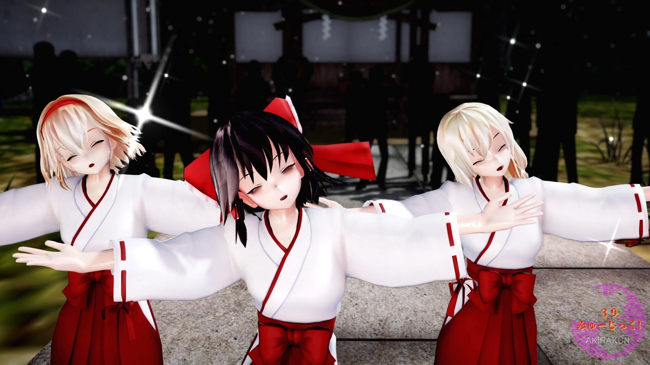 明けましておめでとうございます。<br>3人に踊ってもらいました。この作品は「東方project」の2次創作です。<br>現在、作成リクエストは受け付けていません。<br><br><br>【楽曲】:「39みゅーじっく!」:みきとP 様 <a href="https://www.nicovideo.jp/watch/sm29145868" class="watch">sm29145868</a><br><br>【モーション】:Thekinggogeds 様 <a href="https://youtu.be/r2H2KH3JZxc" target="_blank" rel="noopener nofollow">https://youtu.be/r2H2KH3JZxc</a><br><br>【カメラ】:QwdV19 様 <a href="https://www.nicovideo.jp/watch/sm33529009" class="watch">sm33529009</a><br>※モーション・カメラは、一部改変しています。<br><br>■ステージ<br>博麗神社mk2:NuKasa様 <a href="https://seiga.nicovideo.jp/seiga/im6465125" target="_blank" rel="noopener">im6465125</a><br><br>■モデル<br>霊夢、魔理沙、アリス:にがもん様、しえら様<br>・衣装:赤井 結(巫女衣装):IVatu様 <a href="https://seiga.nicovideo.jp/seiga/im6435518" target="_blank" rel="noopener">im6435518</a><br>霊夢の大幣:あきら様 <a href="https://www.nicovideo.jp/watch/sm20098717" class="watch">sm20098717</a><br>撮影モブシルエット:アダムスミス様 <a href="https://www.nicovideo.jp/watch/sm36511585" class="watch">sm36511585</a><br>イーゼルと黒板:そうめん様 <a href="https://seiga.nicovideo.jp/seiga/im2790690" target="_blank" rel="noopener">im2790690</a>(改変)<br><br>■エフェクト<br>Ray-mmd-1.5.2:Rui様<br>初心者マテリアル:さらしな様<br>肌マテリアル:MARUSU様<br>AutoLuminous4:そぼろ様<br>空中に漂う埃:化身バレッタ様<br>ikBokeh_v020a:ikeno様<br>ScreenTex改変 動く入射光:のりしお様<br><br><br>MikuMikuDance:樋口優様<br>MMEffect :舞力介入P様<br>PMDE、PmxE:極北P様<br>AviUtl :KENくん様<br>・Aviutl + x264guiExでエンコード:rigaya様<br>Ut Video Codec suite:ゆーむP様<br>上海アリス幻楽団・東方project(ZUN様)<br><br><br>mylist ③<a href="https://www.nicovideo.jp/mylist/75586824" target="_blank" rel="noopener">mylist/75586824</a> ② <a href="https://www.nicovideo.jp/mylist/72970530" target="_blank" rel="noopener">mylist/72970530</a> ① <a href="https://www.nicovideo.jp/mylist/63690967" target="_blank" rel="noopener">mylist/63690967</a> 旧 <a href="https://www.nicovideo.jp/mylist/61238351" target="_blank" rel="noopener">mylist/61238351</a><br><br> ※動画の転載は禁止です。<br>Attention,Unauthorized reproduction prohibited!!
