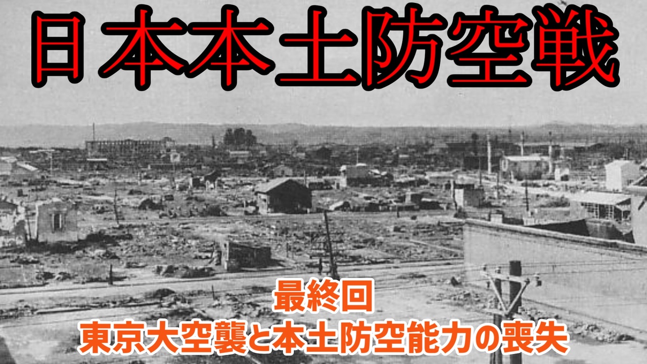 【参加メンバー】 <br>解説:ZEKE22 聞き手:メスキイタ <br><br>1945年3月10日 <br>この日は日本本土爆撃の転換点となりました。<br>米軍の伝統とも言えた高高度爆撃を捨て、低空での焼夷弾爆撃の効果は絶大で、東京は火の海となり以降、横浜、名古屋、大阪も同じ運命をたどります。<br>4月には押し寄せるB-29に護衛のP-51も本土に飛来してくるようになり、日本軍の防空戦闘機部隊は限界を迎えていくことになります。<br>今回はそんな東京大空襲から終戦までの攻防を見ていきます。<br><br> ↓元配信↓<br> <a href="https://www.youtube.com/watch?v=x1q3y0cP2fA" target="_blank" rel="noopener nofollow">https://www.youtube.com/watch?v=x1q3y0cP2fA</a> <br><br>アイコン作者様:akihiyo様<br>BGM:クラシック名曲サウンドライブラリー<a href="http://classical-sound.seesaa.net/" target="_blank" rel="noopener nofollow">http://classical-sound.seesaa.net/</a><br> 動画制作:研究主任(<a href="https://www.nicovideo.jp/user/3565318" target="_blank" rel="noopener">user/3565318</a>)<br><br> 動画のマイリスト(<a href="https://www.nicovideo.jp/mylist/60472626" target="_blank" rel="noopener">mylist/60472626</a>)