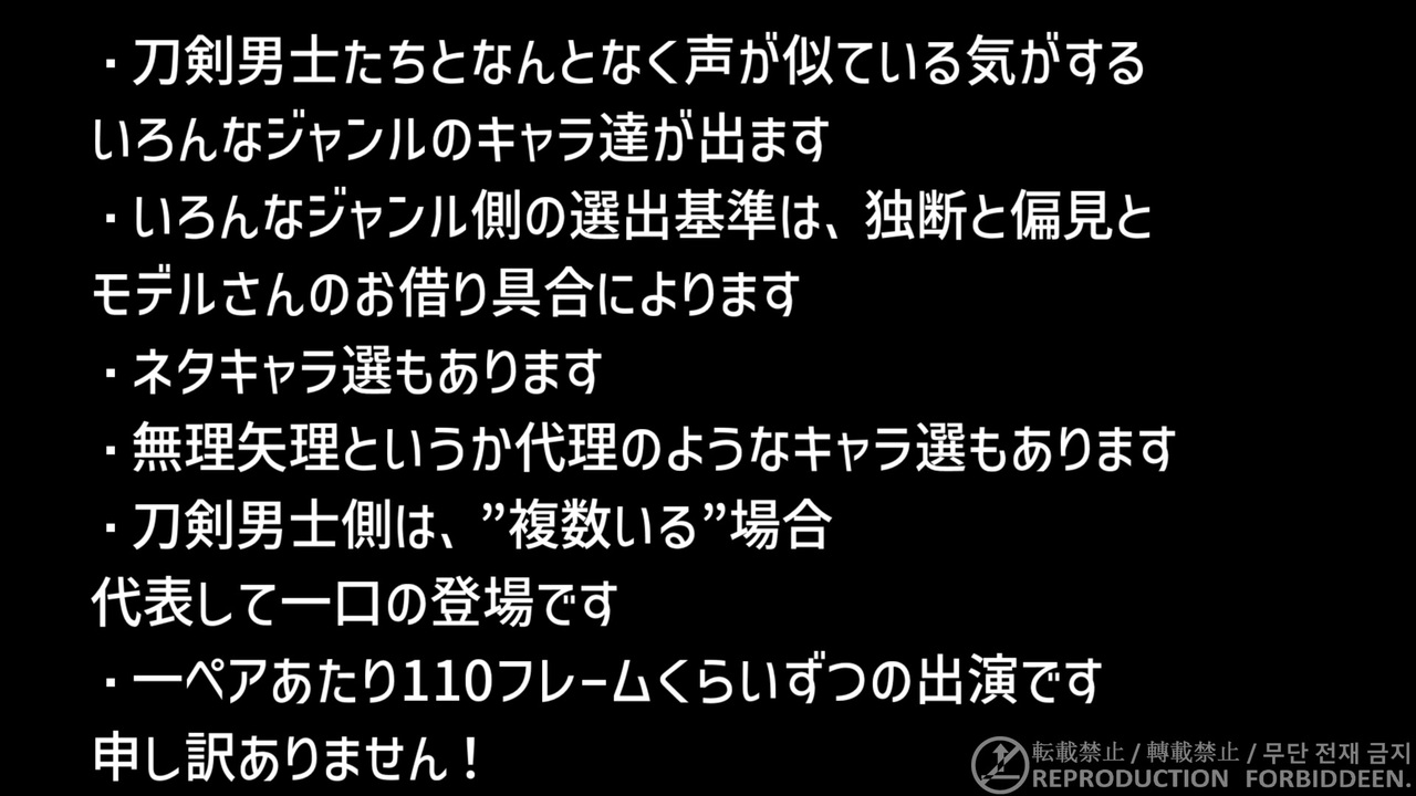 11周年おめでとうございます!<br><br>※諸版の理由で踊ってないモデルさんがいます<br>※いつもの服ではないモデルさんがいます<br>※その他、注意事項は動画冒頭参照<br><br><u>(いないとは思いますが)</u><span style="color: #ff0000; font-size: 16px;"><strong><u>無断転載、AI学習禁止。<br>神様たちが素材は全て無料で配布してくださっているので、<br>是非自分で作ってください!<br>Do not use my work without permission.</u></strong></span><br><br>・当方、とてもおっちょこちょいなので、貫通などの見逃しがあったらすみません。<br>・どうにもならなかった箇所もあります。<br><br>素晴らしい素材を活かしきれていない動画ですが、少しでもニコニコしていただけたら幸いです。<br><br><span style="font-size: 16px;"><strong><u>※ジャンルがかなり多彩に渡るので、刀剣乱舞以外のジャンルのタグやキャラクターのタグはつけないで下さい(キリがないので...)</u></strong></span><br><br>©NHN PlayArt Corp. ©DWANGO Co., Ltd. <br>他クレジットは、動画内・コンテンツツリー・こちら→<a href="https://simblo.net/u/d7caU4/post/698801" target="_blank" rel="noopener nofollow">https://simblo.net/u/d7caU4/post/698801</a> ヘ