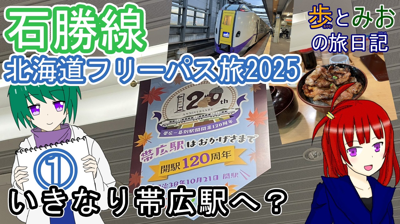 あけましておめでとうございます!今年もよろしくお願いします。<br><br>帯広駅120周年であるためあえて帯広へ降りていきました。<br>今度来たときは競馬を見に行きたいです。<br><br><br><br>【使用BGM】<br>DOVA-SYNDROME<br><a href="https://dova-s.jp" target="_blank" rel="noopener nofollow">https://dova-s.jp</a><br>騒音のない世界<br><a href="https://noiselessworld.net/sm43685799" target="_blank" rel="noopener nofollow">https://noiselessworld.net/sm43685799</a><br>【効果音】<br>効果音ラボ<br><a href="https://soundeffect-lab.info" target="_blank" rel="noopener nofollow">https://soundeffect-lab.info</a><br>【キャラクター提供】<br>かしみや<br>(<a href="https://www.nicovideo.jp/user/74514002" target="_blank" rel="noopener">user/74514002</a>)<br><br>【出演】<br>西谷歩 CV:花隈千冬( CeVIO AI)<br>戸田みお CV:小春六花( CeVIO AI)<br>北宮火乃香 CV:黄琴海月(MY COEIROINK)<br>函館ほくと