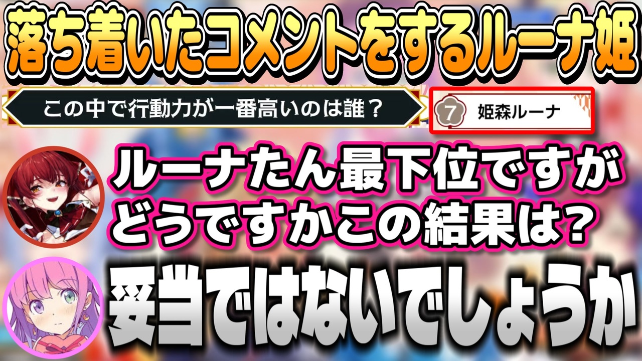 チャプター<br><a href="#" class="seekTime" data-seekTime="00:00" onclick="seekNicoPlayer('#00:00'); return false;">#00:00</a> 格付けしあうホロメンたち<br><a href="#" class="seekTime" data-seekTime="01:04" onclick="seekNicoPlayer('#01:04'); return false;">#01:04</a> 一番ツンデレだと思うのは誰?<br><a href="#" class="seekTime" data-seekTime="03:20" onclick="seekNicoPlayer('#03:20'); return false;">#03:20</a> 一番相手の心を開くのが上手いのは誰?<br><a href="#" class="seekTime" data-seekTime="05:34" onclick="seekNicoPlayer('#05:34'); return false;">#05:34</a> 一番仮面が分厚いのは誰?<br><a href="#" class="seekTime" data-seekTime="06:45" onclick="seekNicoPlayer('#06:45'); return false;">#06:45</a> 一番甘えん坊なのは誰?<br><a href="#" class="seekTime" data-seekTime="08:15" onclick="seekNicoPlayer('#08:15'); return false;">#08:15</a> この中で行動力が一番高いのは誰?(サムネ)<br><a href="#" class="seekTime" data-seekTime="09:45" onclick="seekNicoPlayer('#09:45'); return false;">#09:45</a> この中で一番落ち着いているのは誰?<br><br>【元動画】<br>【#新春3期生24時間配信】新春あけおめ!ホロライブ24時間ぶっ通し生配信!4枠目【ホロライブ/兎田ぺこら/不知火フレア/白銀ノエル/宝鐘マリン】<br><a href="https://youtu.be/iWLmuobqhXo" target="_blank" rel="noopener nofollow">https://youtu.be/iWLmuobqhXo</a><br><br>【チャンネル】<br>Marine Ch. 宝鐘マリン<br><a href="https://www.youtube.com/@HoushouMarine" target="_blank" rel="noopener nofollow">https://www.youtube.com/@HoushouMarine</a><br>Pekora Ch. 兎田ぺこら<br><a href="https://www.youtube.com/@usadapekora" target="_blank" rel="noopener nofollow">https://www.youtube.com/@usadapekora</a><br>Flare Ch. 不知火フレア<br><a href="https://www.youtube.com/@ShiranuiFlare" target="_blank" rel="noopener nofollow">https://www.youtube.com/@ShiranuiFlare</a><br>Noel Ch. 白銀ノエル<br><a href="https://www.youtube.com/@ShiroganeNoel" target="_blank" rel="noopener nofollow">https://www.youtube.com/@ShiroganeNoel</a><br>Suisei Channel<br><a href="https://www.youtube.com/@HoshimachiSuisei" target="_blank" rel="noopener nofollow">https://www.youtube.com/@HoshimachiSuisei</a><br>Luna Ch. 姫森ルーナ<br><a href="https://www.youtube.com/@HimemoriLuna" target="_blank" rel="noopener nofollow">https://www.youtube.com/@HimemoriLuna</a><br>Nene Ch.桃鈴ねね<br><a href="https://www.youtube.com/@MomosuzuNene" target="_blank" rel="noopener nofollow">https://www.youtube.com/@MomosuzuNene</a><br>