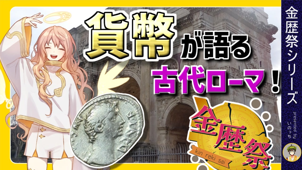 貨幣を通して古代ローマの世界を観ていきましょう! <br><br>動画制作に御協力いただいた方々の作品 <br>●いたるさん:漫画「FESTINA LENTE~ゆっくり急げ~ 初代ローマ皇帝アウグストゥス物語 」 <br> <a href="https://gakcomic.gakken.jp/comic/page-manga_rome/" target="_blank" rel="noopener nofollow">https://gakcomic.gakken.jp/comic/page-manga_rome/</a> <br>●サミャーヴォさん:最新作「豊かなるアカリアは島々に新たなるローマ都市を建設する」 <a href="https://www.nicovideo.jp/watch/sm45781978" class="watch">sm45781978</a><br> <br><span style="font-size: 18px;"><strong>金歴祭マイリスト → <a href="https://www.nicovideo.jp/mylist/78958048" target="_blank" rel="noopener">mylist/78958048</a></strong></span><br> <br><a href="#" class="seekTime" data-seekTime="0:00" onclick="seekNicoPlayer('#0:00'); return false;">#0:00</a> プロローグ・導入 <a href="#" class="seekTime" data-seekTime="0:16" onclick="seekNicoPlayer('#0:16'); return false;">#0:16</a> 第1章「図像」 <a href="#" class="seekTime" data-seekTime="2:25" onclick="seekNicoPlayer('#2:25'); return false;">#2:25</a> 第2章「文字」<br><a href="#" class="seekTime" data-seekTime="4:12" onclick="seekNicoPlayer('#4:12'); return false;">#4:12</a> 第3章「質」 <a href="#" class="seekTime" data-seekTime="8:00" onclick="seekNicoPlayer('#8:00'); return false;">#8:00</a> 参考文献、使用素材、エンディング<br><br>●いのっちHP! → <a href="https://inocchi-douga.com/" target="_blank" rel="noopener nofollow">https://inocchi-douga.com/</a><br>●えっくす <a href="https://twitter.com/inocchi_0515" target="_blank" rel="noopener nofollow">https://twitter.com/inocchi_0515</a><br> <br>●世界史べーた(仮)関連<br>公式チャンネル! <a href="https://www.youtube.com/c/sekaishibeta" target="_blank" rel="noopener nofollow">https://www.youtube.com/c/sekaishibeta</a><br>公式HP! <a href="https://sekaishi-beta.com" target="_blank" rel="noopener nofollow">https://sekaishi-beta.com</a><br>公式X(ツイッター)! <a href="https://twitter.com/sekaishibeta" target="_blank" rel="noopener nofollow">https://twitter.com/sekaishibeta</a><br><br><a target="_blank" href="https://qa.nicovideo.jp/faq/show/19424?site_domain=default" style="font-size: 13px;color: #657586; text-decoration: underline; line-height: 1.4">この動画は投稿者によって修正されました</a>