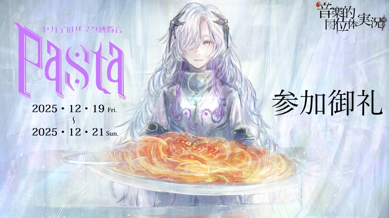 2025年12月19日~21日に開催しました「セカイのパスタ博覧会」<br><span style="color: #ff0000;">参加された皆様、本当にありがとうございました。</span><br>観ていてお腹が空いて仕方ない、最高の動画が集まったと感じています。<br>下段マイリストに参加動画を纏めておりますので、是非ともご覧ください!<br><u>(※この閉会式動画の投稿を持って、参加動画マイリストの更新を終了します)</u><br><br><span style="color: #ff0000; font-size: 16px;"><strong>参加動画マイリスト</strong></span><span style="font-size: 16px;"><strong>:<a href="https://www.nicovideo.jp/mylist/79107288" target="_blank" rel="noopener">mylist/79107288</a></strong></span><br><br>キービジュアル制作:ながいぱすた様 <a href="https://x.com/long_P_aster" target="_blank" rel="noopener nofollow">https://x.com/long_P_aster</a><br>投稿祭用ロゴ制作:メイトー様 <a href="https://x.com/pudding_vwp" target="_blank" rel="noopener nofollow">https://x.com/pudding_vwp</a><br><br>使用ツール:NodoAme(作:いぬいぬGames様 <a href="https://www.nicovideo.jp/watch/sm98013232" class="watch">sm98013232</a>)<br>演技指導:すずきつづみ(CeVIO AI)<br>シリーズロゴ:misho様<br>音楽的同位体KV:らいす様 <a href="https://twitter.com/rice01200120" target="_blank" rel="noopener nofollow">https://twitter.com/rice01200120</a><br>BGM:騒音の無い世界様(コンテンツツリー参照)