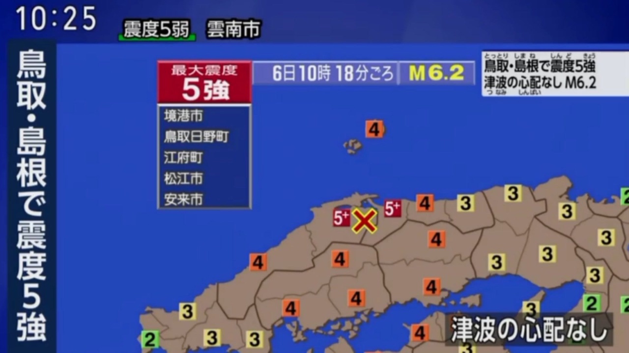 2026年1回目の緊急地震速報(警報)<br>※短縮編集しています<br><br>震度5弱<br> 鳥取県米子市 日吉津村 鳥取南部町 伯耆町 日南町<br> 島根県雲南市<br>震度4<br> 鳥取県大山町 倉吉市 湯梨浜町 北栄町<br> 島根県出雲市 奥出雲町 浜田市 大田市 川本町 邑南町 海士町<br> 岡山県新見市 真庭市 新庄村 岡山北区 岡山南区 倉敷市 笠岡市 井原市 浅口市<br> 早島町 里庄町 矢掛町<br> 広島県庄原市 北広島町 三原市 尾道市 福山市 神石高原町 広島安芸区 竹原市 江田島市<br> 府中町 大崎上島町<br> 香川県高松市 丸亀市 坂出市 観音寺市 三豊市 多度津町<br> 愛媛県今治市 四国中央市 上島町 松山市 東温市<br><br>データ出典:<a href="https://earthquake.tenki.jp/bousai/earthquake/detail/2026/01/06/2026-01-06-10-18-49.html" target="_blank" rel="noopener nofollow">https://earthquake.tenki.jp/bousai/earthquake/detail/2026/01/06/2026-01-06-10-18-49.html</a><br><br>参考:引き金の地震はこれかも?(独自研究注意)<br>2026年01月05日 16時43分頃 震度1<br>北緯 35.3度 東経 133.2度<br>M3.2 約10km<br><a href="https://earthquake.tenki.jp/bousai/earthquake/detail/2026/01/05/2026-01-05-16-43-45.html" target="_blank" rel="noopener nofollow">https://earthquake.tenki.jp/bousai/earthquake/detail/2026/01/05/2026-01-05-16-43-45.html</a><br><br>