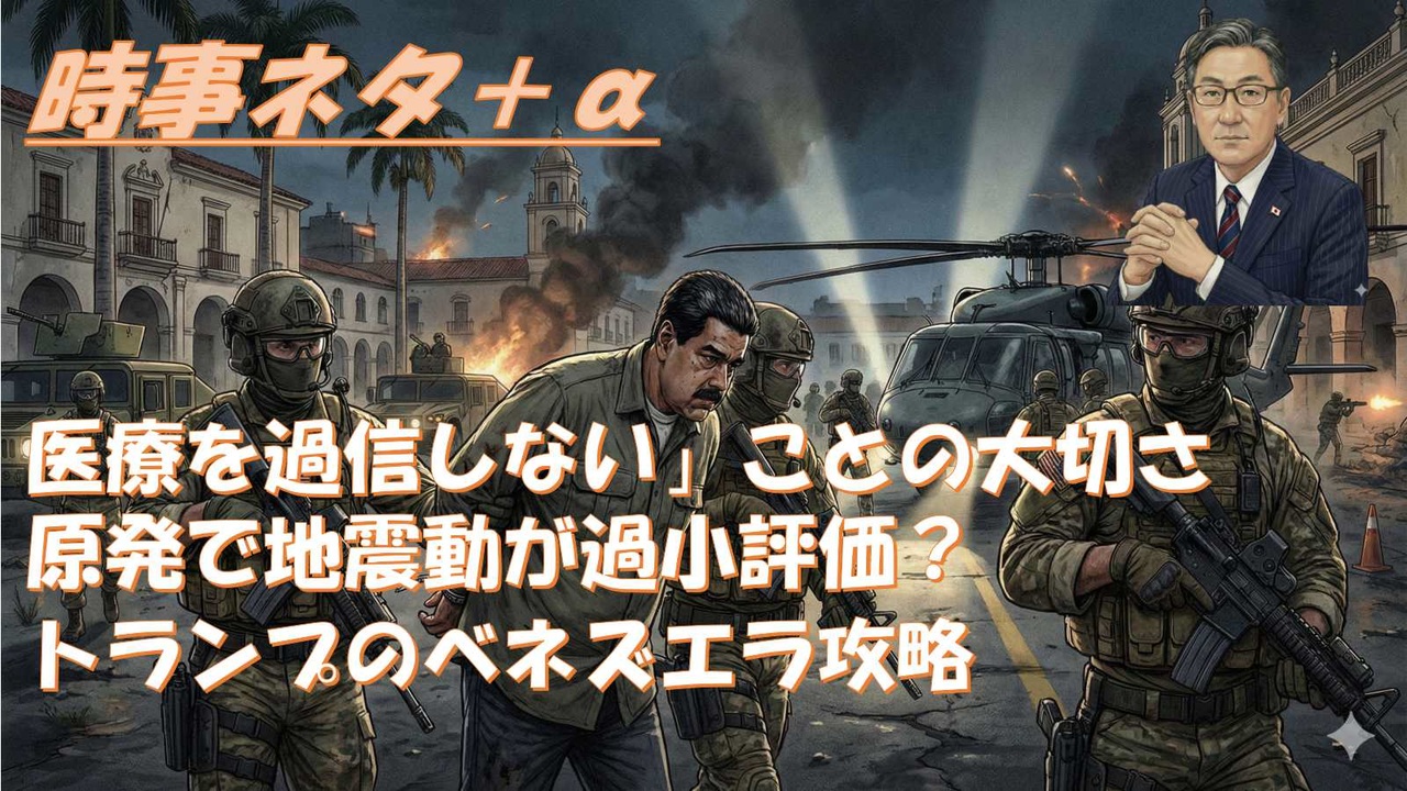 ◆鳥集徹<br>#124「医療を過信しない」ことの大切さ ~新年にあたって読者に伝えたいこと~<br><br><br>◆失敗小僧<br>トランプ大統領ベネズエラにアメリカ軍が進撃しマドゥロ大統領を拘束について<br><br>トランプ大統領がベネズエラにケンカを売った理由<br><br>◆郷原信郎<br>【新年早々、トランプ政権「国際法違反のベネズエラ攻撃」に複雑な背景、高市首相はどう対応する!?】郷原信郎の「日本の権力を斬る!」#485<br><br>◆深田萌絵<br>米軍がベネズエラ大統領を拘束!トランプが狙う資源と新運営体制!・・・次はどこだ?<br><br>中露兵器は無能!?ベネズエラの防空システムは何故機能しなかったか。<br><br><br>原子力規制委員会への説明とは異なる方法で地震動を“過少”評価した疑い 中部電力・浜岡原発 意図的に“平均に最も近い波ではないものを代表波”として選定 第三者委員会を設置へ<br><br>トランプ氏、不服従ならベネズエラ再攻撃=暫定大統領は「米国と協力」表明―マドゥロ氏、6日出廷<br><br>◆リチャード・コシミズ<br>謹賀新年<br>2026年は日米中、大波乱の都市。<br>中国の体制崩壊化?<br>米国デフォルトの危機も。<br>日本が世界恐慌の引き金をひくか?<br>米中が零落し速攻で立ち直った日本が独立独歩、再生して世界を牽引する<br>日本中心のCP・TPPが米中抜きの新世界秩序を構築する。<br><br>トランプ米国は、ベネゼエラ攻撃自爆、ドル崩壊へ<br><br>【コメント】↓<br><br>権兵衛さんは高市嫌いの為に高市下げを多用しますが、これは地元奈良かどこかの演説会場。「美しい日本を守る為に先人が命を投げ出して来た」と演説していた→<br><br>→と思われます。このように、Xポスト者に悪意があると真逆の解釈となったりします。それから石破氏をオールドメディアが多様してるのにも気を付けた方が→<br><br>→良いと私には見えます。今の日本メディアは中韓側が大勢となってるのでDS側とも一概には言えず、浅村氏の言うメディアの逆が正解とは言い難い状況。→<br><br>→だから高市で合ってるんだとも思ってはいません。ただ、メディアは洗脳装置のウエイトは大きいと思っているので、今は逆に思っているのが私の現状です。<br><br>文面だけ見ても「子供の命を国のために投げ出す」なんて解釈とてもできないんだけど? ⇒<br><br>⇒大人が子供を始めとした未来世代のために時には命をも投げ出す、ってことを高市さんは言いたいんでしょう<br><br>モデルナCEOが2019年に10万ワクチン作った パンデミック来るの知ってたとの記事も<br><br>中国はハニトラと窃盗かな