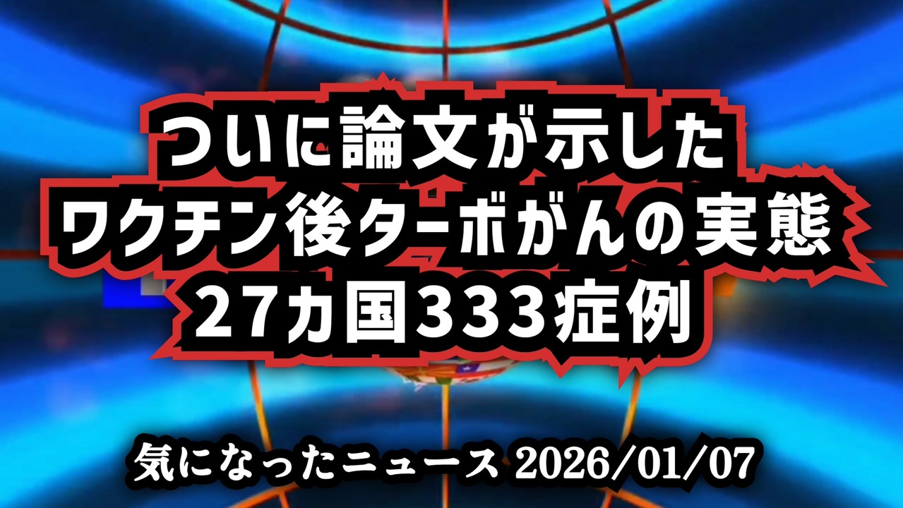 ◆査読済み論文が示す「ターボ癌」シグナル|Oncotargetが集約した27カ国333症例と封じられる科学<br><br>ついに論文が示したワクチン後ターボがんの実態 ~ 27カ国333症例<br><br> あらすじ<br>世界27カ国で報告されたがん急速進行という共通の現象。ターボ癌と呼ばれる事例は、COVIDワクチン問題やmRNAワクチンの安全性と無関係なのか。査読済み研究と医学論文解説をもとに、ワクチン後がん、免疫監視の異変、スパイクタンパクの関与という論点が浮かび上がる。科学と検閲、言論封鎖が指摘される中で、今あらためて問われるのは、何が語られ、何が語られてこなかったのかという事実そのものだった。<br><br>◆今回の台本&詳細<a href="https://keiichiro8140.hatenablog.com/entry/26010666333999" target="_blank" rel="noopener nofollow">https://keiichiro8140.hatenablog.com/entry/26010666333999</a><br><br>◆これまでの動画<a href="https://x.gd/sPXoJ" target="_blank" rel="noopener nofollow">https://x.gd/sPXoJ</a><br><br>◆もしも(BAN)の時のためのマイリンク集<a href="https://lit.link/K-16_News44" target="_blank" rel="noopener nofollow">https://lit.link/K-16_News44</a><br><br>ご覧いただきありがとうございます<br>m(_ _)m<br><br>気になったニュース 2026/01/07<br><br />著作権、肖像権に配慮して作成しております。<br><br>◆気になったニュースの台本!?<br>メモ代わりに作った台本をそのままあげてます<br><a href="https://keiichiro8140.hatenablog.com/." target="_blank" rel="noopener nofollow">https://keiichiro8140.hatenablog.com/.</a><br><br><br>ここからはシリーズ紹介<br><br><br>◆ ワクチン解毒・デトックス<br><a href="https://x.gd/fZweg" target="_blank" rel="noopener nofollow">https://x.gd/fZweg</a><br><br>◆ウイリアム・マキス博士のがん治療(イベルメクチン・フェンベンダゾール等)<br><a href="https://x.gd/AtFYS" target="_blank" rel="noopener nofollow">https://x.gd/AtFYS</a><br><br>◆予防接種健康被害救済制度<br><a href="https://x.gd/0xK9x" target="_blank" rel="noopener nofollow">https://x.gd/0xK9x</a><br><br>◆気になったニュース #1501~<br><br>◆ 【ショートver】気になったニュース<br><a href="https://x.gd/7MxXC" target="_blank" rel="noopener nofollow">https://x.gd/7MxXC</a><br><br>◆ 気になったニュース #1001~<br><a href="https://x.gd/Lp8gv" target="_blank" rel="noopener nofollow">https://x.gd/Lp8gv</a><br><br>◆ 気になったニュース #501~<br><a href="https://x.gd/EmbS4" target="_blank" rel="noopener nofollow">https://x.gd/EmbS4</a><br><br>◆ 気になったニュース #1~#500<br><a href="https://x.gd/uPhNb" target="_blank" rel="noopener nofollow">https://x.gd/uPhNb</a><br><br>◆ X(旧Twitter)・テレグラムで気になった情報<br><a href="https://x.gd/YG6FT" target="_blank" rel="noopener nofollow">https://x.gd/YG6FT</a><br><br>◆ 日比谷5万人パレードデ⚪生放送アーカイブ動画<br><a href="https://x.gd/3CHJv" target="_blank" rel="noopener nofollow">https://x.gd/3CHJv</a><br><br>◆日比谷5万人パレード⚪モのマイリスト作ってみました<br><a href="https://nico.ms/mylist/76828848?ref=sp_other" target="_blank" rel="noopener nofollow">https://nico.ms/mylist/76828848?ref=sp_other</a><br><br>◆3.30 令和の百姓⚪⚪<br><a href="https://www.nicovideo.jp/series/511791?ref=garage_share_other" target="_blank" rel="noopener nofollow">https://www.nicovideo.jp/series/511791?ref=garage_share_other</a><br><br>◆ 及川幸久さんの【XNEWS】シリーズ<br><a href="https://x.gd/3k78K" target="_blank" rel="noopener nofollow">https://x.gd/3k78K</a><br><br>◆これまでの動画<a href="https://x.gd/sPXoJ" target="_blank" rel="noopener nofollow">https://x.gd/sPXoJ</a><br><br>◆もしも(BAN)の時のためのマイリンク集<a href="https://lit.link/K-16_News44" target="_blank" rel="noopener nofollow">https://lit.link/K-16_News44</a><br><br>
