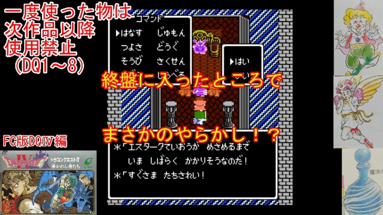 DQⅣの1周目、FCDQⅣ編part10です。<br>エスタークのフィールドグラフィック、どことなくブタあくま感がパない。<br>やはりプレイ経験値が少ない作品だと、色々やらかしてしまいますね。<br><br>前→<a href="https://www.nicovideo.jp/watch/sm45752625" class="watch">sm45752625</a><br>次→<a href="https://www.nicovideo.jp/watch/sm45817936" class="watch">sm45817936</a><br><br>YouTube版→<a href="https://youtu.be/3KSyRvUj8jM" target="_blank" rel="noopener nofollow">https://youtu.be/3KSyRvUj8jM</a><br><br>縛りルール(詳細はpart1参照)<br>①一度使った武器・防具・装飾品・道具・呪文・特技は<br> 次作品以降使用禁止。(売却も解禁扱い)<br><br> 一度使った職業(3,6,7)・仲間モンスター(5,6)・スカウトモンスター(8)は<br> 戦士(Ⅲ)、戦士(Ⅵ)のようにナンバリングで分類し次作品以降使用禁止。<br> また複数体加入できる仲間モンスターは一体まで。<br><br>②裏技、バグ技、全滅、逃走、おどかす禁止。<br> またダンジョン攻略とボス戦における状況再現禁止。<br><br>③ダンジョンとボス攻略は、全キャラのレベルを突入時、<br> 1周目は目標レベル+5。2周目は+10。3周目は+15まで。<br> ラスボスの目標レベルは45。裏ボスは50とする。<br>(目標レベルは各公式ガイドブックを参照)<br><br>④1周目はEDまで。2周目は裏ボス撃破まで。<br> 3周目は全てのボスを規定回数、規定ターン以内に倒す。<br>(回避可能なボスも倒し、闇ゾーマは3周全てで倒す)<br><br><br><span style="color: #262626;">※一部機種は互換機を使用してのプレイとなりますが、倍速機能やクイックセーブ・ロード、チートなどは一切使用しません。</span><br><br>※ネタバレ注意です<br><br>この動画で利用している株式会社スクウェア・エニックスを代表とする共同著作者が権利を所有する著作物及びスギヤマ工房有限会社が権利を所有する楽曲の転載・配布は禁止いたします。<br>(C) ARMOR PROJECT/BIRD STUDIO/SQUARE ENIX All Rights Reserved.<br>(C) SUGIYAMA KOBO (P) SUGIYAMA KOBO<br><br>AquesTalk2ライセンスID:AQTK2WINUSR23122185<br /><br><br>❤いいねを押していただけるとモチベーションと投稿速度が上がるので宜しくお願い致します!<br><br>作者ツイッター→ <a href="https://twitter.com/nig0117" target="_blank" rel="noopener nofollow">https://twitter.com/nig0117</a><br>PIXIV FANBOX→ <a href="https://sutanokeiji.fanbox.cc/" target="_blank" rel="noopener nofollow">https://sutanokeiji.fanbox.cc/</a><br><br>( 以前はWEB小説書いてました→ <a href="https://kakuyomu.jp/works/1177354054884910267" target="_blank" rel="noopener nofollow">https://kakuyomu.jp/works/1177354054884910267</a> )