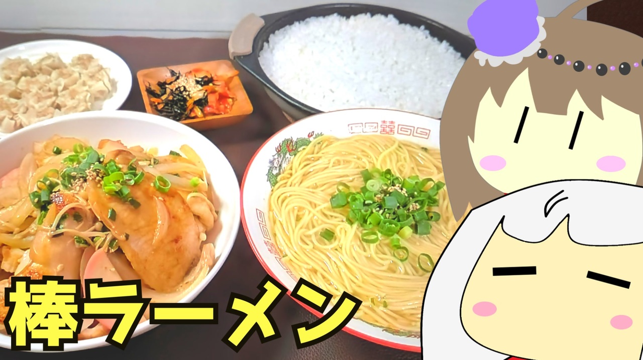 次→<a href="https://www.nicovideo.jp/watch/sm45819916" class="watch">sm45819916</a> (とんかつ+そぼろまぜそば+豚汁)<br><br>前→<a href="https://www.nicovideo.jp/watch/sm45807943" class="watch">sm45807943</a> (スパゲッティその4 わさビーフ手羽元ポテト)<br><br>どうも、私です。<br>特売の本場とんこつ塩コショウ棒ラーメンと、半額豚ロースと手羽元を生姜焼きにして食べるよ~<br>マイリス→<a href="https://www.nicovideo.jp/mylist/63910205" target="_blank" rel="noopener">mylist/63910205</a> (ラーメン食べ歩き日本一周 グルメ 車 その他)<br><br>~~~クレジット~~~<br>ボイスロイド・ソフトウェアトーク<br>VOICEROID2 : 紲星あかり<br>VOICEVOX: 冥鳴ひまり<br><br>YMM4 ゆっくりMovieMaker4<br><a href="https://manjubox.net/ymm4/" target="_blank" rel="noopener nofollow">https://manjubox.net/ymm4/</a><br><br>BGM<br>After-Five<br><a href="https://dova-s.jp/bgm/play22169.html" target="_blank" rel="noopener nofollow">https://dova-s.jp/bgm/play22169.html</a><br>ーーーーーーーーーーーー