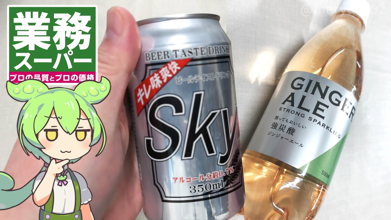 業務スーパーへ行ったら、シュッとした見た目の<br>ジンジャーエールを見つけました。<br>どうやら以前紹介した、皆様のお墨付きの<br>メロンソーダを作っている会社さんの自社製品のようです。<br>ちょっと気になり買ってみたのですが<br>せっかくなので、おすすめの飲み方にあった<br>ビールで割ってのむ方法も試してみることにしました。<br>Skyはビールではないのですが、どうなるでしょうか。<br><br><br><br>【関連動画】<br>トライアルで買った、みなさまのお墨付き<br>「ペットボトルのメロンソーダ(88円)」2025.12.15<br><a href="https://www.nicovideo.jp/watch/sm45728945" target="_blank" rel="noopener nofollow">https://www.nicovideo.jp/watch/sm45728945</a><br><br>【参考】<br>ローアルコールビール「SKY」※購入金額74円<br><a href="https://www.gyomusuper.jp/product/detail.php?go_id=27" target="_blank" rel="noopener nofollow">https://www.gyomusuper.jp/product/detail.php?go_id=27</a><br>株式会社 友桝飲料<br><a href="https://www.tomomasu.co.jp/" target="_blank" rel="noopener nofollow">https://www.tomomasu.co.jp/</a><br>ジンジャーエールの歴史:泡立つ物語の軌跡 2024.10.26(孝芳堂)<br><a href="https://www.drinkkohodo.com/blogs/column/241026" target="_blank" rel="noopener nofollow">https://www.drinkkohodo.com/blogs/column/241026</a><br><br>【使用した素材】(※敬称略) <br>(合成音声)VOICEVOX/ずんだもん/四国めたん<br><a href="https://voicevox.hiroshiba.jp/" target="_blank" rel="noopener nofollow">https://voicevox.hiroshiba.jp/</a> <br>(立ち絵)坂本アヒル<br> <a href="https://seiga.nicovideo.jp/seiga/im10788496" target="_blank" rel="noopener nofollow">https://seiga.nicovideo.jp/seiga/im10788496</a><br>(楽曲)甘茶の音楽工房/「楽しい麦畑」「フルーツパフェ」<br><a href="https://amachamusic.chagasi.com/" target="_blank" rel="noopener nofollow">https://amachamusic.chagasi.com/</a>