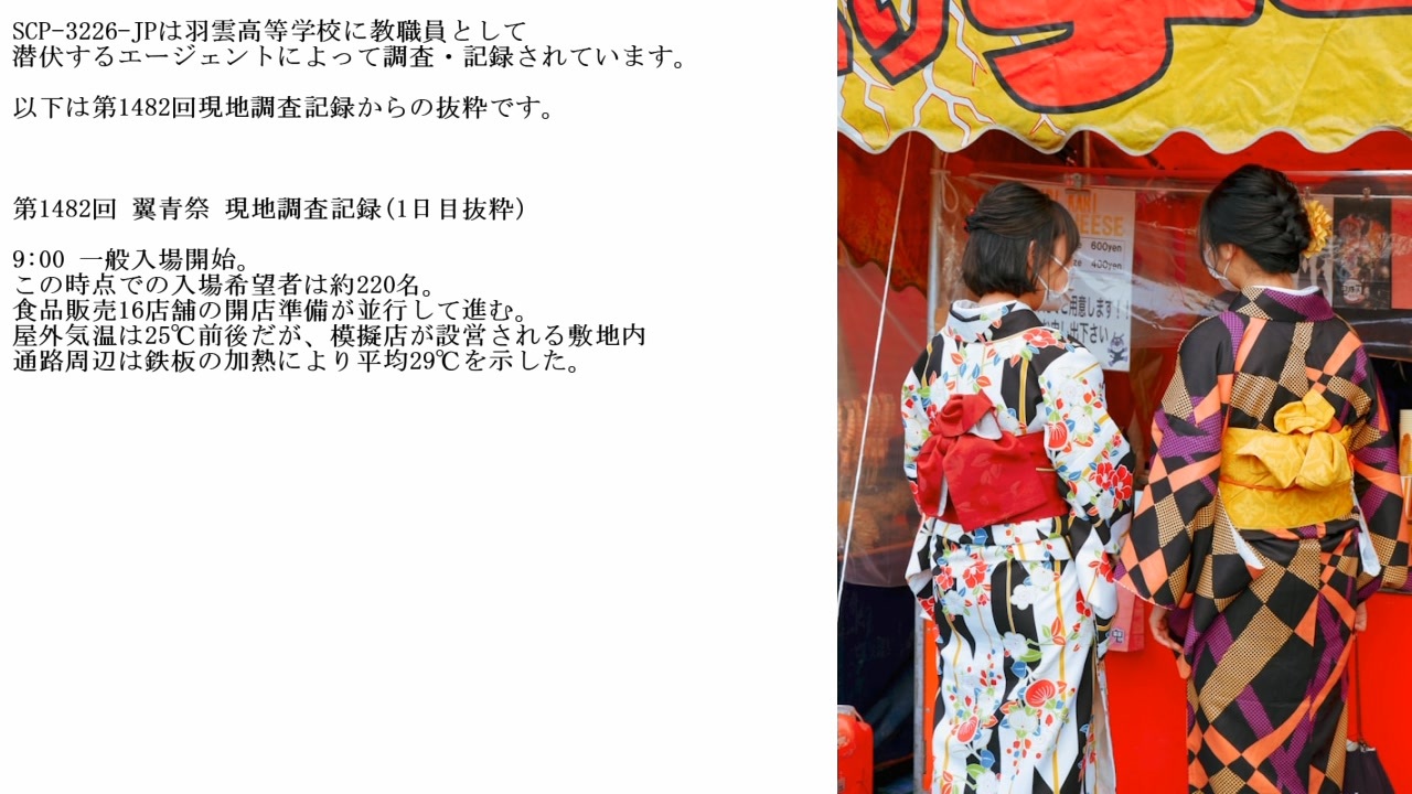 タイトル: SCP-3226-JP - 持続可能な文化祭<br>作者: eringiumexe<br>ソース: <a href="http://scp-jp.wikidot.com/scp-3226-jp" target="_blank" rel="noopener nofollow">http://scp-jp.wikidot.com/scp-3226-jp</a><br>ライセンス: CC BY-SA 3.0<br><br><br><br><span style="color: #000000; font-size: 14px;"><strong>夜鷹が鳴く頃に 見て欲しいもの入れ(創作物)</strong></span><br><span style="color: #006699; font-size: 14px;"><a href="https://www.nicovideo.jp/mylist/66904506" target="_blank" rel="noopener">mylist/66904506</a></span><br><span style="color: #000000; font-size: 14px;">(SCPシリーズ他まとめ)</span><br><br>youtubeアカウント<br><a href="https://www.youtube.com/@user-yq7os2gt6b" target="_blank" rel="noopener nofollow">https://www.youtube.com/@user-yq7os2gt6b</a><br><br>ウマ娘トレーナーID / 474456856<br><br>X / @MTzLFGalKimIJAZ