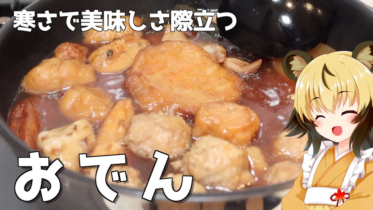 寒い冬にはあったかおでんで、身体も心も暖めませんか?<br><br>明けましておめでとうございます。<br>本当はふろふき大根を作る予定でしたが、たくさん食べて暖まりたいと思い、おでんに変更しました。<br>みなさんはどんな具材が好きですか?<br><br>■材料<br>・お出汁 1.5L<br>・しょうゆ 60mL<br>・みりん 60mL<br>・砂糖 約大さじ1<br>・お塩 小さじ1/3<br><br>ゆず味噌だれ<br>・味噌 大さじ2<br>・砂糖 大さじ1<br>・おでんの出汁<br><br><br>■所要時間<br>調理時間:120分程度<br><br><br>前回動画の同人誌で通販、電子版ご用意しました。<br>【Booth】<br>茶の本 普通煎茶・深蒸し煎茶編 | りおんの和風キッチン <br><a href="https://lycaonkitchen.booth.pm/items/7836538" target="_blank" rel="noopener nofollow">https://lycaonkitchen.booth.pm/items/7836538</a><br>電子版<br><a href="https://lycaonkitchen.booth.pm/items/7836546" target="_blank" rel="noopener nofollow">https://lycaonkitchen.booth.pm/items/7836546</a><br><br><br><br>ーーーーーーーーーーーーーーーー<br>音声:AI VOICE2紲星あかり<br>立ち絵:星華彩二魔さん<br>音源:DOVA-SYNDROME<br>イラスト:いらすとや<br>機材:Canon EOS R10<br>編集ソフト:Final Cut Pro<br>ーーーーーーーーーーーーーーーー<br><br>youtube:<a href="https://youtu.be/3N4ad9PZDJA" target="_blank" rel="noopener nofollow">https://youtu.be/3N4ad9PZDJA</a><br>X(旧:twitter):@lycaon_kitchen<br><br>りおんの和風喫茶:<a href="https://www.nicovideo.jp/series/77190" target="_blank" rel="noopener">series/77190</a><br>おつかれごはん:<a href="https://www.nicovideo.jp/series/155690" target="_blank" rel="noopener">series/155690</a><br>手作り和菓子でちょっとひとやすみしませんか?:<a href="https://www.nicovideo.jp/series/155691" target="_blank" rel="noopener">series/155691</a>