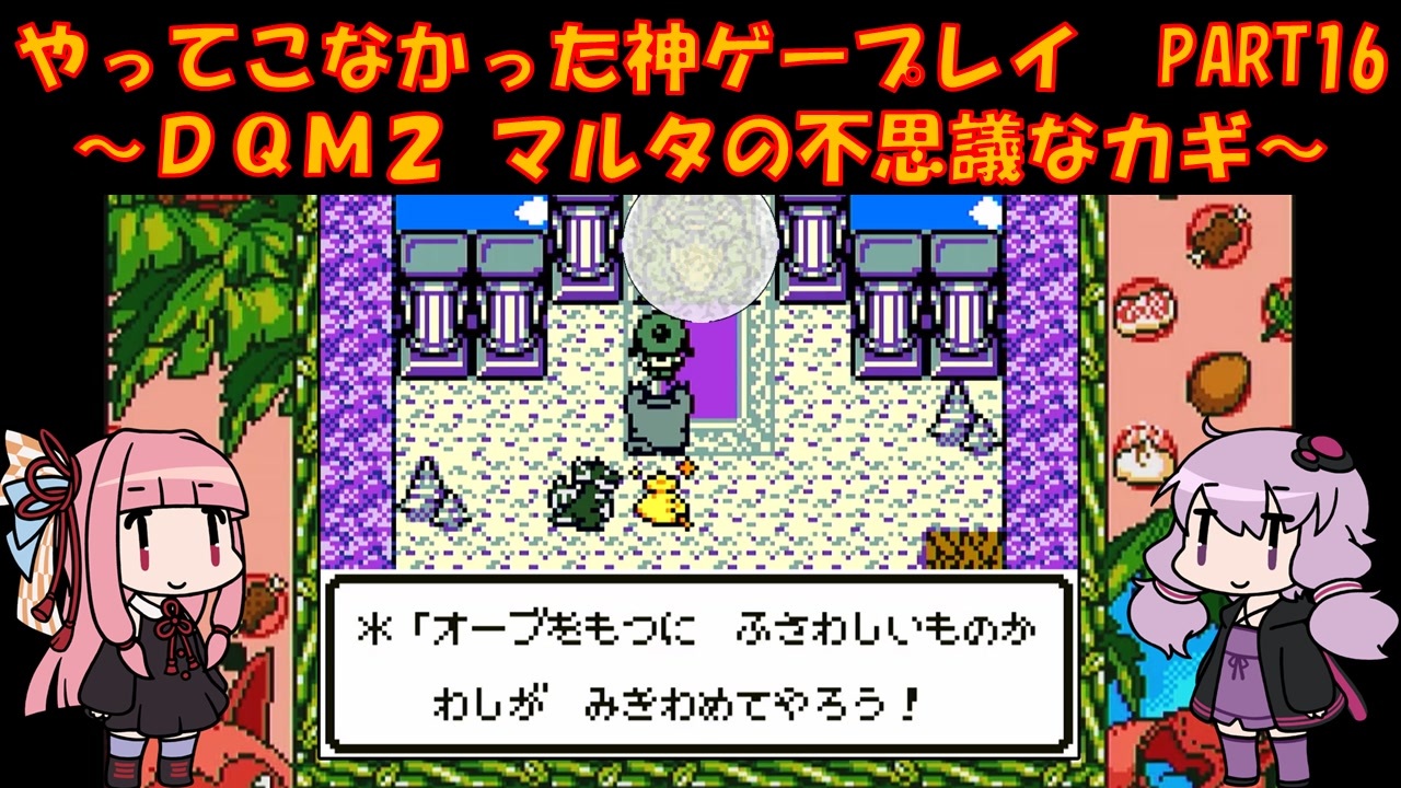 GBC ドラゴンクエストモンスターズ2 マルタの不思議なカギをプレイ<br>ゆかりさんはメジャーじゃないゲームをやる俺カッケー族だったのでドラクエをやったことがありませんでした(DSのⅤ以外)<br><br>茜:魔王ってお前かい!<br>ゆ:意外な人(?)選<br><br>PART1:<a href="https://www.nicovideo.jp/watch/sm45684209" target="_blank" rel="noopener nofollow">https://www.nicovideo.jp/watch/sm45684209</a><br><br>各DQシリーズ再生リスト<br><a href="https://garage.nicovideo.jp/niconico-garage/video/series/390298" target="_blank" rel="noopener nofollow">https://garage.nicovideo.jp/niconico-garage/video/series/390298</a><br><br><br>動画内で使用させていただいた素材<br>【イラスト】<br>結月ゆかり→山栗鼠様:<a href="https://seiga.nicovideo.jp/seiga/im5354179" target="_blank" rel="noopener nofollow">https://seiga.nicovideo.jp/seiga/im5354179</a><br>琴葉茜→山栗鼠様:<a href="https://seiga.nicovideo.jp/seiga/im5342445" target="_blank" rel="noopener nofollow">https://seiga.nicovideo.jp/seiga/im5342445</a><br><br>【音声】<br>A.I.Voice:琴葉茜<br><a href="https://aivoice.jp/product/kotonoha/" target="_blank" rel="noopener nofollow">https://aivoice.jp/product/kotonoha/</a><br><br>A.I.Voice:結月ゆかり<br><a href="https://aivoice.jp/product/yukari/" target="_blank" rel="noopener nofollow">https://aivoice.jp/product/yukari/</a><br><br>この動画で利用している株式会社スクウェア・エニックスを代表とする共同著作者が権利を所有する著作物及びスギヤマ工房有限会社が権利を所有する楽曲の転載・配布は禁止いたします。<br>© ARMOR PROJECT/BIRD STUDIO/SQUARE ENIX All Rights Reserved.<br>© SUGIYAMA KOBO