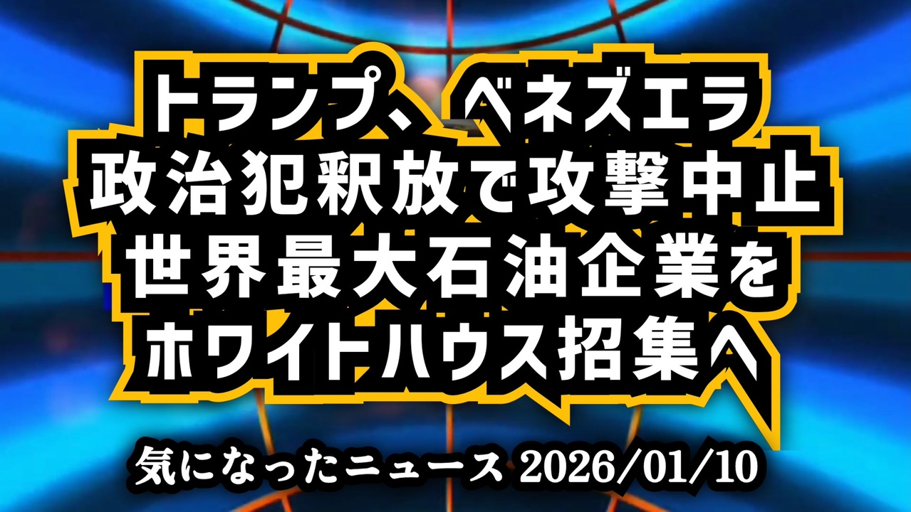 ◆トランプ大統領、ベネズエラ政治犯釈放で攻撃中止後、世界最大級石油企業をホワイトハウス招集へ<br><br>あらすじ<br>トランプ大統領は世界最大級の石油企業をホワイトハウスに招集し、ベネズエラ原油と長期的関係、安全保障を協議した。同時に政治犯釈放が現実化し、悪名高い収容所の閉鎖も進行。これを平和の意思表示として評価し、米国は二度目の軍事攻撃を中止した。石油価格引き下げ、麻薬対策、国境問題、米国経済を軸に、1000億ドル規模の投資と外交戦略が動き出している。<br><br>◆今回の台本&詳細<a href="https://keiichiro8140.hatenablog.com/entry/26011000111" target="_blank" rel="noopener nofollow">https://keiichiro8140.hatenablog.com/entry/26011000111</a><br><br>◆これまでの動画<a href="https://x.gd/sPXoJ" target="_blank" rel="noopener nofollow">https://x.gd/sPXoJ</a><br><br>◆もしも(BAN)の時のためのマイリンク集<a href="https://lit.link/K-16_News44" target="_blank" rel="noopener nofollow">https://lit.link/K-16_News44</a><br><br>ご覧いただきありがとうございます<br>m(_ _)m<br><br>気になったニュース 2026/01/10<br><br />著作権、肖像権に配慮して作成しております。<br><br>◆気になったニュースの台本!?<br>メモ代わりに作った台本をそのままあげてます<br><a href="https://keiichiro8140.hatenablog.com/." target="_blank" rel="noopener nofollow">https://keiichiro8140.hatenablog.com/.</a><br><br><br>ここからはシリーズ紹介<br><br><br>◆ ワクチン解毒・デトックス<br><a href="https://x.gd/fZweg" target="_blank" rel="noopener nofollow">https://x.gd/fZweg</a><br><br>◆ウイリアム・マキス博士のがん治療(イベルメクチン・フェンベンダゾール等)<br><a href="https://x.gd/AtFYS" target="_blank" rel="noopener nofollow">https://x.gd/AtFYS</a><br><br>◆予防接種健康被害救済制度<br><a href="https://x.gd/0xK9x" target="_blank" rel="noopener nofollow">https://x.gd/0xK9x</a><br><br>◆気になったニュース #1501~<br><br>◆ 【ショートver】気になったニュース<br><a href="https://x.gd/7MxXC" target="_blank" rel="noopener nofollow">https://x.gd/7MxXC</a><br><br>◆ 気になったニュース #1001~<br><a href="https://x.gd/Lp8gv" target="_blank" rel="noopener nofollow">https://x.gd/Lp8gv</a><br><br>◆ 気になったニュース #501~<br><a href="https://x.gd/EmbS4" target="_blank" rel="noopener nofollow">https://x.gd/EmbS4</a><br><br>◆ 気になったニュース #1~#500<br><a href="https://x.gd/uPhNb" target="_blank" rel="noopener nofollow">https://x.gd/uPhNb</a><br><br>◆ X(旧Twitter)・テレグラムで気になった情報<br><a href="https://x.gd/YG6FT" target="_blank" rel="noopener nofollow">https://x.gd/YG6FT</a><br><br>◆ 日比谷5万人パレードデ⚪生放送アーカイブ動画<br><a href="https://x.gd/3CHJv" target="_blank" rel="noopener nofollow">https://x.gd/3CHJv</a><br><br>◆日比谷5万人パレード⚪モのマイリスト作ってみました<br><a href="https://nico.ms/mylist/76828848?ref=sp_other" target="_blank" rel="noopener nofollow">https://nico.ms/mylist/76828848?ref=sp_other</a><br><br>◆3.30 令和の百姓⚪⚪<br><a href="https://www.nicovideo.jp/series/511791?ref=garage_share_other" target="_blank" rel="noopener nofollow">https://www.nicovideo.jp/series/511791?ref=garage_share_other</a><br><br>◆ 及川幸久さんの【XNEWS】シリーズ<br><a href="https://x.gd/3k78K" target="_blank" rel="noopener nofollow">https://x.gd/3k78K</a><br><br>◆これまでの動画<a href="https://x.gd/sPXoJ" target="_blank" rel="noopener nofollow">https://x.gd/sPXoJ</a><br><br>◆もしも(BAN)の時のためのマイリンク集<a href="https://lit.link/K-16_News44" target="_blank" rel="noopener nofollow">https://lit.link/K-16_News44</a><br><br>