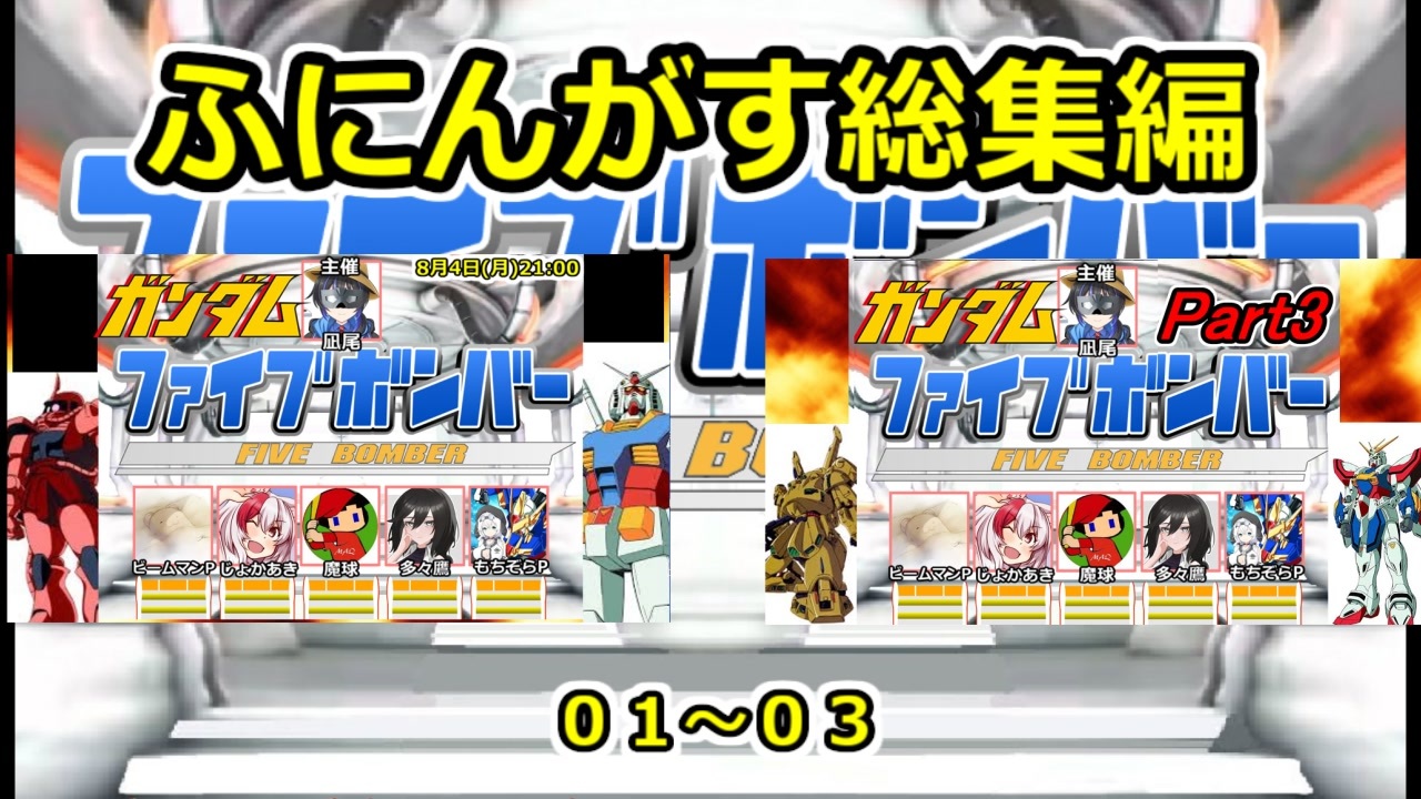 <a href="#" class="seekTime" data-seekTime="00:00" onclick="seekNicoPlayer('#00:00'); return false;">#00:00</a> #01 Part1<br><a href="#" class="seekTime" data-seekTime="10:42" onclick="seekNicoPlayer('#10:42'); return false;">#10:42</a> #02 Part2<br><a href="#" class="seekTime" data-seekTime="20:13" onclick="seekNicoPlayer('#20:13'); return false;">#20:13</a> #03 Part3 <br><br>ボイロ・CeVIO実況者をメインとした宇宙人狼ゲーム「Among Us」の大規模コラボの「ふにんがす」<br>そのグループで開催した「ファイブボンバー」のガンダム縛りの動画です<br>01~03をまとめました。<br><br>YouTube高画質版:<a href="https://youtu.be/kvxznDn7k5U" target="_blank" rel="noopener nofollow">https://youtu.be/kvxznDn7k5U</a><br>Twitter:<a href="https://twitter.com/naoreisen" target="_blank" rel="noopener nofollow">https://twitter.com/naoreisen</a><br><br>前回 ガーティックフォン:半分ダチョウガンタンクマン編:<a href="https://www.nicovideo.jp/watch/sm45714157" class="watch">sm45714157</a><br>前回 カービィのエアライダー:伝説マシンを使いこなせ編:<a href="https://www.nicovideo.jp/watch/sm45690903" class="watch">sm45690903</a><br>前回 ふにんがす:AmongUs:爆弾100個投下編:<a href="https://www.nicovideo.jp/watch/sm45677425" class="watch">sm45677425</a><br>前回 タルコフ:億万長者になったずんだもん編:<a href="https://www.nicovideo.jp/watch/sm45652454" class="watch">sm45652454</a><br>前回 ふにんがすR.E.P.O.:VS新モンスター編:<a href="https://www.nicovideo.jp/watch/sm45628340" class="watch">sm45628340</a><br>前回 ふにんがすヒューマンフォールフラット:バグの世界へようこそ編:<a href="https://www.nicovideo.jp/watch/sm45603645" class="watch">sm45603645</a><br>前回 GTA5カオス磯野モード:墓場で大乱闘編:<a href="https://www.nicovideo.jp/watch/sm45550577" class="watch">sm45550577</a><br>前回 GTA5:夏休み編2025:最終回:<a href="https://www.nicovideo.jp/watch/sm45480486" class="watch">sm45480486</a><br>前回 第二回ふにんがすガンダムファイブボンバーPart1:<a href="https://www.nicovideo.jp/watch/sm45399922" class="watch">sm45399922</a><br>前回 パーティアニマルズ:イタズラ妨害狸編:<a href="https://www.nicovideo.jp/watch/sm45113701" class="watch">sm45113701</a><br>前回 凪尾クラフト:トライアルチャンバー編:<a href="https://www.nicovideo.jp/watch/sm44573824" class="watch">sm44573824</a><br>前回 猫ミームブラック企業動画:<a href="https://www.nicovideo.jp/watch/sm43364794" class="watch">sm43364794</a><br><br><br><br />ふにんがす動画マイリスト <a href="https://www.nicovideo.jp/mylist/71314393" target="_blank" rel="noopener">mylist/71314393</a><br>GTA5手配度MAXシリーズ <a href="https://www.nicovideo.jp/mylist/18374381" target="_blank" rel="noopener">mylist/18374381</a><br><br>【凪尾マイクラ等サーバー参加方法】<br>ニコニコ凪尾チャンネル・クリエイターサポート加入者・NicoFTパス所持者 YouTubeメンバーシップゴールド以上の方々が参加できます! 分からないことがあったら気軽に質問してください!<br>ニコニコチャンネル<br><a href="https://ch.nicovideo.jp/nagio-gta?ref=pc_mypage_top" target="_blank" rel="noopener nofollow">https://ch.nicovideo.jp/nagio-gta?ref=pc_mypage_top</a><br>※会員限定動画はニコニコチャンネル加入者・YouTubeメンバーシップノーマル以上から視聴できます。<br><br>■超会議2025グッズ通販(pixivBooth)<br><a href="https://nagio-gta25252.booth.pm/" target="_blank" rel="noopener nofollow">https://nagio-gta25252.booth.pm/</a><br>■ずんだもん立ち絵公開しました<br><a href="http://nico.ms/im10892141" target="_blank" rel="noopener nofollow">http://nico.ms/im10892141</a><br>■琴葉姉妹立ち絵公開しました<br><a href="https://seiga.nicovideo.jp/seiga/im10803182" target="_blank" rel="noopener nofollow">https://seiga.nicovideo.jp/seiga/im10803182</a><br><br>楽曲提供:ぺんぺんさん:<a href="https://www.nicovideo.jp/user/93911302" target="_blank" rel="noopener">user/93911302</a><br>ふにちかさん作凪尾立ち絵:<a href="https://seiga.nicovideo.jp/seiga/im10956602?nicorepotwitter_upload_illust" target="_blank" rel="noopener nofollow">https://seiga.nicovideo.jp/seiga/im10956602?nicorepotwitter_upload_illust</a><br><br>▼以下配信活動ページ:よかったら登録してね!<br>ニコ生<br><a href="https://www.nicovideo.jp/user/2620730/live_programs?ref=pc_userpage_menu" target="_blank" rel="noopener nofollow">https://www.nicovideo.jp/user/2620730/live_programs?ref=pc_userpage_menu</a><br>YouTubeiS4mQ7q8w?sub_confirmation=1<br>Twitch:<a href="https://www.twitch.tv/nagiogames" target="_blank" rel="noopener nofollow">https://www.twitch.tv/nagiogames</a><br>ツイキャス:<a href="https://twitcasting.tv/g:106250988999788152314" target="_blank" rel="noopener nofollow">https://twitcasting.tv/g:106250988999788152314</a><br><br>VOICEVOX:ずんだもん VOICEVOX:九州そら