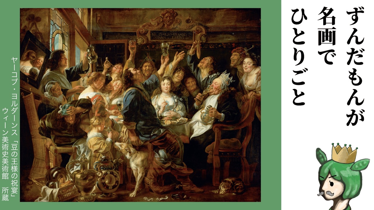 ガレット・デ・ロワ力試し祭(<a href="https://www.nicovideo.jp/watch/sm45537688" class="watch">sm45537688</a>)参加作品<br>料理は出来ないので名画鑑賞で力試しです。状況から見てガレット・デ・ロワが描かれてる(はず)。<br><br>作品 ヤーコブ・ヨルダーンス「豆の王様の祝宴」<br>画像引用元 <a href="https://commons.wikimedia.org/wiki/File:Jacob_Jordaens_-_The_Feast_of_the_Bean_King_-_Google_Art_Project.jpg" target="_blank" rel="noopener nofollow">https://commons.wikimedia.org/wiki/File:Jacob_Jordaens_-_The_Feast_of_the_Bean_King_-_Google_Art_Project.jpg</a><br>語り WEB版voicevoxずんだもん<br>BGM <a href="https://commons.nicovideo.jp/works/nc222381" target="_blank" rel="noopener">nc222381</a><br>