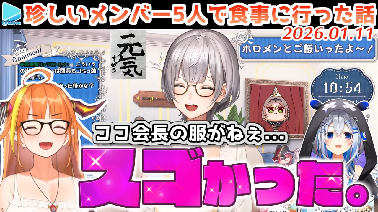 <a href="#" class="seekTime" data-seekTime="00:00" onclick="seekNicoPlayer('#00:00'); return false;">#00:00</a> ホロメン5人で食事に行った話<br><a href="#" class="seekTime" data-seekTime="01:57" onclick="seekNicoPlayer('#01:57'); return false;">#01:57</a> 会長の服がすごい<br><a href="#" class="seekTime" data-seekTime="04:05" onclick="seekNicoPlayer('#04:05'); return false;">#04:05</a> レストラン内での話<br><a href="#" class="seekTime" data-seekTime="06:07" onclick="seekNicoPlayer('#06:07'); return false;">#06:07</a> PayPay<br><a href="#" class="seekTime" data-seekTime="07:34" onclick="seekNicoPlayer('#07:34'); return false;">#07:34</a> 機材フリマの話<br><a href="#" class="seekTime" data-seekTime="08:34" onclick="seekNicoPlayer('#08:34'); return false;">#08:34</a> グランメゾン東京?<br><a href="#" class="seekTime" data-seekTime="09:11" onclick="seekNicoPlayer('#09:11'); return false;">#09:11</a> リボ払い杞憂へい民<br><br>元動画様はこちら<br>【朝活雑談】来週は三期生ライブ!今週はホロメンとごはんにもいったよ~✨【白銀ノエル/ホロライブ】<br><a href="https://youtu.be/HPOBRgxyDFY" target="_blank" rel="noopener nofollow">https://youtu.be/HPOBRgxyDFY</a><br><br>Noel Ch. 白銀ノエル <a href="https://www.youtube.com/@ShiroganeNoel" target="_blank" rel="noopener nofollow">https://www.youtube.com/@ShiroganeNoel</a><br>Kanata Ch. 天音かなた <a href="https://www.youtube.com/@AmaneKanata" target="_blank" rel="noopener nofollow">https://www.youtube.com/@AmaneKanata</a><br>Coco Ch. 桐生ココ <a href="https://www.youtube.com/channel/UCS9uQI-jC3DE0L4IpXyvr6w" target="_blank" rel="noopener nofollow">https://www.youtube.com/channel/UCS9uQI-jC3DE0L4IpXyvr6w</a><br>アキロゼCh。 <a href="https://www.youtube.com/@AkiRosenthal" target="_blank" rel="noopener nofollow">https://www.youtube.com/@AkiRosenthal</a><br>Choco Ch. 癒月ちょこ <a href="https://www.youtube.com/@YuzukiChoco" target="_blank" rel="noopener nofollow">https://www.youtube.com/@YuzukiChoco</a><br /><span style="color: #b7b7b7; font-size: 10px;">ホロライブ切り抜き/なめたけ <a href="https://t.co/CBwJLnYR2c" target="_blank" rel="noopener nofollow">https://t.co/CBwJLnYR2c</a></span>
