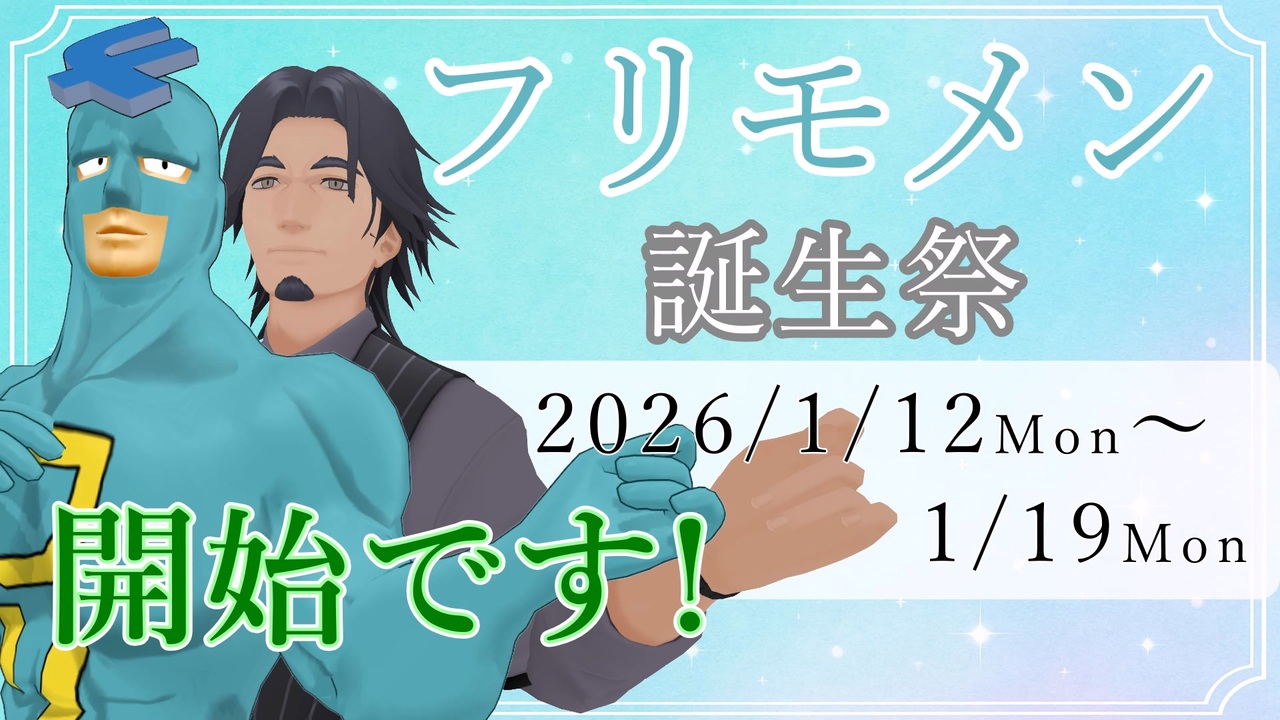 今日から開始だぞ!!!!<br>フリモメンのTwitter X!アカウント :<br><a href="https://x.com/frimomen" target="_blank" rel="noopener nofollow">https://x.com/frimomen</a><br><br><span style="font-size: 16px;">日時:2026年1月12日(月)~19日(月) </span><br><br>・お題はフリモメンに関するものなら何でもOK <br> <span style="font-size: 16px;"><strong>フリモメン誕生祭2026</strong></span><br>をタグロックしてくれ!<br>また誕生祭向けに素材作成いただいた方はよければ<br><span style="font-size: 16px;"><strong> フリモメン誕生祭2026前夜祭</strong></span><br>をタグロックしてくれると助かる!<br><br>例として、以下のようなジャンルを想定<br><br>投稿ジャンル1,フリモメンキャラ動画 (フリモメンが出てくる動画ならなんでも)<br>投稿ジャンル2,フリモメシ(青い食品、料理) <br>投稿ジャンル3,フリモソング(Synthesizer Vなどを使ったおうたの動画)<br>投稿ジャンル4,なりきりフリモメン(フリモメンTシャツでも全身タイツでもなんでもかんでも)<br>投稿ジャンル5,タオルの人(タカスィー)部門 (タオルの人(タカスィー)が出るならなんでも)<br>投稿ジャンル6,フリモアート (モメンズアート、支援絵などなど、静画にお願いします)<br><br><span style="font-size: 16px;">☆タオルの人の素材作成いただいています!!!!</span><br>九段はくりさん :<br><a href="https://seiga.nicovideo.jp/seiga/im11680394" target="_blank" rel="noopener nofollow">https://seiga.nicovideo.jp/seiga/im11680394</a><br>一ツ目西瓜さん:<br><a href="https://seiga.nicovideo.jp/seiga/im11680769" target="_blank" rel="noopener nofollow">https://seiga.nicovideo.jp/seiga/im11680769</a><br><br>なお、再生数がいちばん多かった方にパッケージ版voicepeakプリモメンをプレゼント<br><br>どしどし投稿待ってるぜ! <br><br>禁止事項 :<br>・著しく公序良俗に反するもの(基本的には大丈夫なはずです)<br>・ニコニ広告以外で、外部の業者などによる再生数増加行為を行うこと<br> (主催が勝手に失格などの判断はしませんが、SNSで判断を仰ぐ可能性はあります)<br><br>主催:<br><a href="https://twitter.com/nanashinico1" target="_blank" rel="noopener nofollow">https://twitter.com/nanashinico1</a><br><a href="https://bsky.app/profile/nanashinico1.bsky.social" target="_blank" rel="noopener nofollow">https://bsky.app/profile/nanashinico1.bsky.social</a><br>